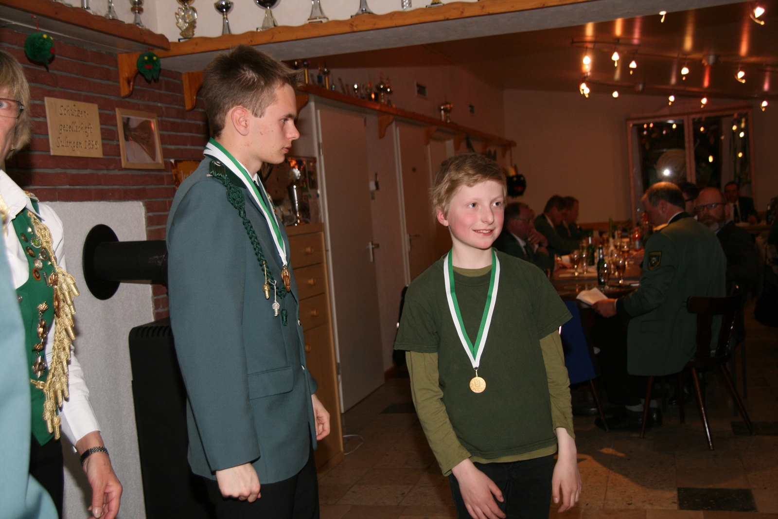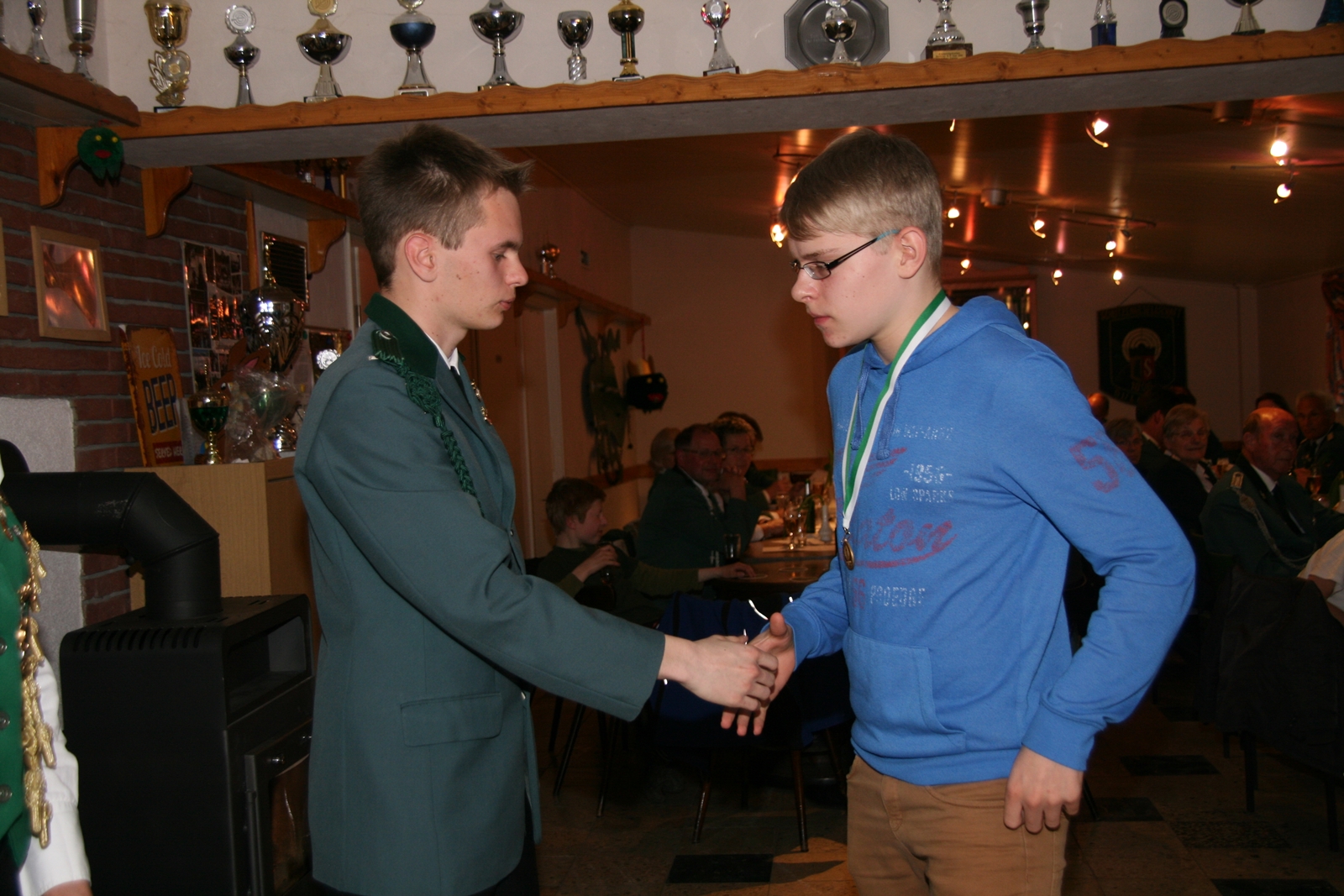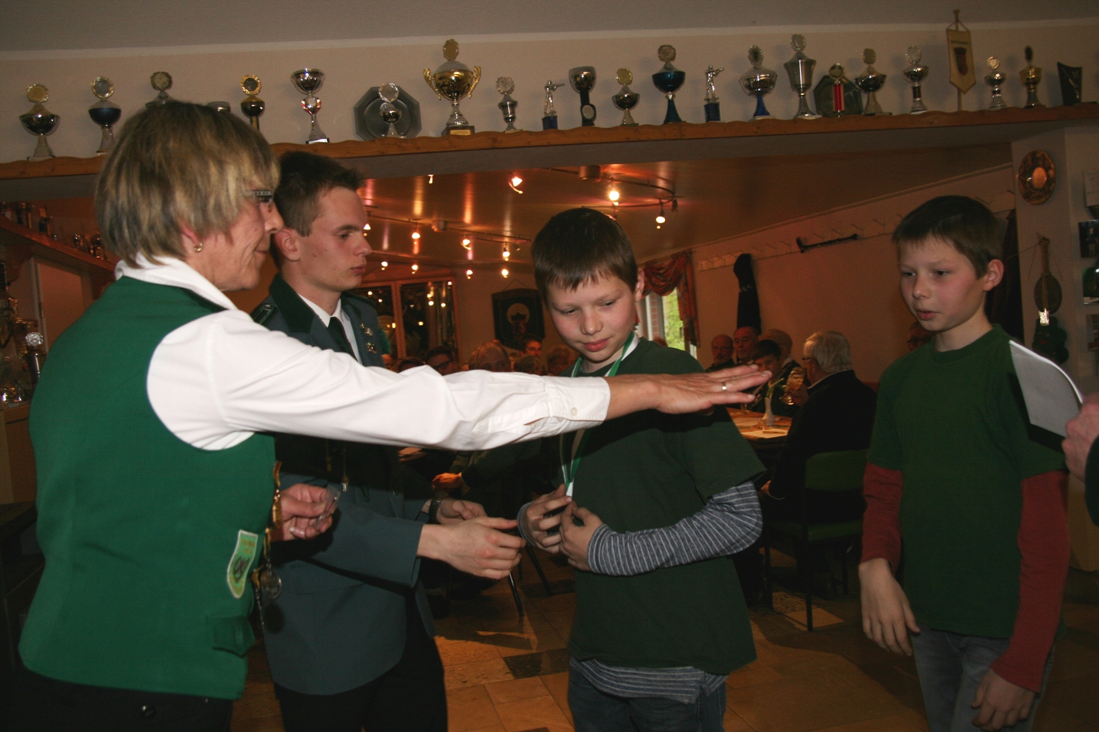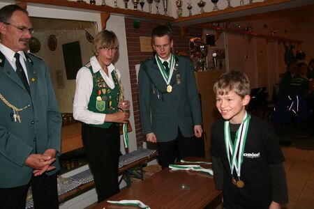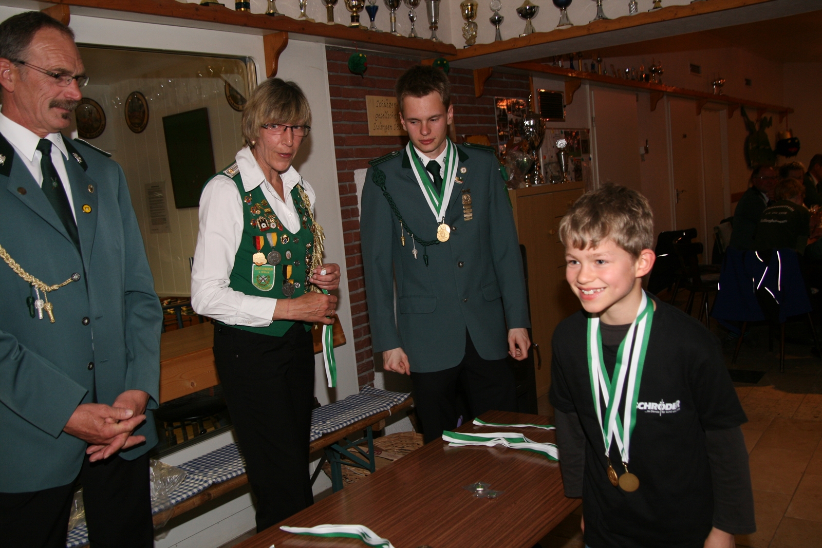 Die Siegerehrung der Jugendlichen wurde von der Sportleitung durchgeführt. Jonas Ehlers, Sabine Prochazka und Udo Jaschkowske vergaben an die von Udo Bolte verlesenen Sieger der Kreismeisterschaft und des Rundenwettkampfes Luftgewehr Auflage, Medaillen und Nadeln.