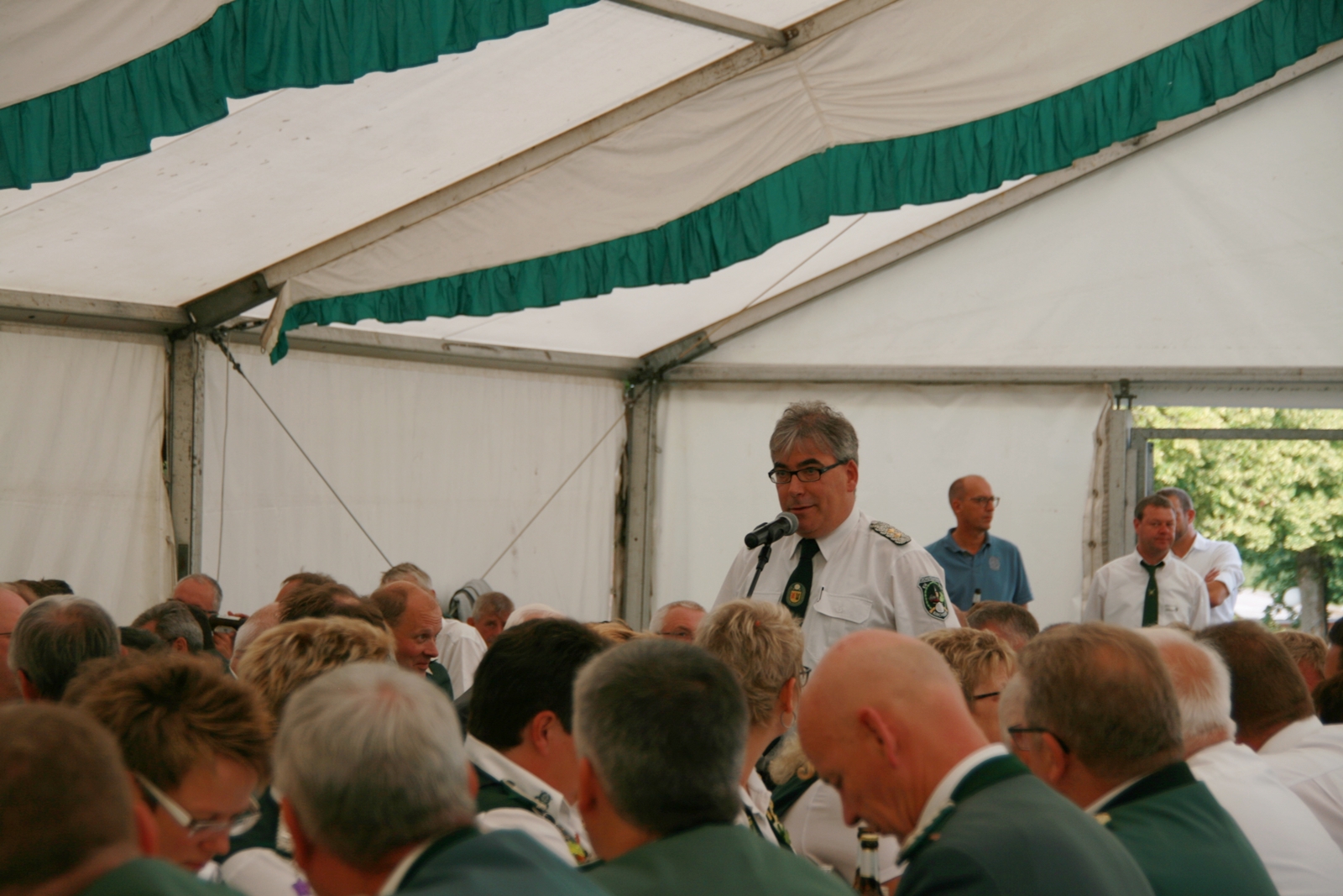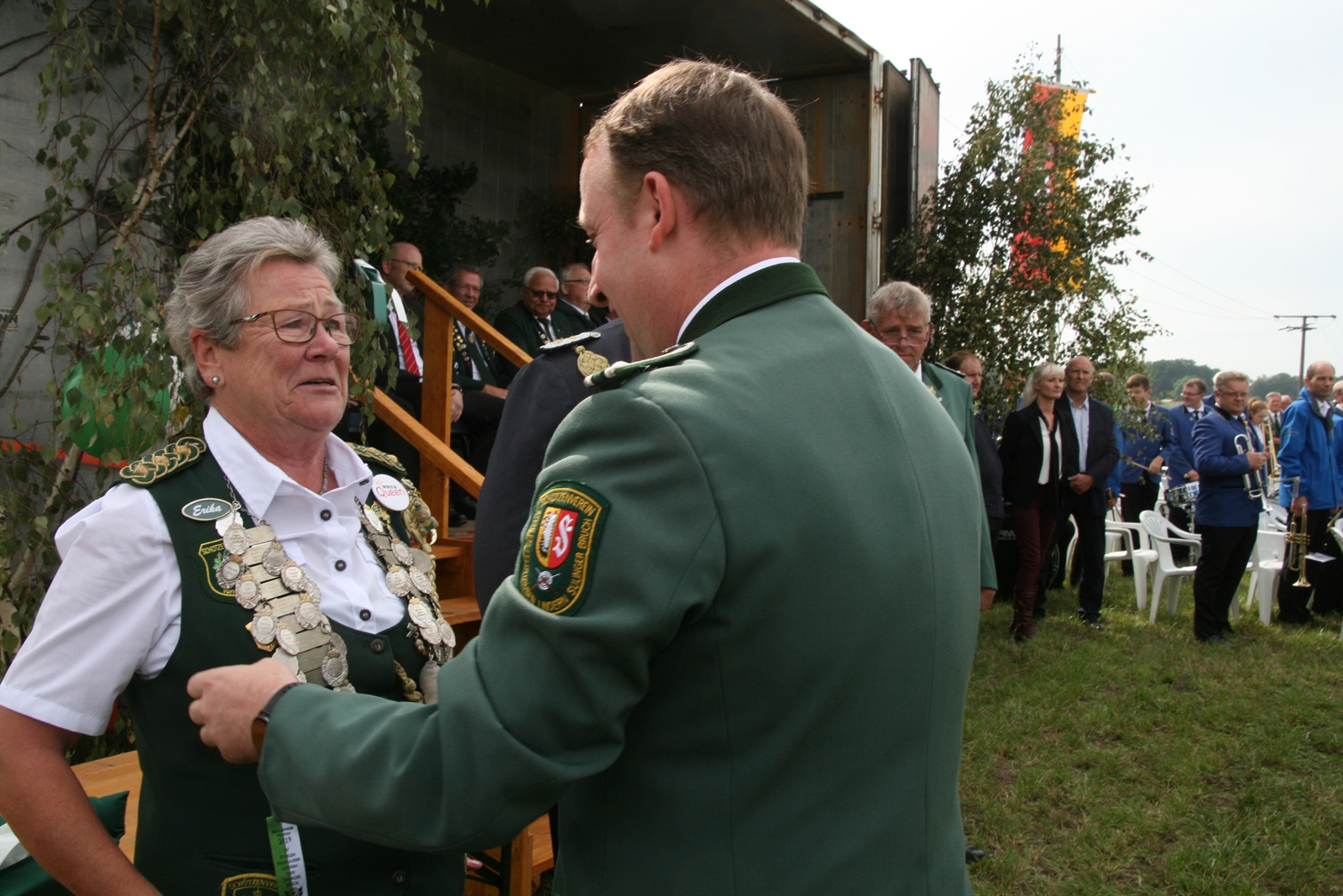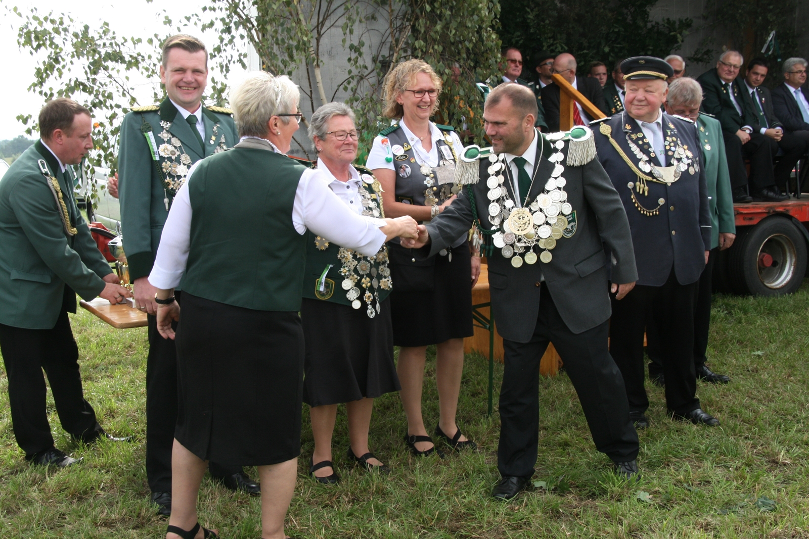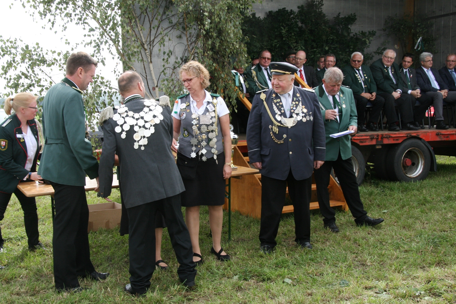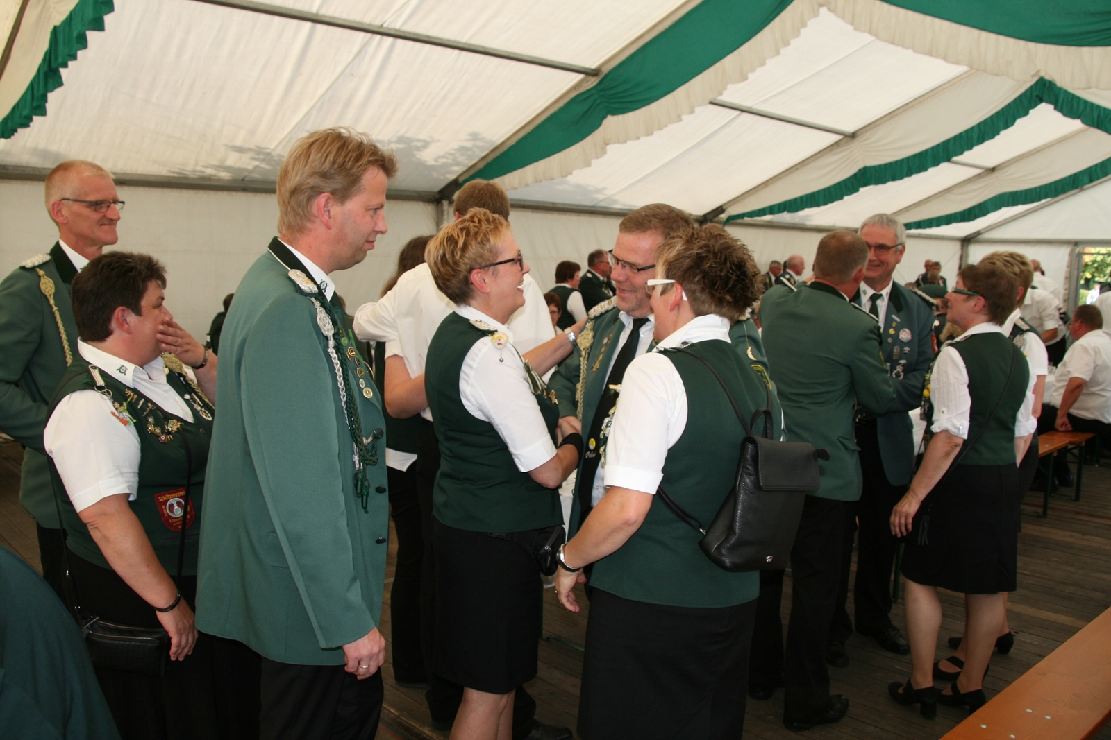 Präsident Wilhelm Mohrmann begrüßte alle Schützen und Gäste recht herzlich. Das 60. Kreiskönigstreffen (KKT) im Altkreis Diepholz ausrichten zu können, habe ihm und seinen Helfern viel Spaß gemacht. Zur Erinnerung: das 1. KKT habe 1959 beim Schützenverein von 1848 Sulingen stattgefunden - mit 18 Vereinen samt Königen (noch ohne Schießwettbewerbe, die fanden erst beim 2. KKT in Barnstorf ihren Anfang). Sein besonderer Dank ging an alle die unterstützt und geholfen haben dieses Fest auszurichten. Bei seinen Grußworten lobte Ortsbürgermeister Erich Schlamann die funktionierenden Gemeinschaft, die vielen Helfer aus den Ortschaften/Vereinen der Gemeinde Lindern. "Wir sind stolz Gastgeber dieser Veranstaltung zu sein und wünsche allen Anwesenden einen schönen Tag in Lindern". Dirk Rauschkolb, Bürgermeister der Stadt Sulingen faste seine Grußworte in "Lindern kann Kreiskönigstreffen" zusammen. Die Glückwünsche des Landkreises überbrachte der stellvertretende Landrat Volker Meyer, dabei lobte er das ehrenamtliche Engagement der Vereine. Seinen Respekt sprach MdB Axel Knöerig der kleinen Ortschaft Lindern aus, der Einwohnerzahl von 550 stehe an diesem Tag die Gästezahl von über 2500 gegenüber. MdL Marcel Scharrelmann, auch Schütze, erinnerte daran, das die Schützenvereine das Leben auf dem Lande prägen, dazu Geselligkeit, Gemeinschaft und Tradition pflegen. Bezirkspräsident Karl-Friedrich Scharrelmann überbrachte die besten Grüße des Bezirks-Schützenverbandes Grafschaft Diepholz, "ich freue mich, dass ich hier sein darf. Lade eure Majestäten zum Bezirkskönigsball am 19. Oktober nach Varrel ins Gasthaus Hartje ein - feiert schön - Dankeschön". Seine kurzen Grußworte wurden mit großem Applaus bedacht. Wilhelm Mohrmann danke allen für die Wortbeiträge.