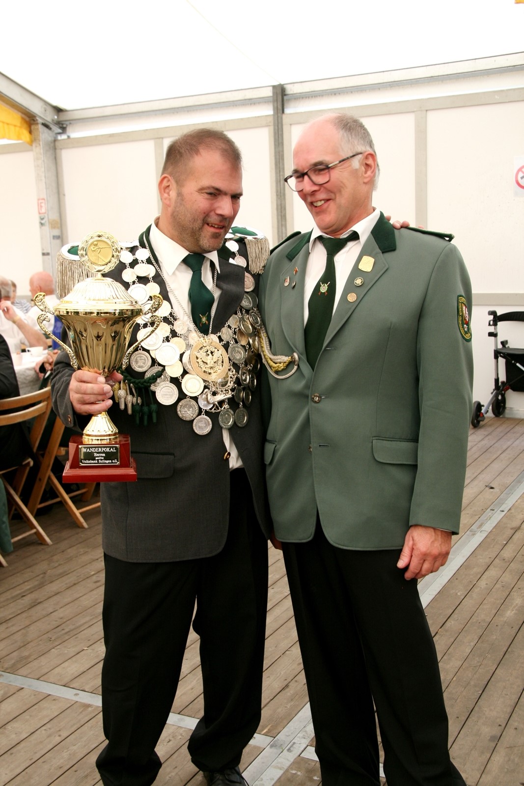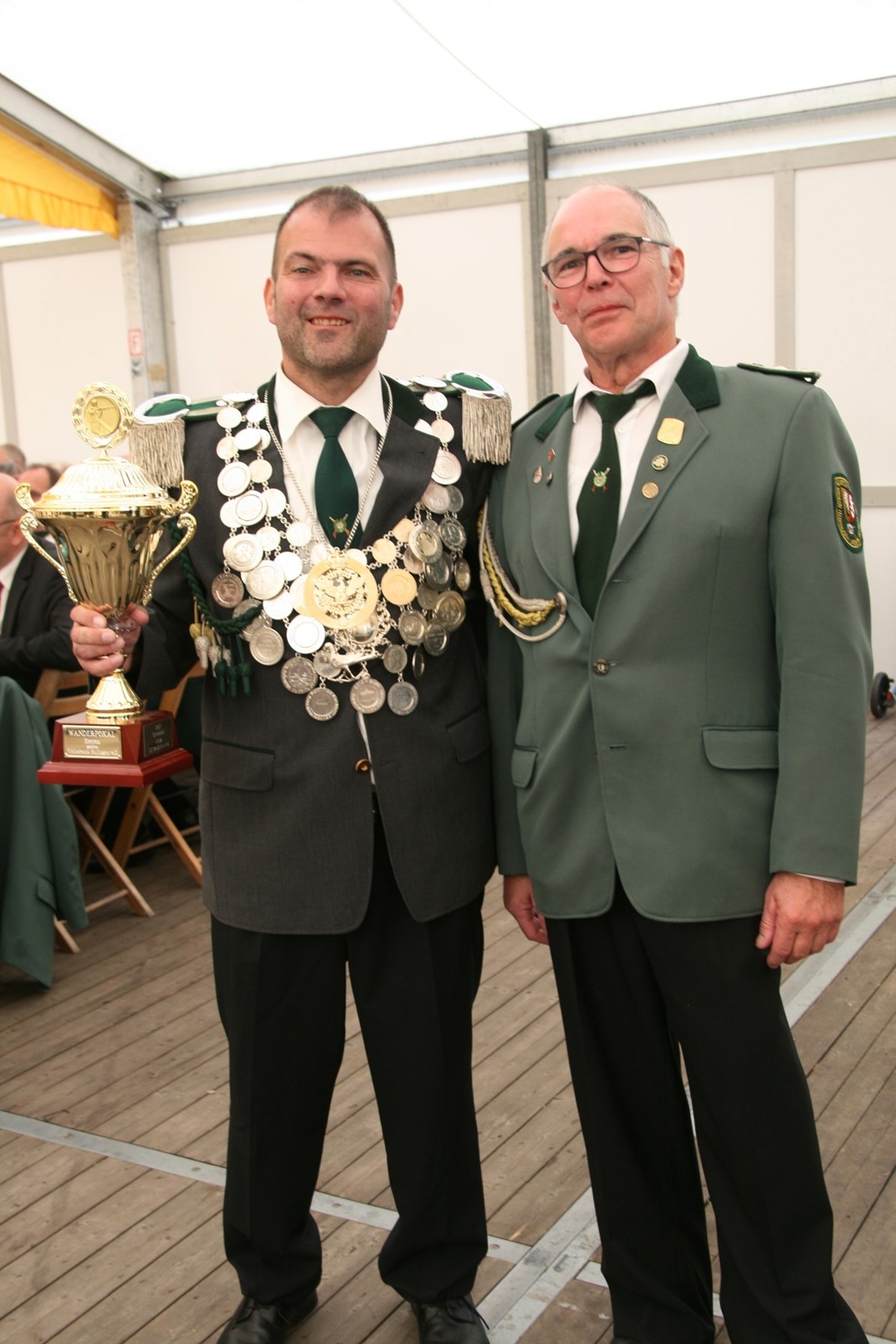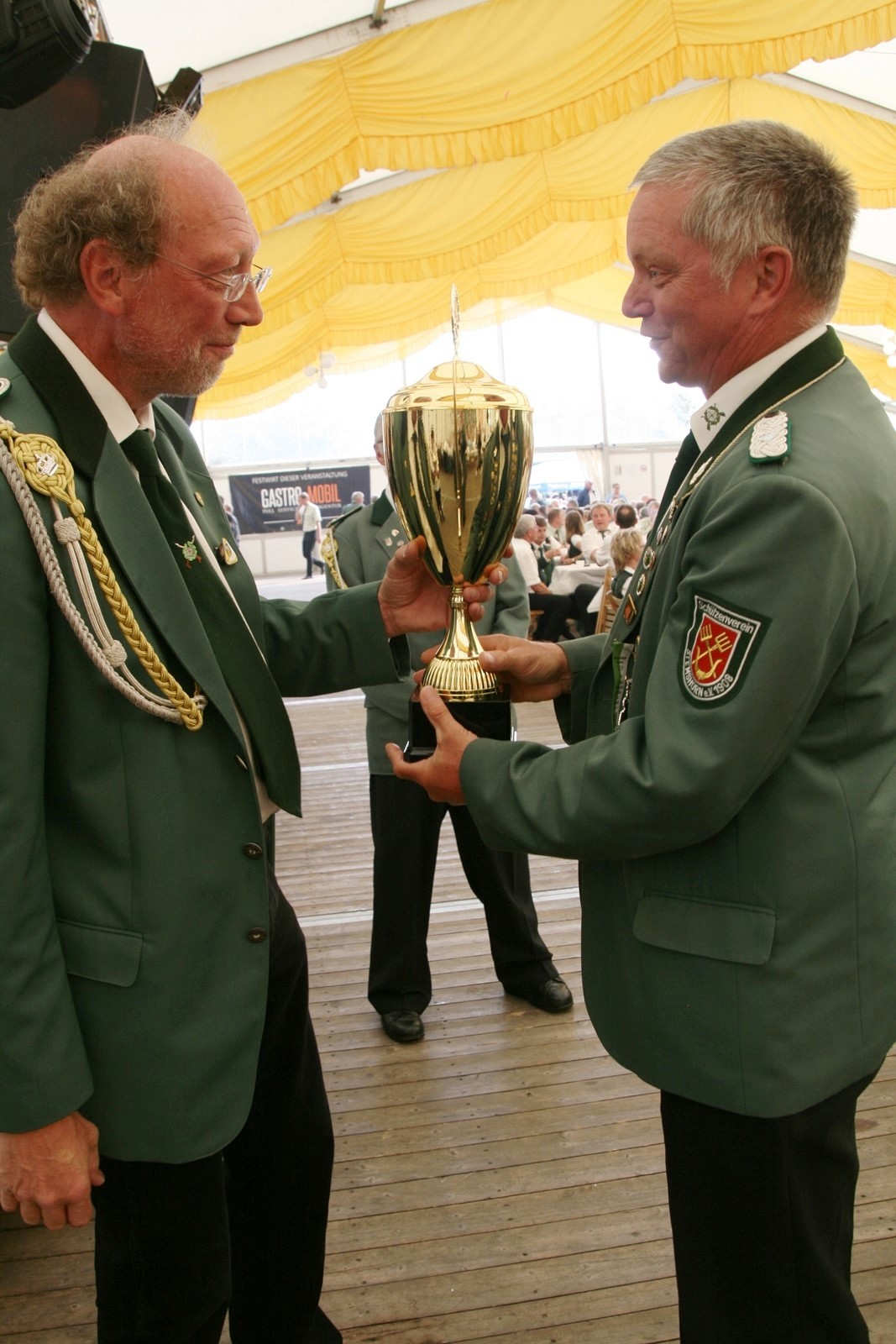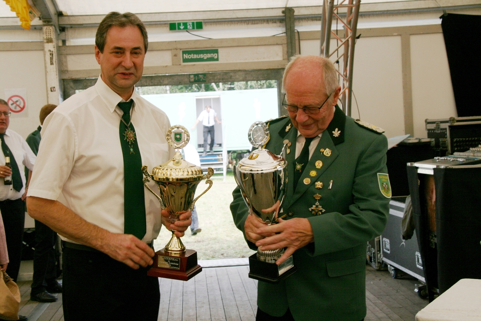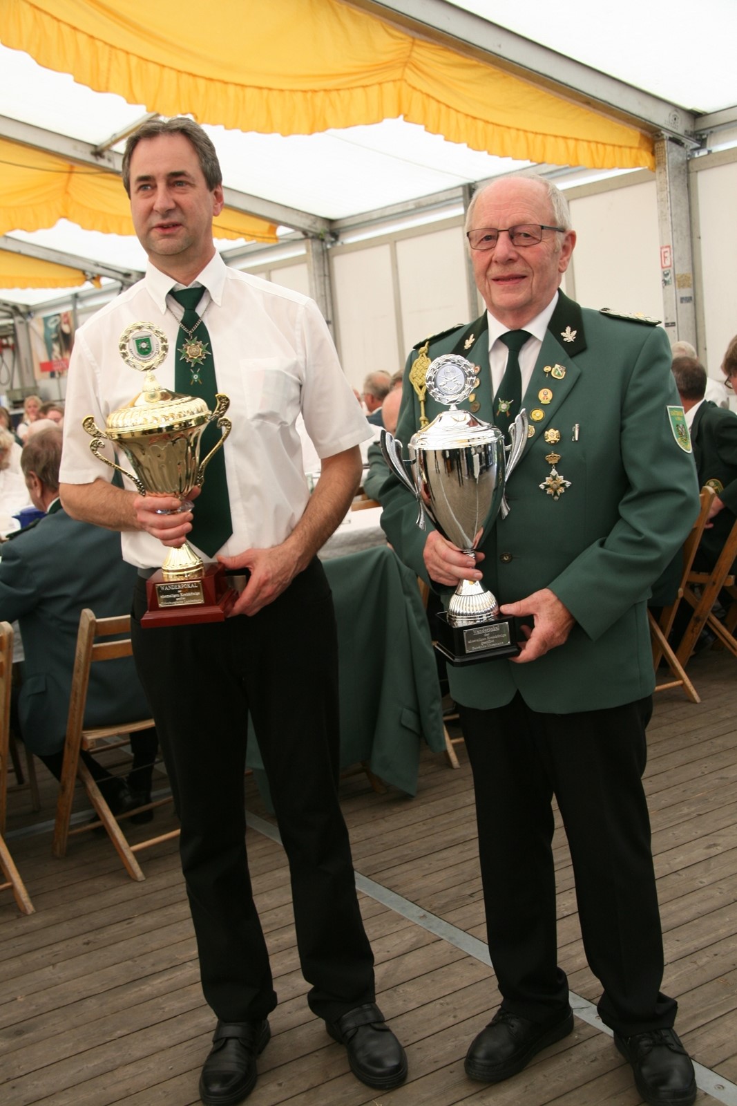 Den neuen Wanderpokal der ehemaligen Kreiskönige errang Helmut Riedemann von SV Blockwinkel (rechts), Rüdiger Jahn vom SV Rehden ( links) erhielt den vorherigen Pokal, da er diesen am häufigsten Gewonnen hatte.