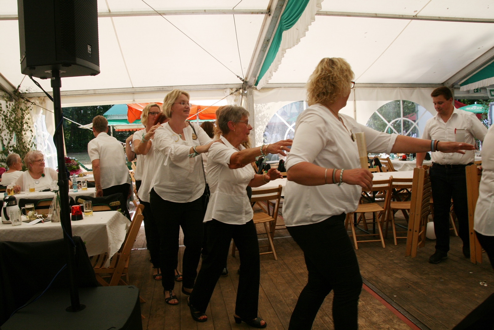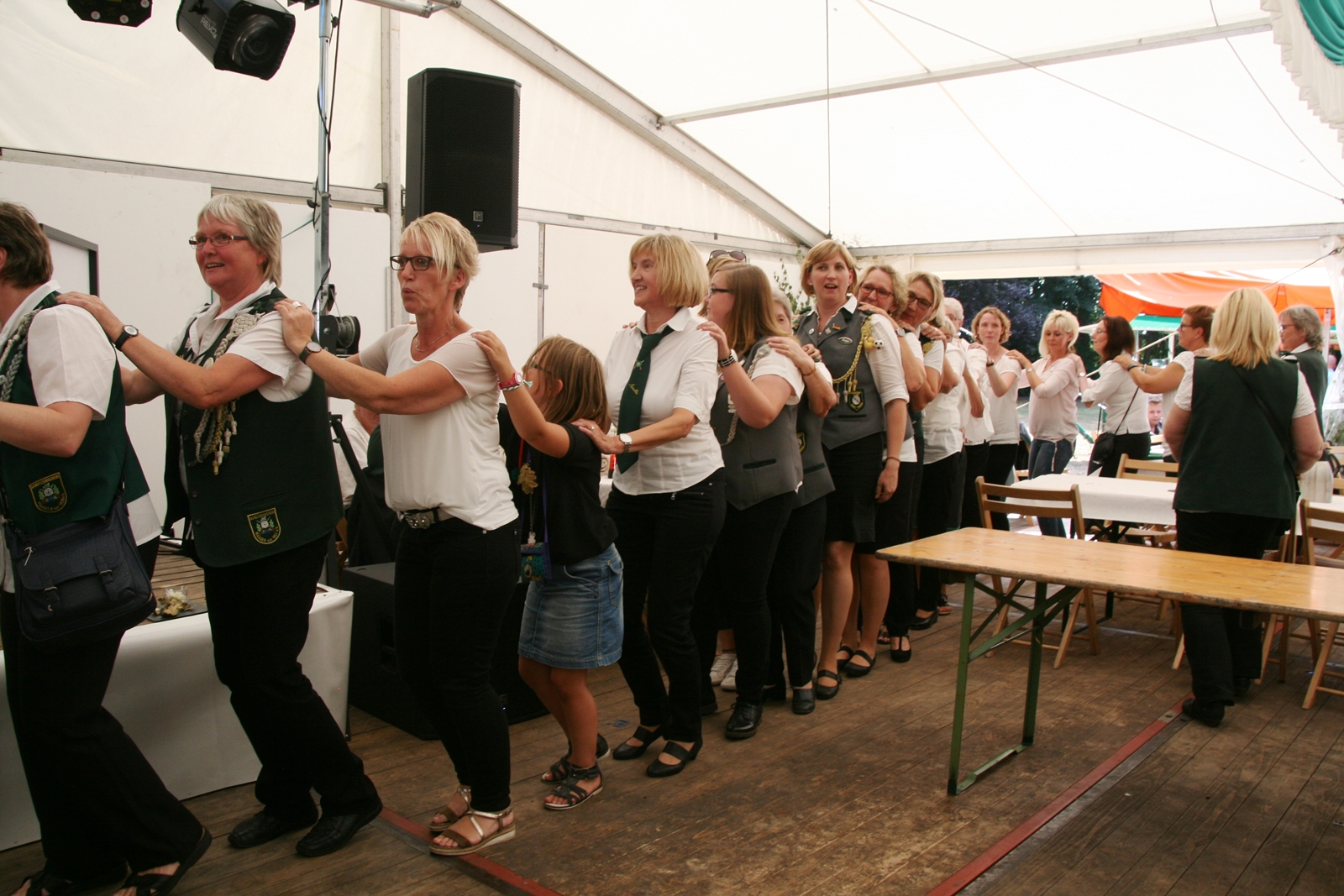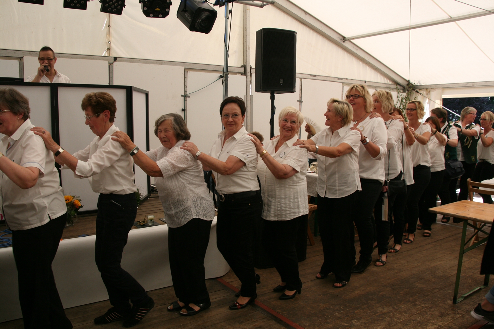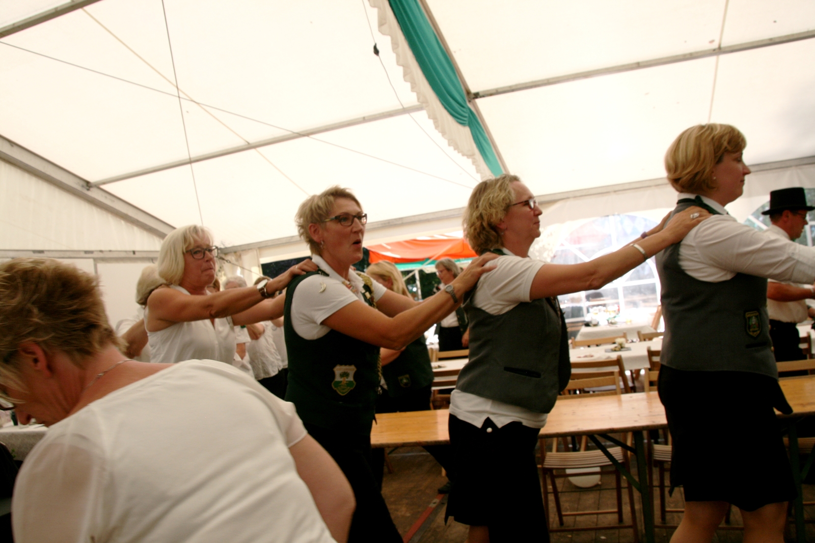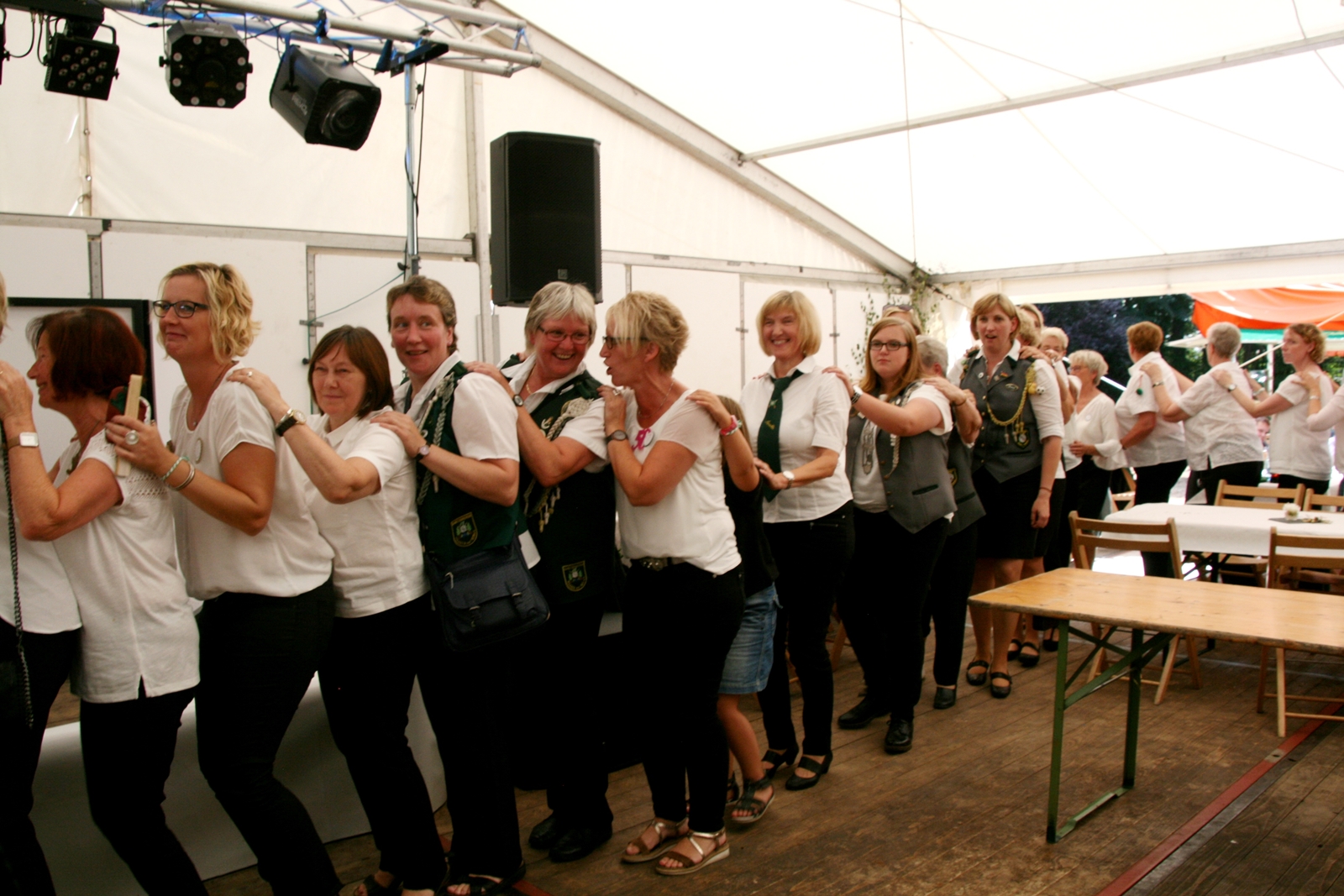 "DJ Ingolf" war dann für den musikalischen Part zuständig und die Damen ließen sich nicht lange Bitten: Mit einer Polonaise im und vor dem Zelt, begann nach der Kaffeetafel ein schwungvoller Nachmittag mit tollen Überraschungen! Die Theatergruppe Gaue mit Anneliese Schardelmann, Rita Mohrmann, Ina Laging, Karin Kluge, Annette Stallbohm und Günter Wünneker, brachte zwei Sketsche und strapazierte damit die Lachmuskeln aller Schützendamen. Der Auftritt der "Schlagerstars", Herren der "Piedelpoggen" (Björn Becker, Andreas Albers, Carsten Lüllmann und Thorsten Vielhauer) sangen im Playback, brachte dann das Zelt zum Beben, "Dancing Queen", ein Abba-Hit war die geforderte "Zugabe" der vier "Solisten"! Ein nicht endender Beifall begleitete sie von der Tanzfläche...
