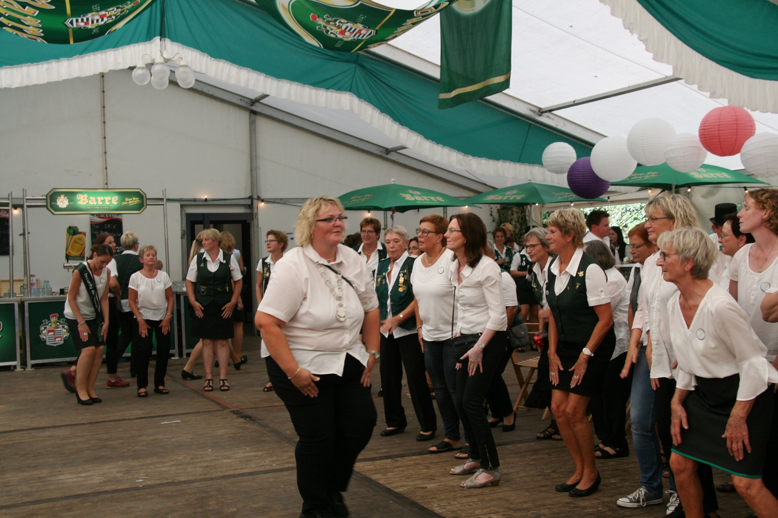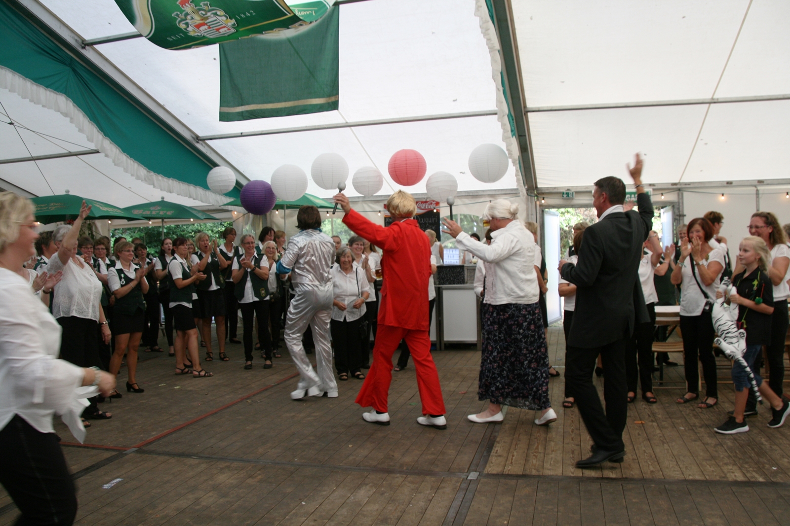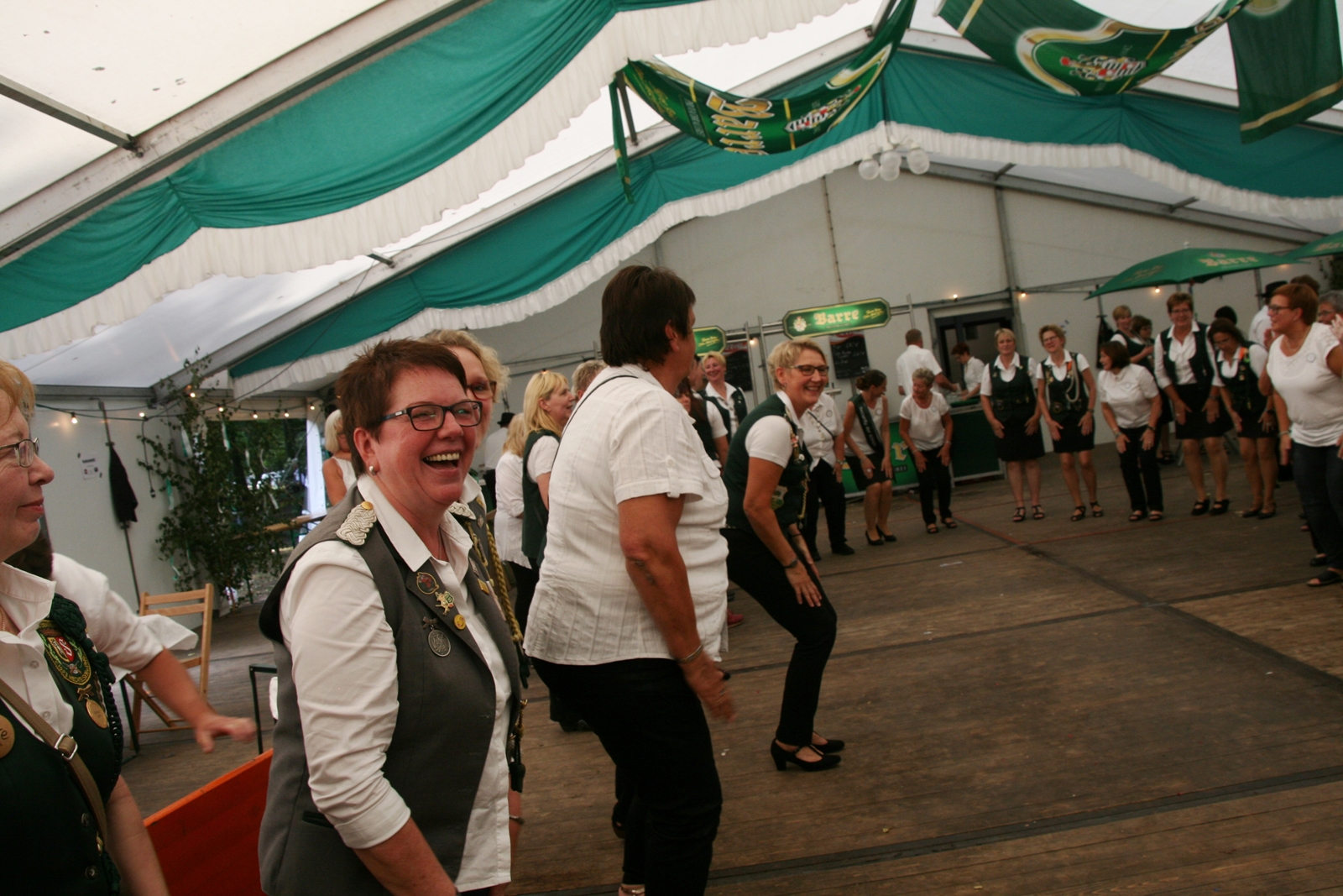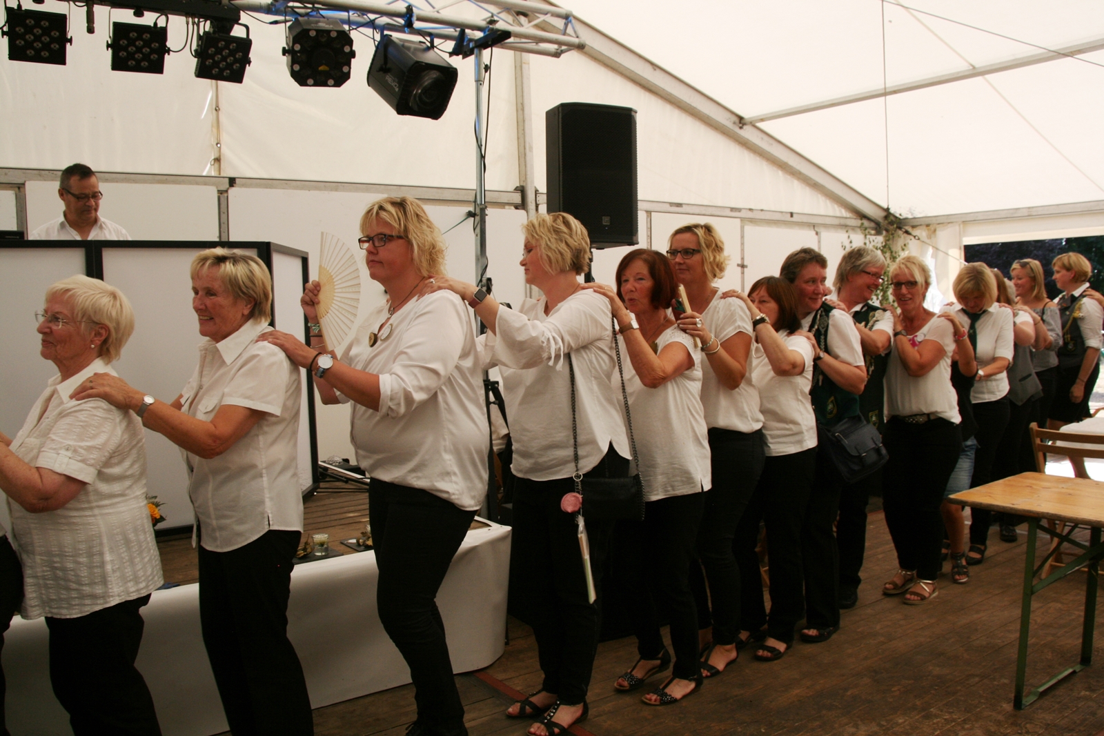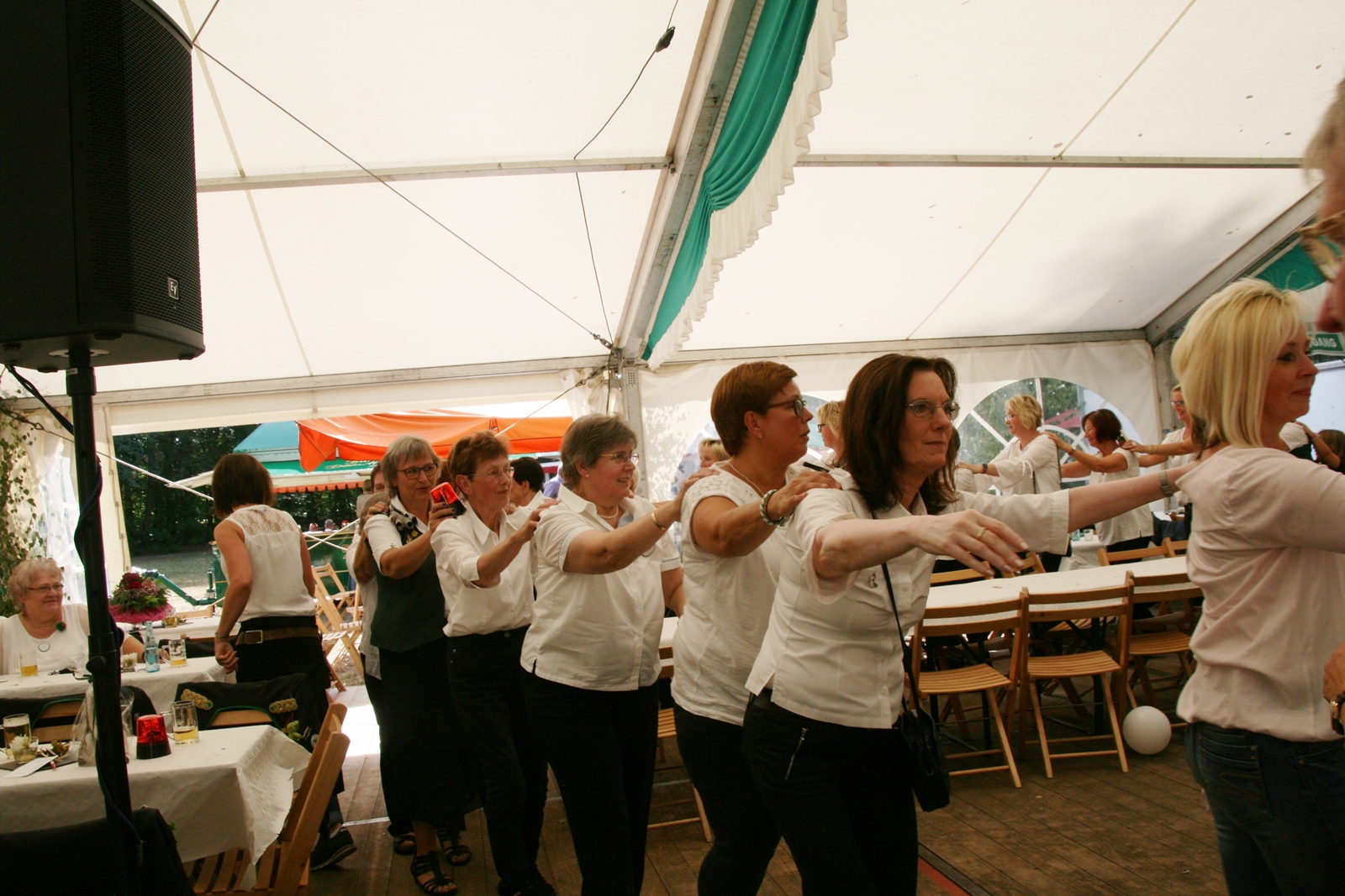"DJ Ingolf" war dann für den musikalischen Part zuständig und die Damen ließen sich nicht lange Bitten: Mit einer Polonaise im und vor dem Zelt, begann nach der Kaffeetafel ein schwungvoller Nachmittag mit tollen Überraschungen! Die Theatergruppe Gaue mit Anneliese Schardelmann, Rita Mohrmann, Ina Laging, Karin Kluge, Annette Stallbohm und Günter Wünneker, brachte zwei Sketsche und strapazierte damit die Lachmuskeln aller Schützendamen. Der Auftritt der "Schlagerstars", Herren der "Piedelpoggen" (Björn Becker, Andreas Albers, Carsten Lüllmann und Thorsten Vielhauer) sangen im Playback, brachte dann das Zelt zum Beben, "Dancing Queen", ein Abba-Hit war die geforderte "Zugabe" der vier "Solisten"! Ein nicht endender Beifall begleitete sie von der Tanzfläche...
