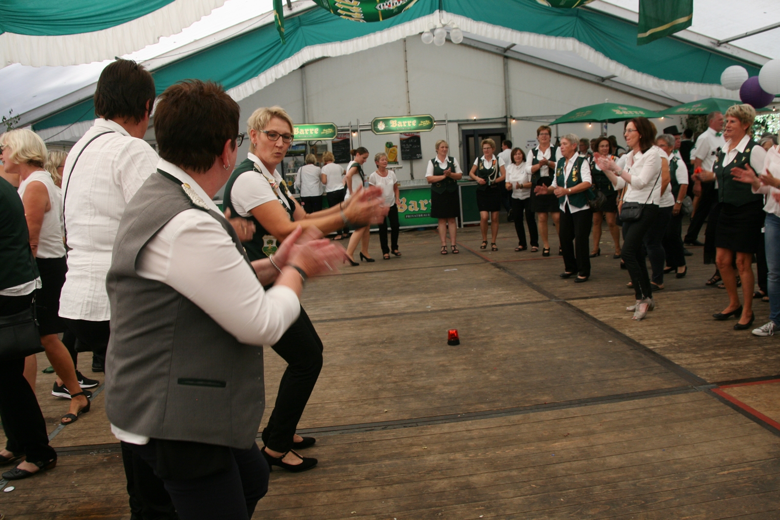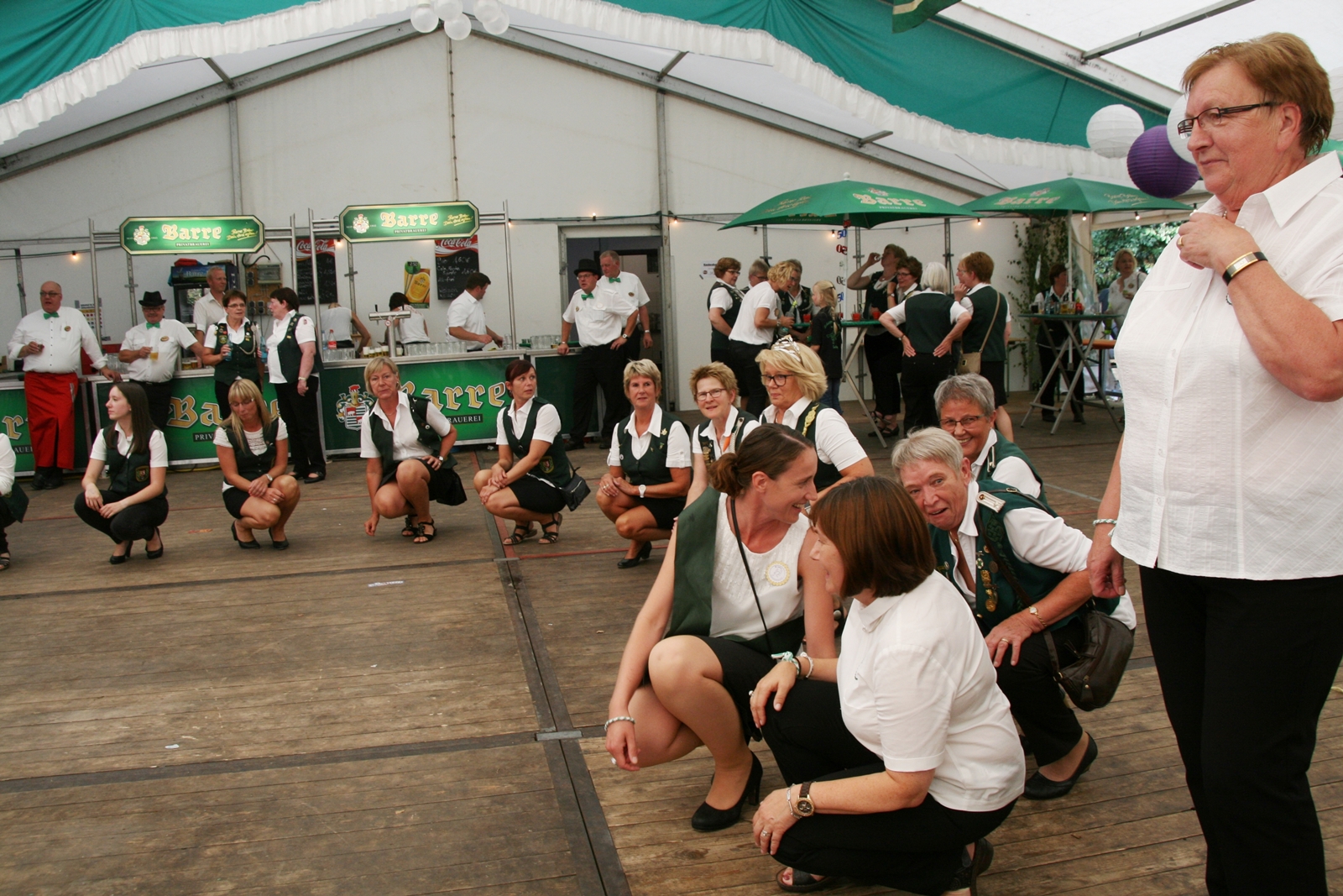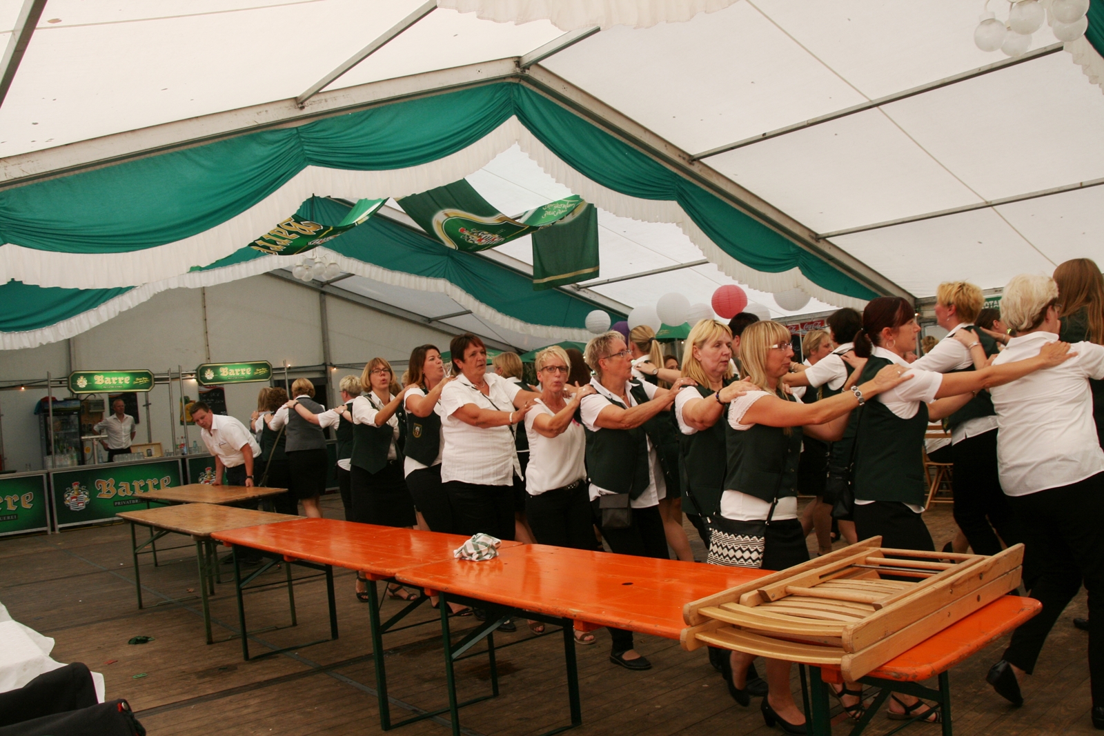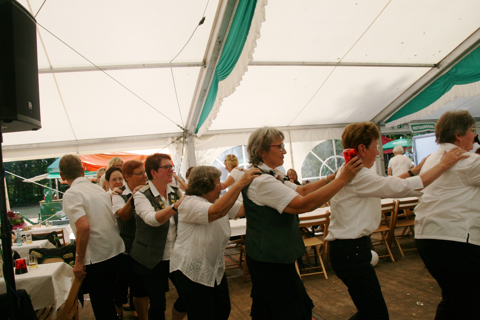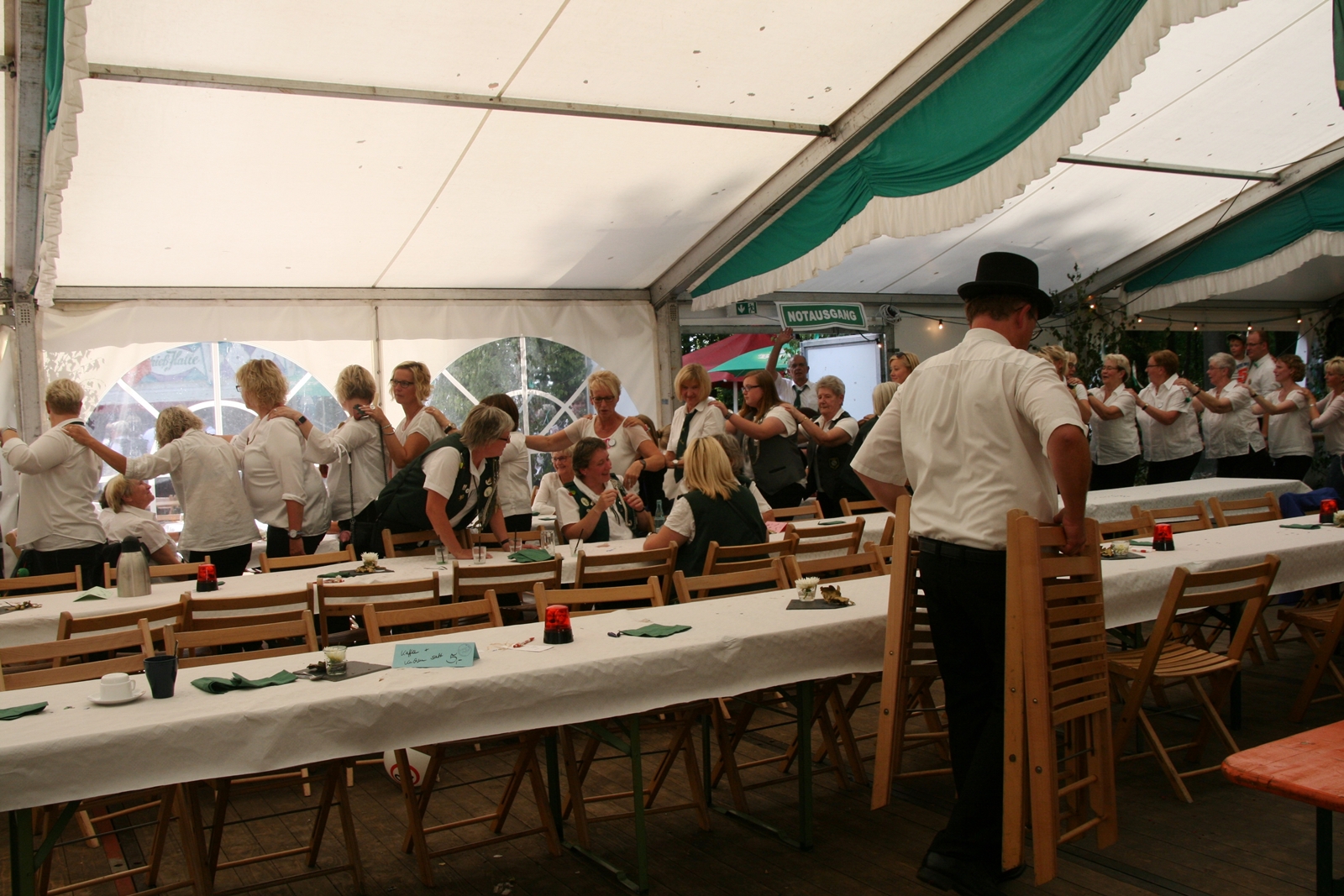 "DJ Ingolf" war dann für den musikalischen Part zuständig und die Damen ließen sich nicht lange Bitten: Mit einer Polonaise im und vor dem Zelt, begann nach der Kaffeetafel ein schwungvoller Nachmittag mit tollen Überraschungen! Die Theatergruppe Gaue mit Anneliese Schardelmann, Rita Mohrmann, Ina Laging, Karin Kluge, Annette Stallbohm und Günter Wünneker, brachte zwei Sketsche und strapazierte damit die Lachmuskeln aller Schützendamen. Der Auftritt der "Schlagerstars", Herren der "Piedelpoggen" (Björn Becker, Andreas Albers, Carsten Lüllmann und Thorsten Vielhauer) sangen im Playback, brachte dann das Zelt zum Beben, "Dancing Queen", ein Abba-Hit war die geforderte "Zugabe" der vier "Solisten"! Ein nicht endender Beifall begleitete sie von der Tanzfläche...