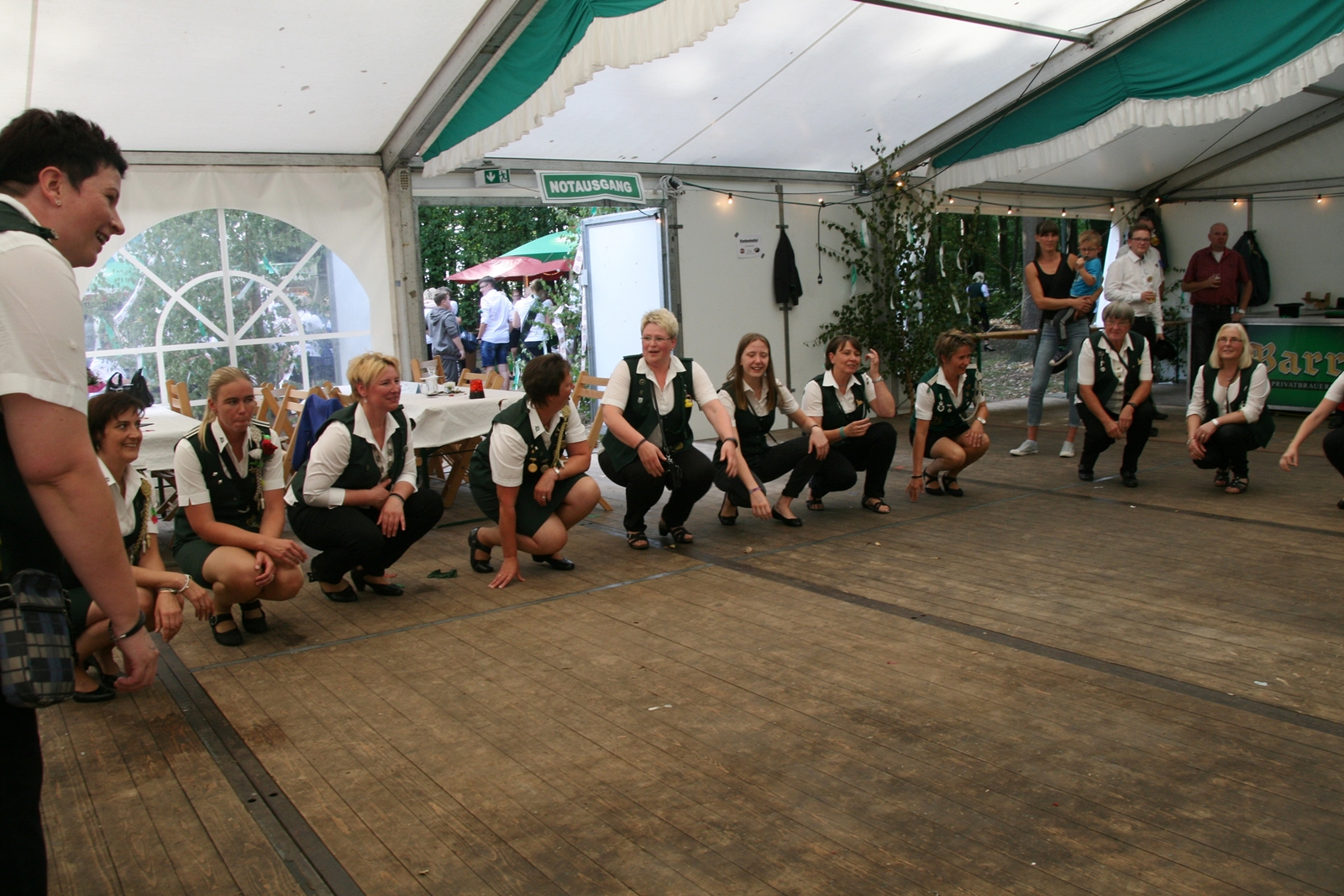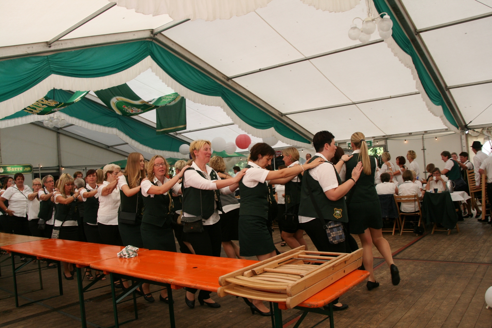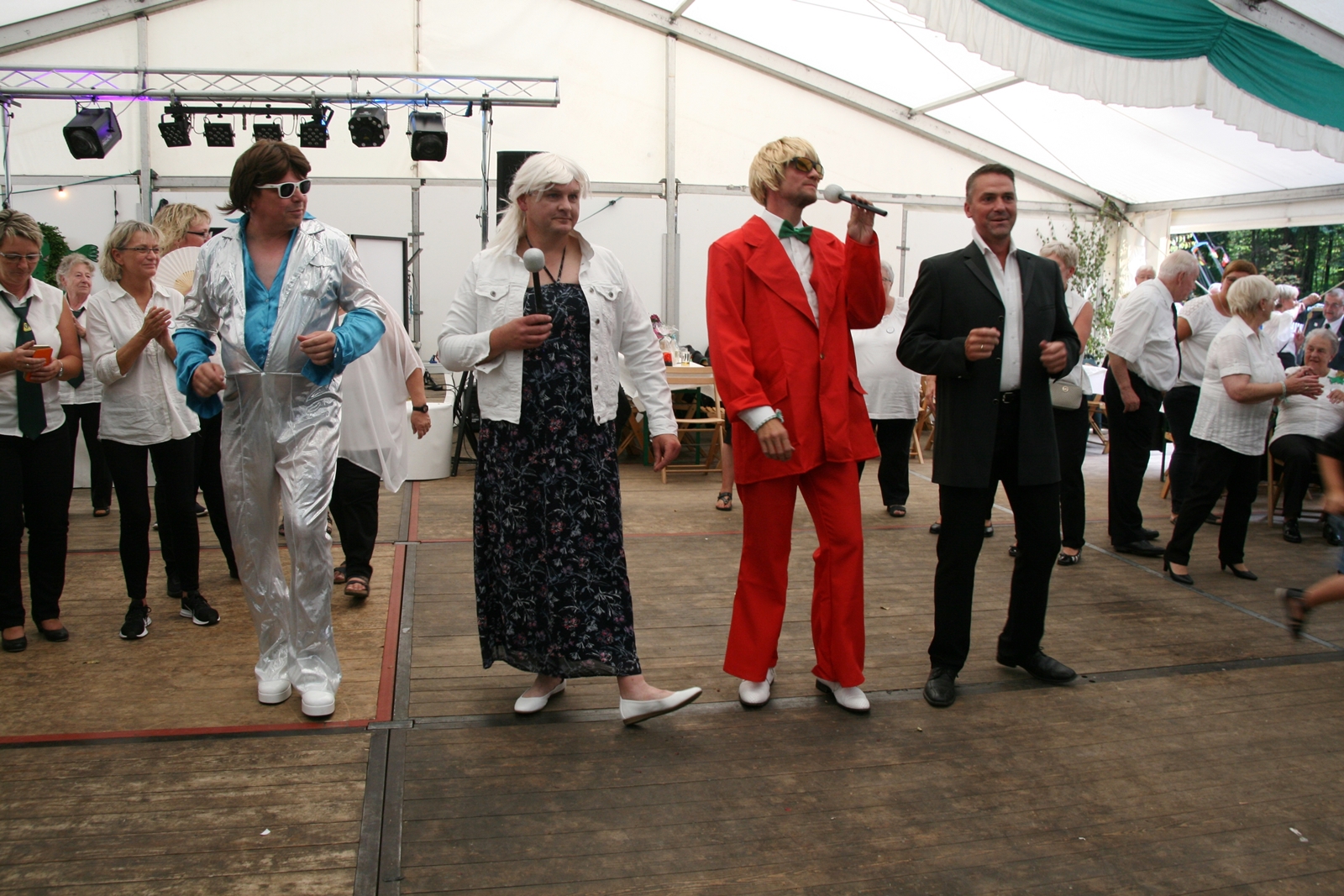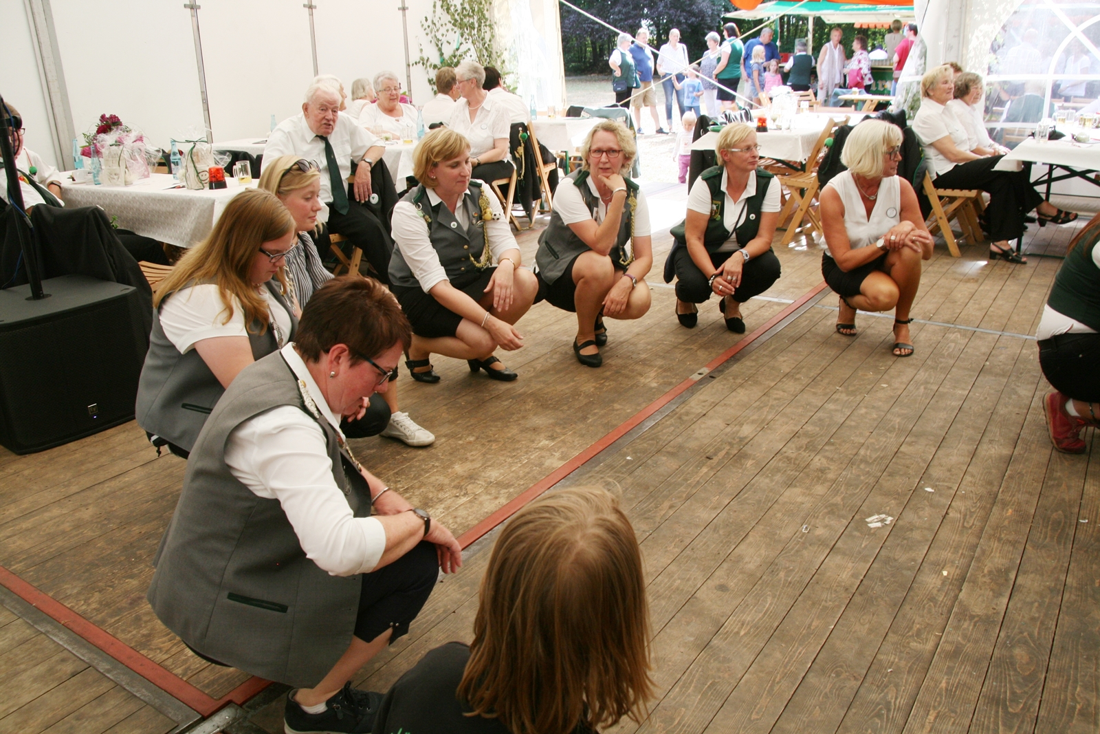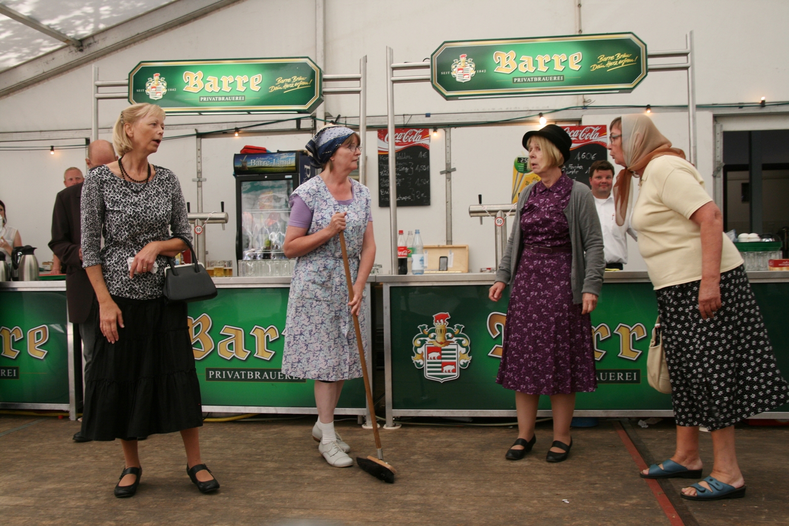 "DJ Ingolf" war dann für den musikalischen Part zuständig und die Damen ließen sich nicht lange Bitten: Mit einer Polonaise im und vor dem Zelt, begann nach der Kaffeetafel ein schwungvoller Nachmittag mit tollen Überraschungen! Die Theatergruppe Gaue mit Anneliese Schardelmann, Rita Mohrmann, Ina Laging, Karin Kluge, Annette Stallbohm und Günter Wünneker, brachte zwei Sketsche und strapazierte damit die Lachmuskeln aller Schützendamen. Der Auftritt der "Schlagerstars", Herren der "Piedelpoggen" (Björn Becker, Andreas Albers, Carsten Lüllmann und Thorsten Vielhauer) sangen im Playback, brachte dann das Zelt zum Beben, "Dancing Queen", ein Abba-Hit war die geforderte "Zugabe" der vier "Solisten"! Ein nicht endender Beifall begleitete sie von der Tanzfläche...