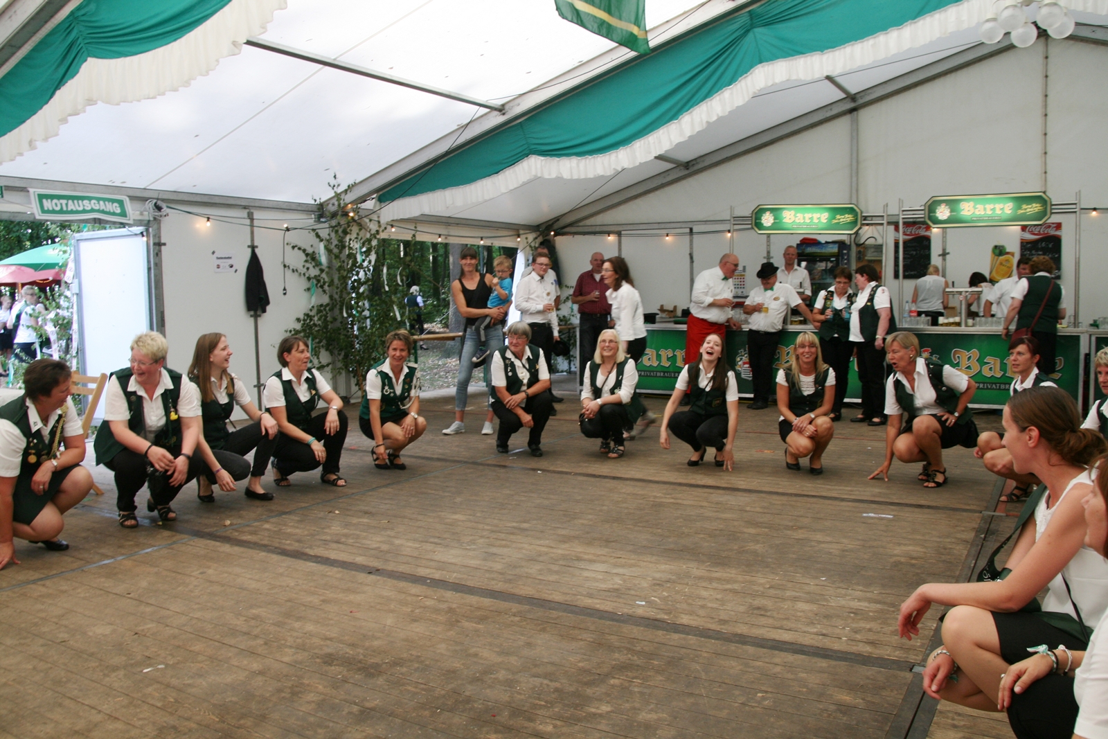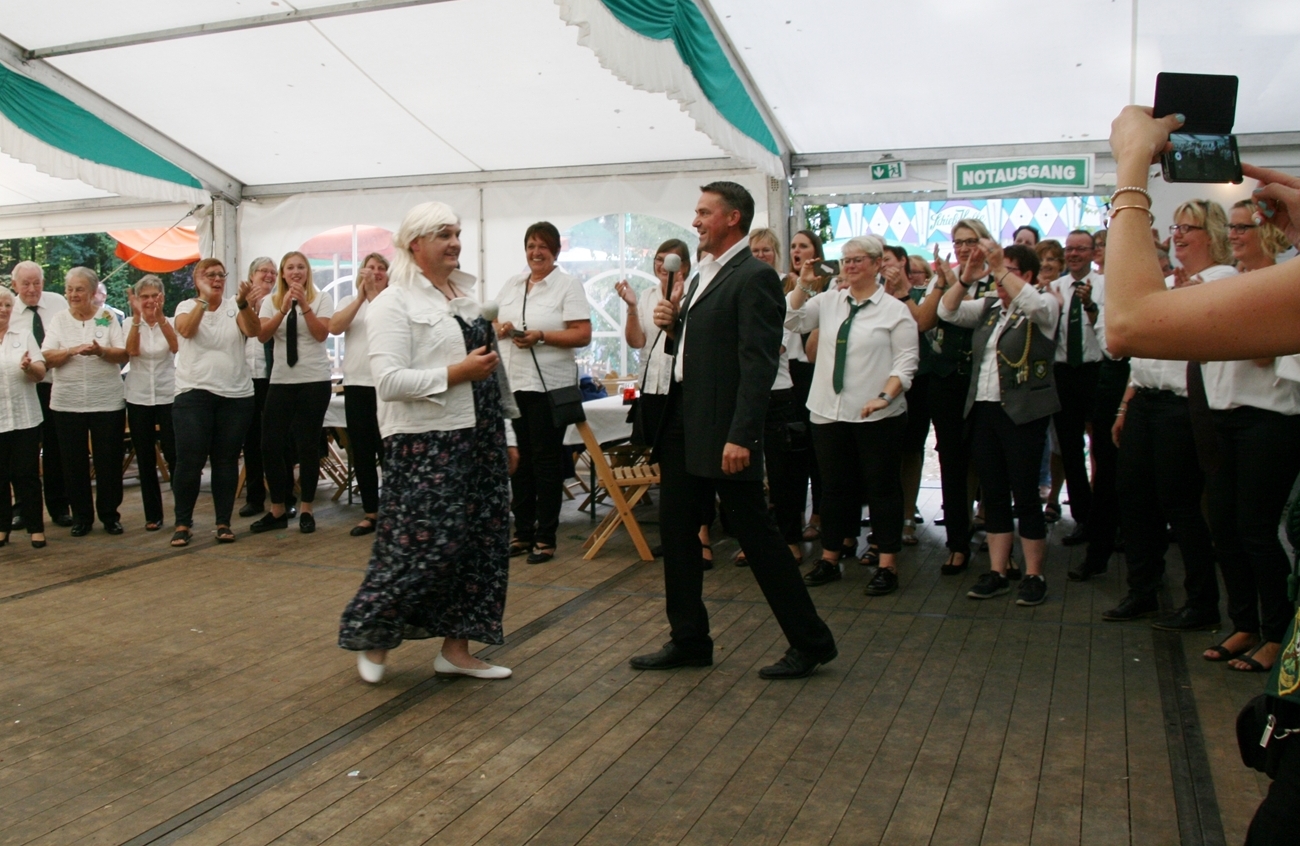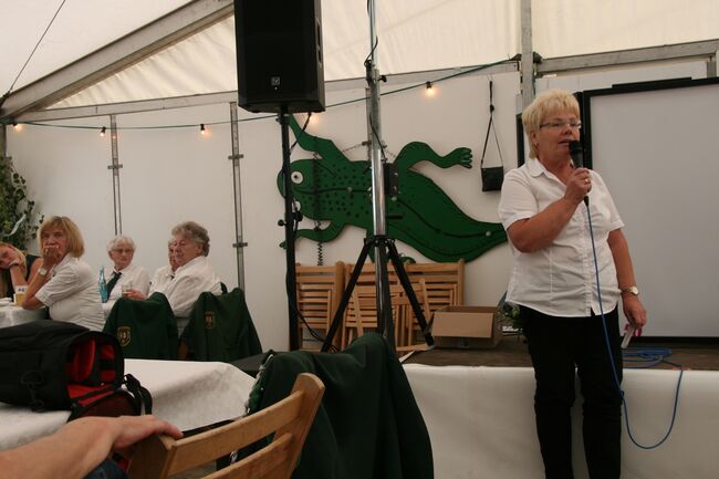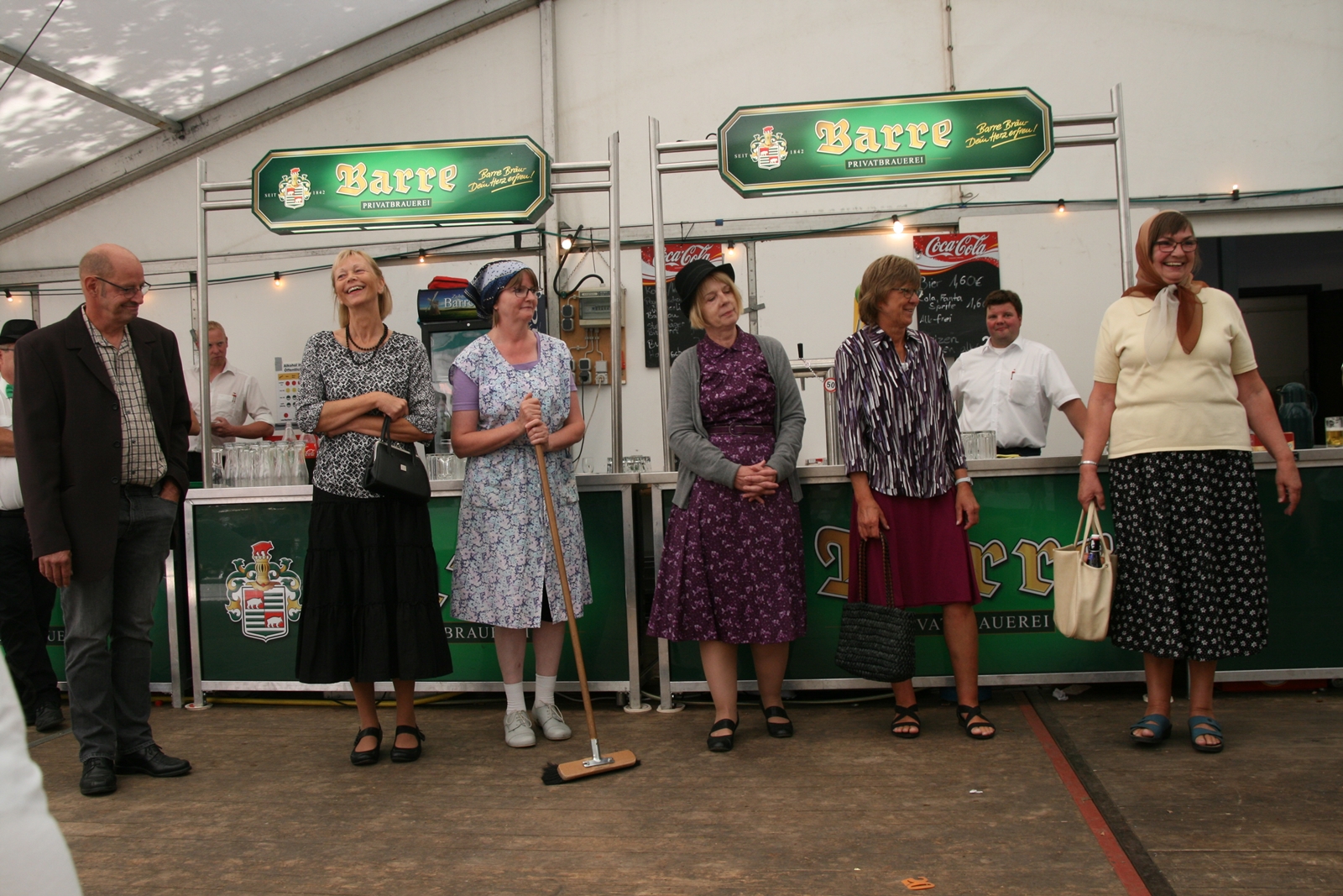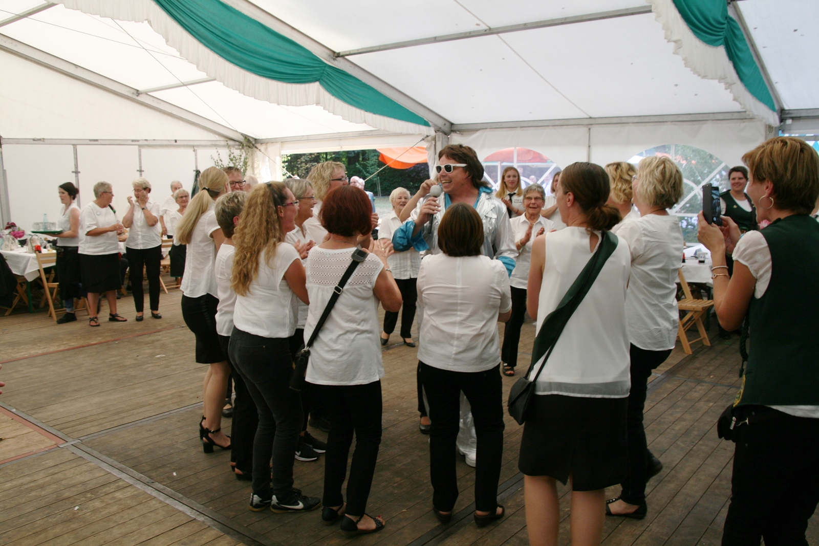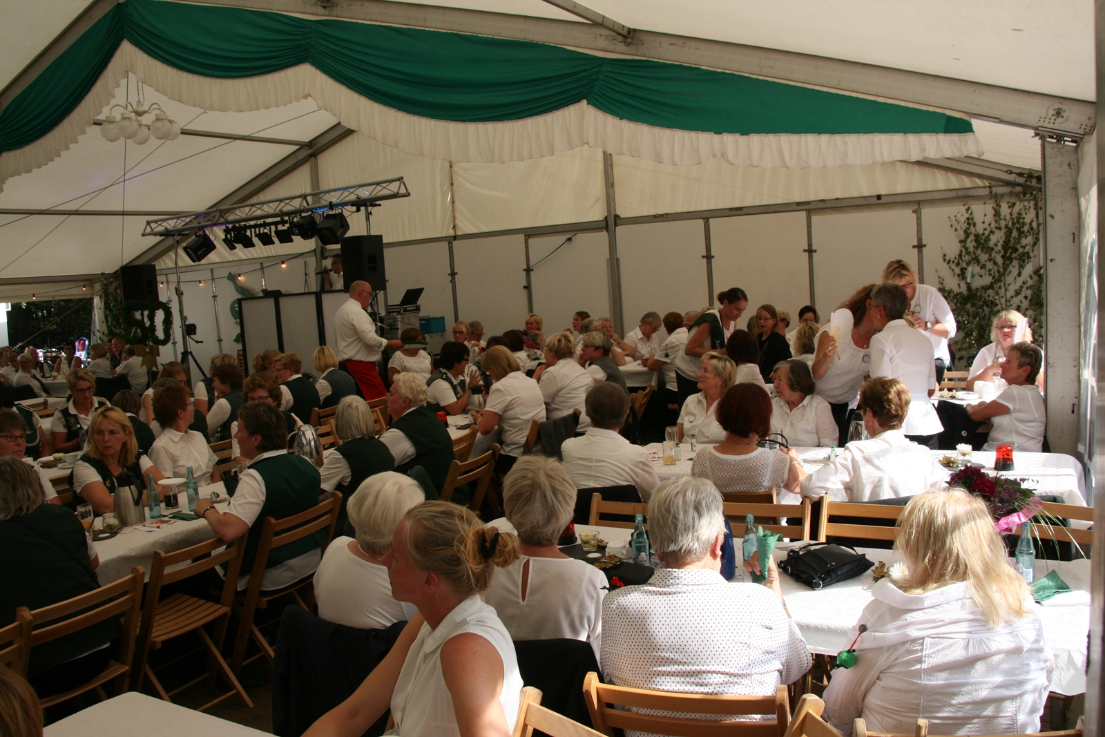 "DJ Ingolf" war dann für den musikalischen Part zuständig und die Damen ließen sich nicht lange Bitten: Mit einer Polonaise im und vor dem Zelt, begann nach der Kaffeetafel ein schwungvoller Nachmittag mit tollen Überraschungen! Die Theatergruppe Gaue mit Anneliese Schardelmann, Rita Mohrmann, Ina Laging, Karin Kluge, Annette Stallbohm und Günter Wünneker, brachte zwei Sketsche und strapazierte damit die Lachmuskeln aller Schützendamen. Der Auftritt der "Schlagerstars", Herren der "Piedelpoggen" (Björn Becker, Andreas Albers, Carsten Lüllmann und Thorsten Vielhauer) sangen im Playback, brachte dann das Zelt zum Beben, "Dancing Queen", ein Abba-Hit war die geforderte "Zugabe" der vier "Solisten"! Ein nicht endender Beifall begleitete sie von der Tanzfläche...