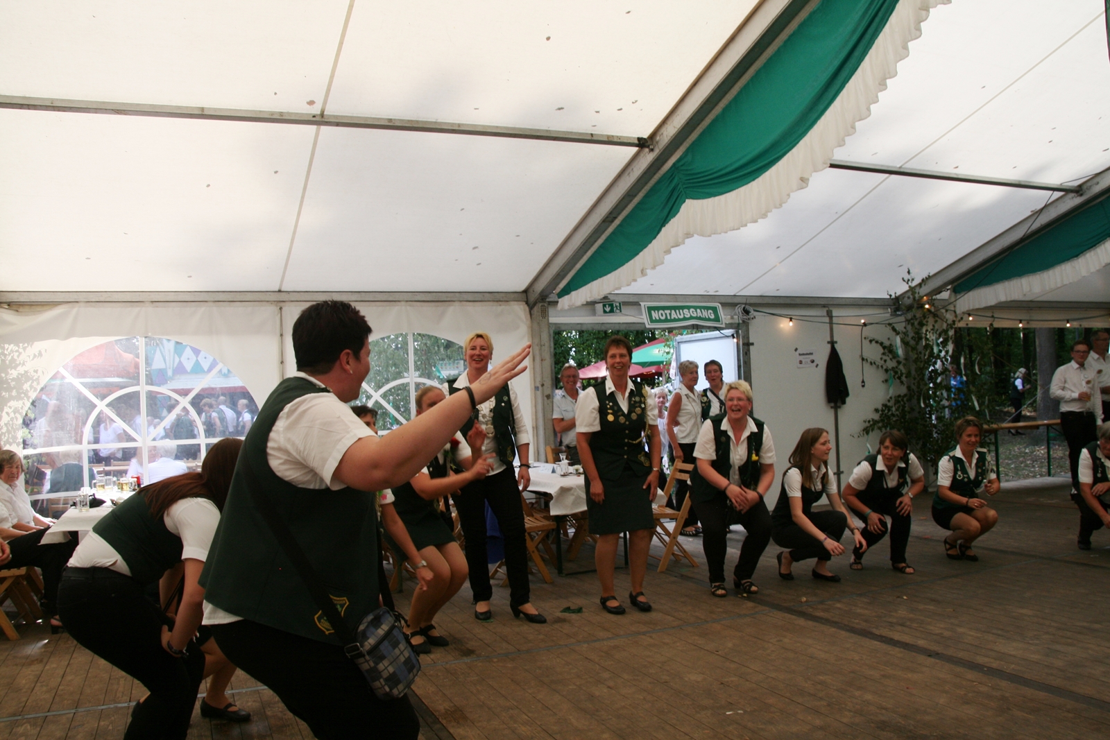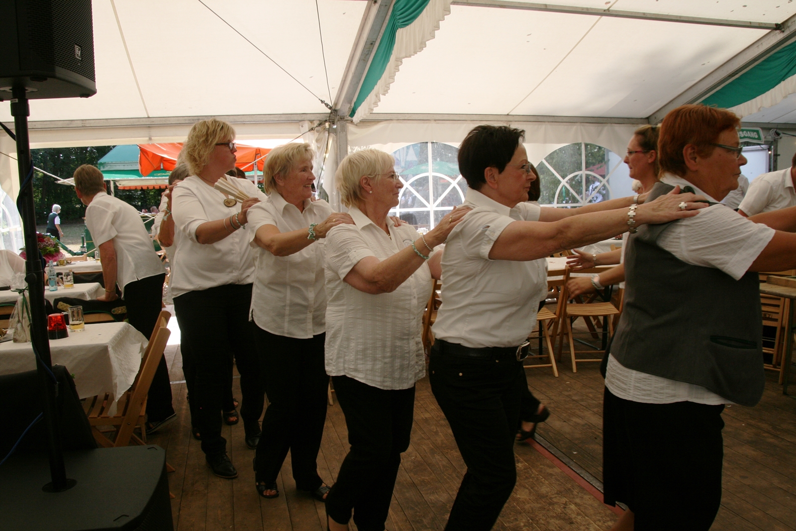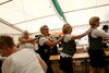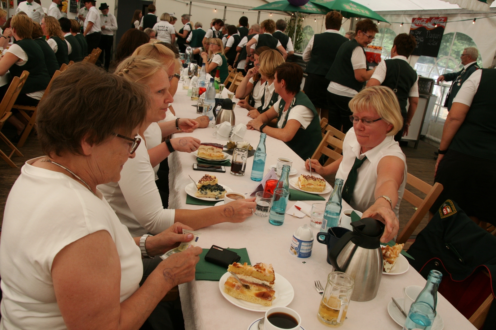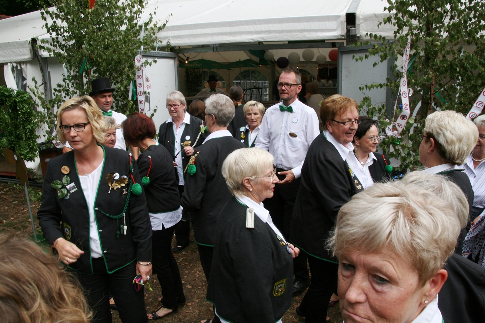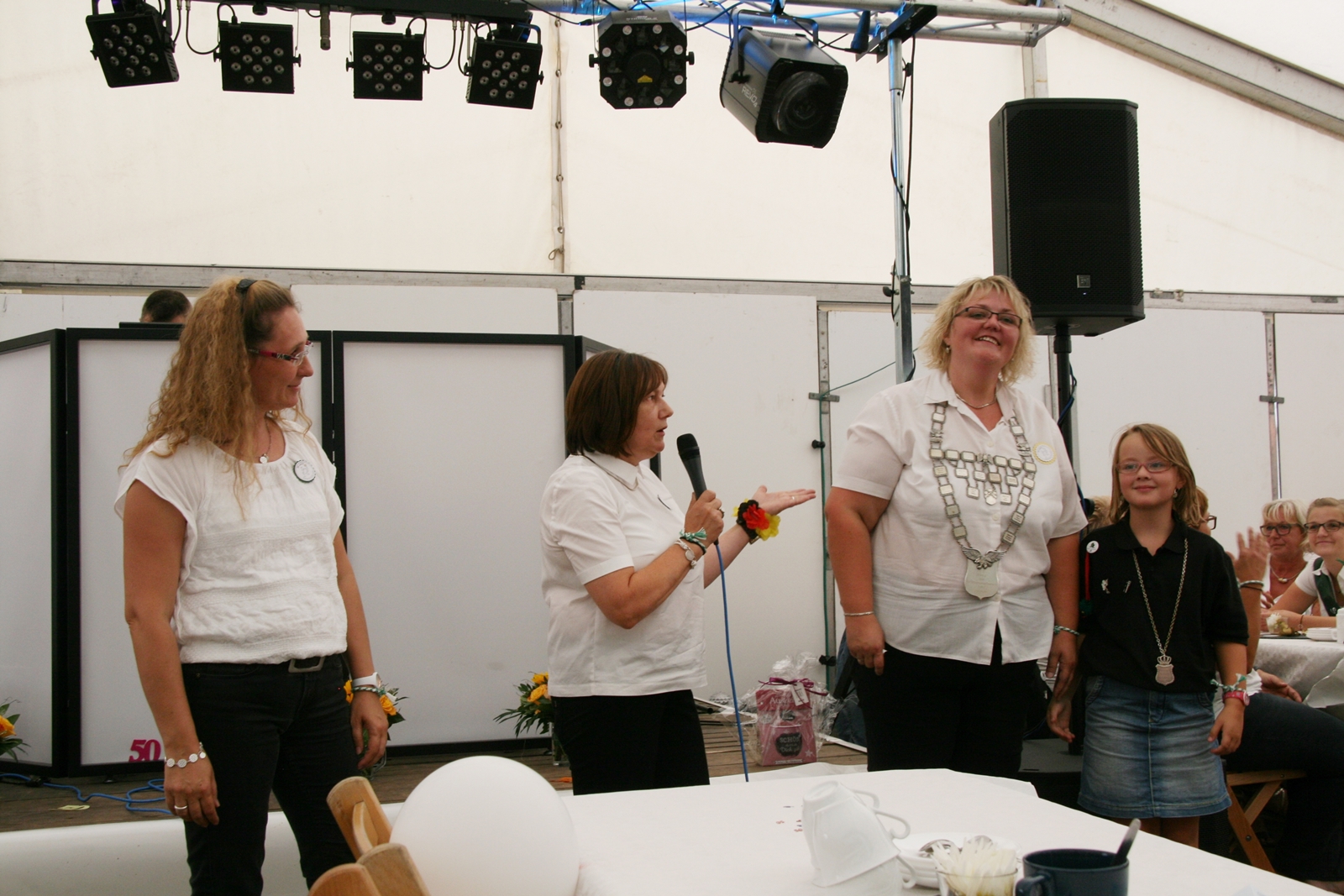 "DJ Ingolf" war dann für den musikalischen Part zuständig und die Damen ließen sich nicht lange Bitten: Mit einer Polonaise im und vor dem Zelt, begann nach der Kaffeetafel ein schwungvoller Nachmittag mit tollen Überraschungen! Die Theatergruppe Gaue mit Anneliese Schardelmann, Rita Mohrmann, Ina Laging, Karin Kluge, Annette Stallbohm und Günter Wünneker, brachte zwei Sketsche und strapazierte damit die Lachmuskeln aller Schützendamen. Der Auftritt der "Schlagerstars", Herren der "Piedelpoggen" (Björn Becker, Andreas Albers, Carsten Lüllmann und Thorsten Vielhauer) sangen im Playback, brachte dann das Zelt zum Beben, "Dancing Queen", ein Abba-Hit war die geforderte "Zugabe" der vier "Solisten"! Ein nicht endender Beifall begleitete sie von der Tanzfläche...
