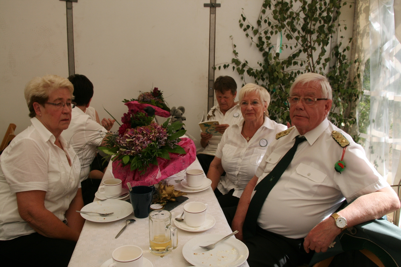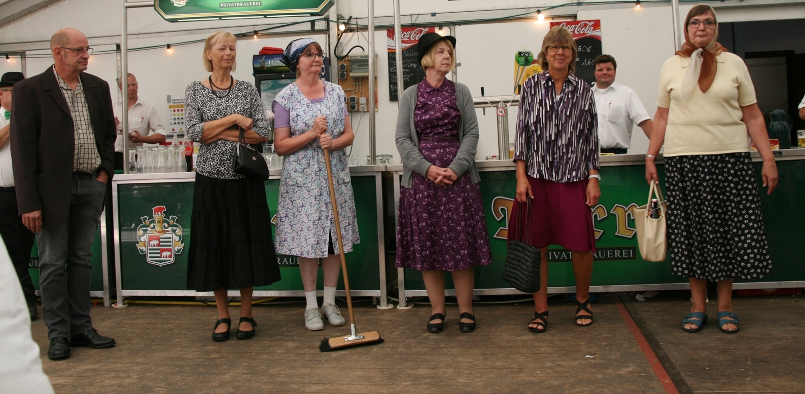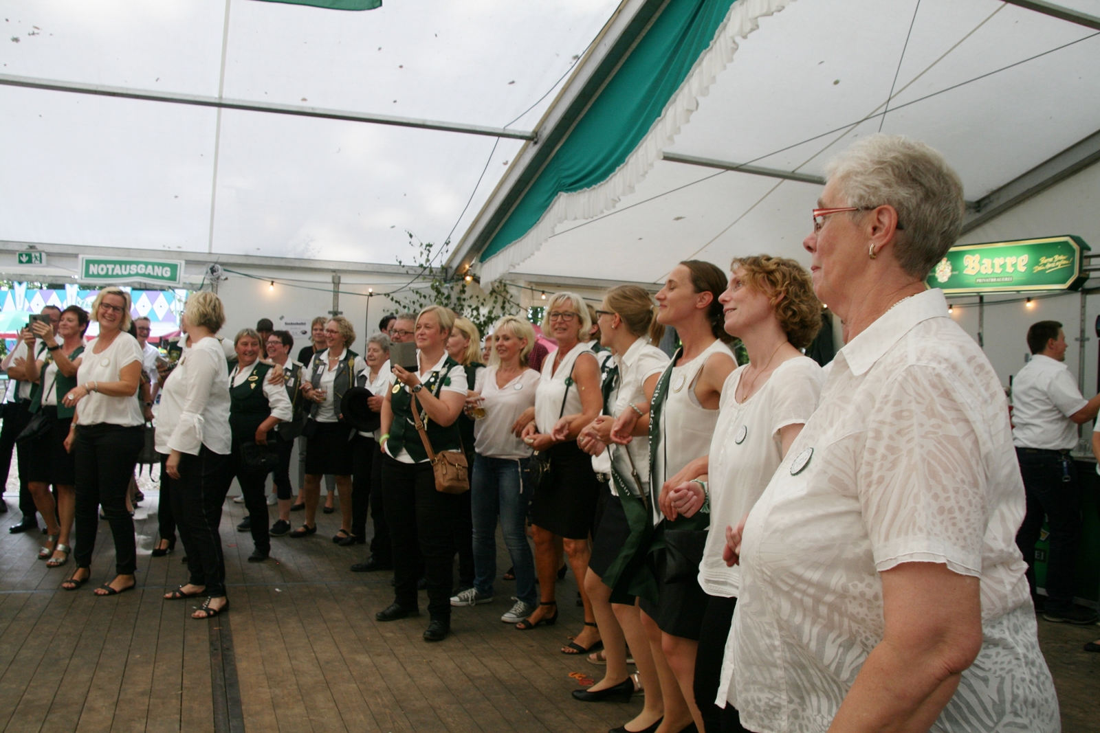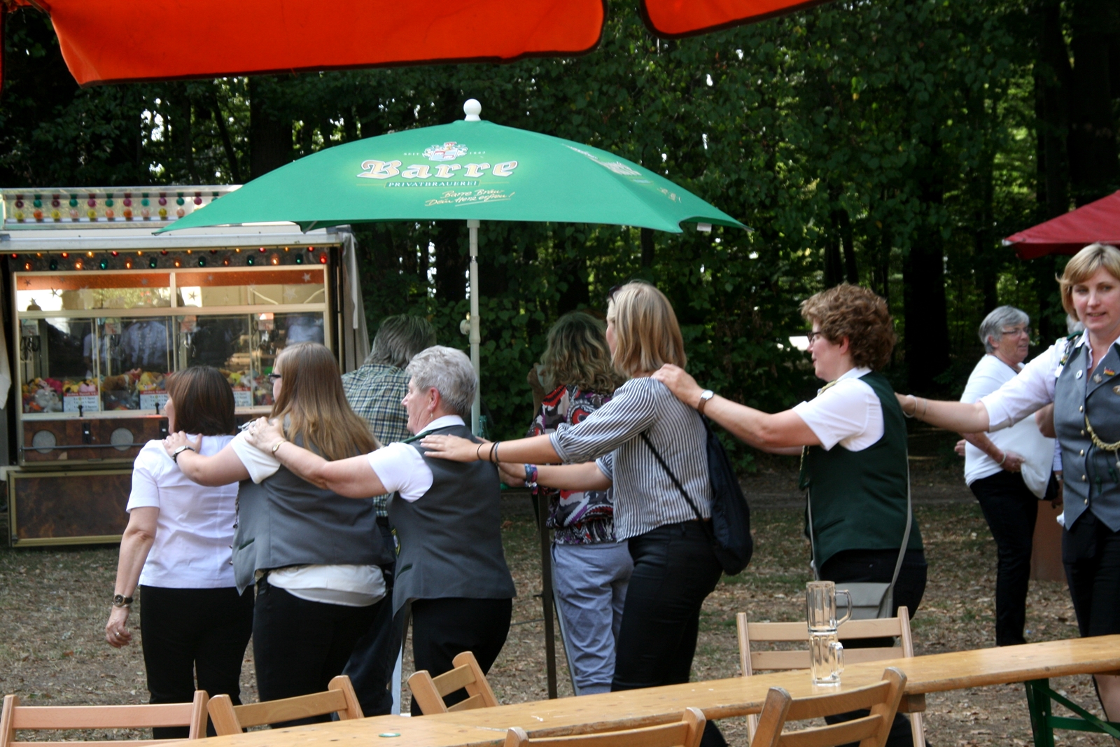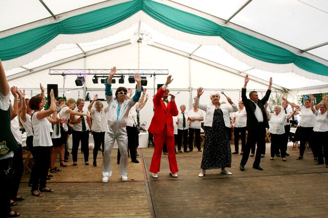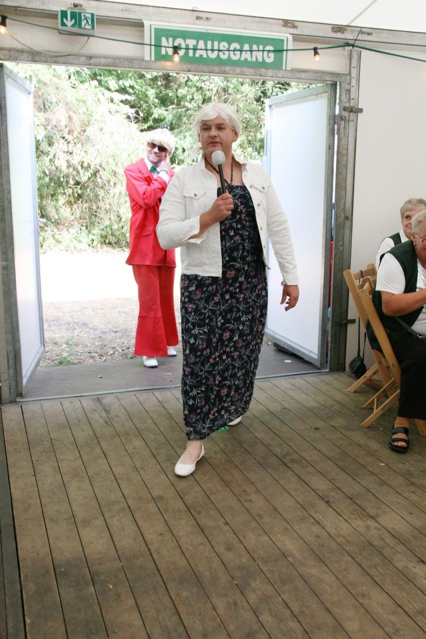"DJ Ingolf" war dann für den musikalischen Part zuständig und die Damen ließen sich nicht lange Bitten: Mit einer Polonaise im und vor dem Zelt, begann nach der Kaffeetafel ein schwungvoller Nachmittag mit tollen Überraschungen! Die Theatergruppe Gaue mit Anneliese Schardelmann, Rita Mohrmann, Ina Laging, Karin Kluge, Annette Stallbohm und Günter Wünneker, brachte zwei Sketsche und strapazierte damit die Lachmuskeln aller Schützendamen. Der Auftritt der "Schlagerstars", Herren der "Piedelpoggen" (Björn Becker, Andreas Albers, Carsten Lüllmann und Thorsten Vielhauer) sangen im Playback, brachte dann das Zelt zum Beben, "Dancing Queen", ein Abba-Hit war die geforderte "Zugabe" der vier "Solisten"! Ein nicht endender Beifall begleitete sie von der Tanzfläche...