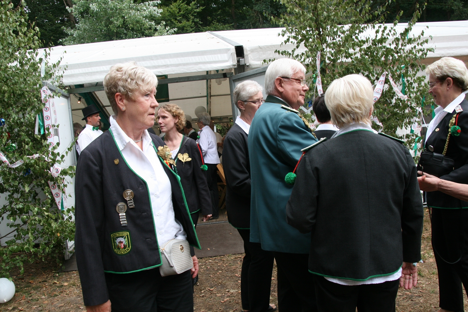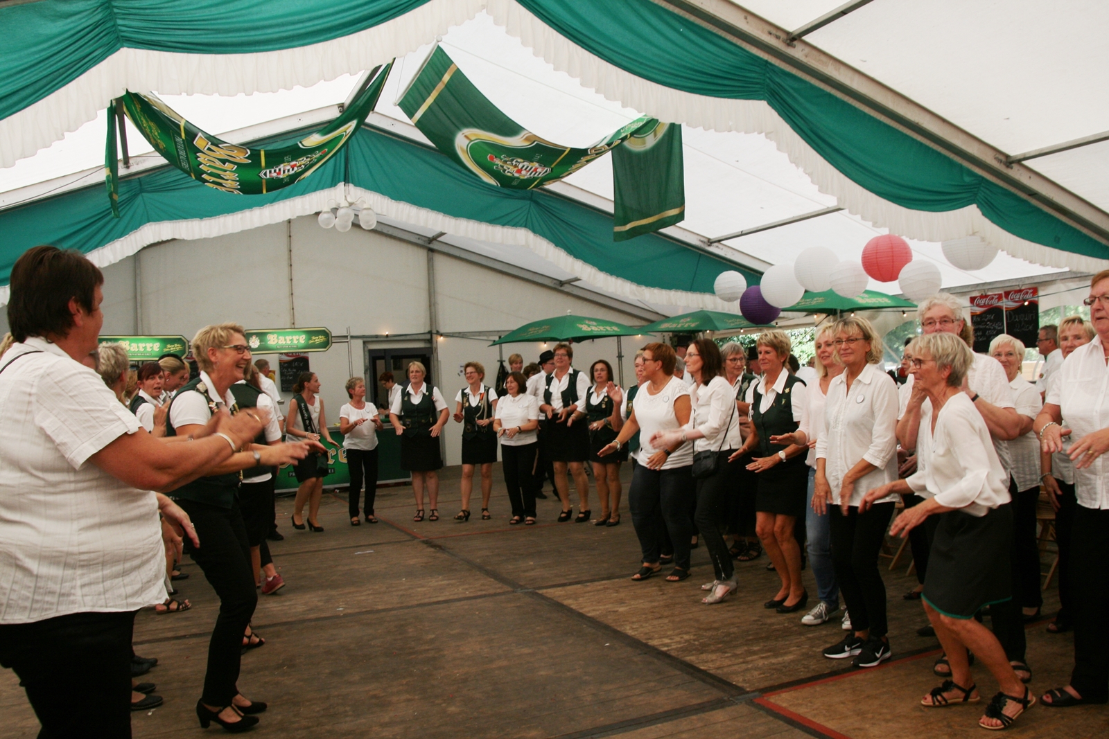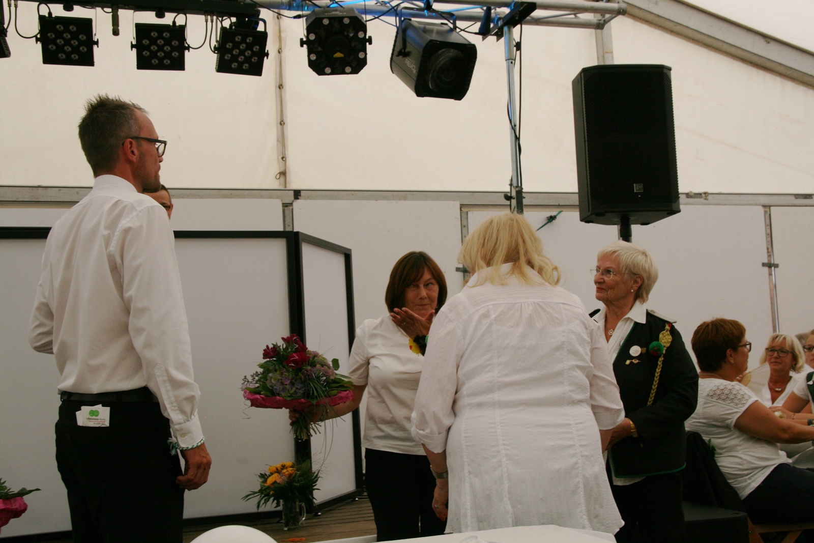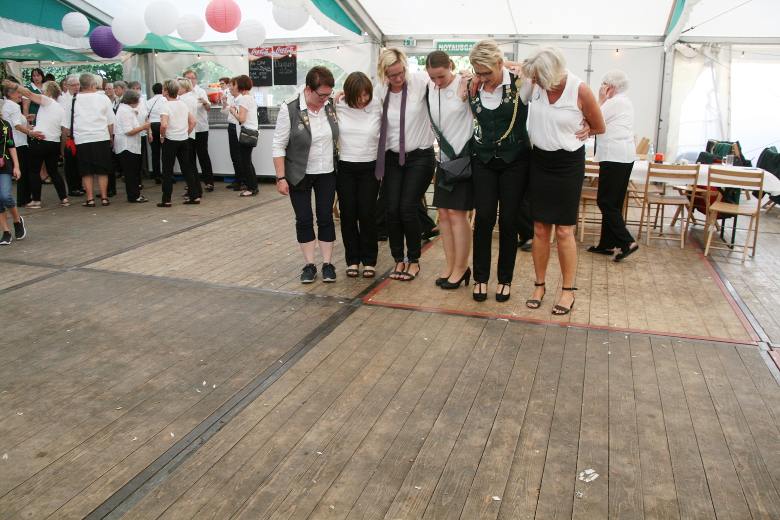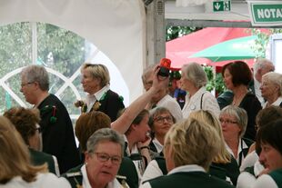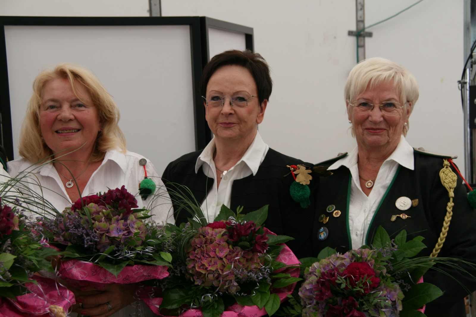 "DJ Ingolf" war dann für den musikalischen Part zuständig und die Damen ließen sich nicht lange Bitten: Mit einer Polonaise im und vor dem Zelt, begann nach der Kaffeetafel ein schwungvoller Nachmittag mit tollen Überraschungen! Die Theatergruppe Gaue mit Anneliese Schardelmann, Rita Mohrmann, Ina Laging, Karin Kluge, Annette Stallbohm und Günter Wünneker, brachte zwei Sketsche und strapazierte damit die Lachmuskeln aller Schützendamen. Der Auftritt der "Schlagerstars", Herren der "Piedelpoggen" (Björn Becker, Andreas Albers, Carsten Lüllmann und Thorsten Vielhauer) sangen im Playback, brachte dann das Zelt zum Beben, "Dancing Queen", ein Abba-Hit war die geforderte "Zugabe" der vier "Solisten"! Ein nicht endender Beifall begleitete sie von der Tanzfläche...