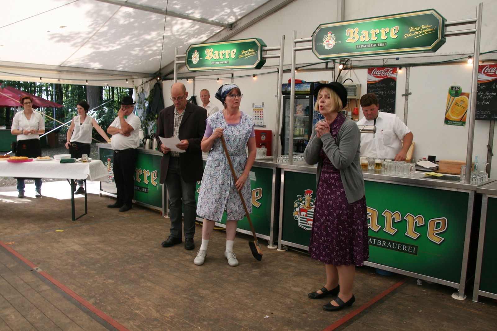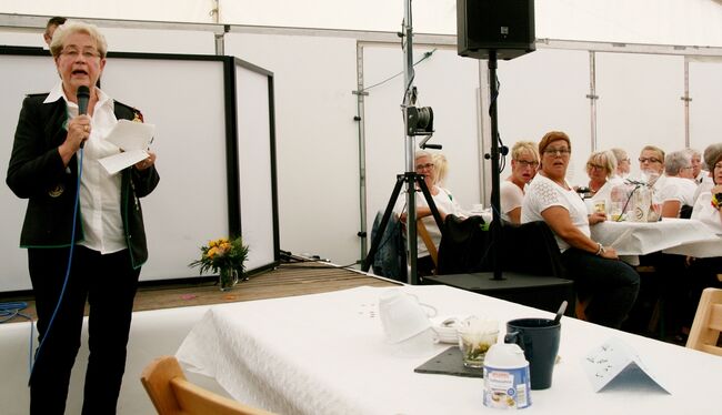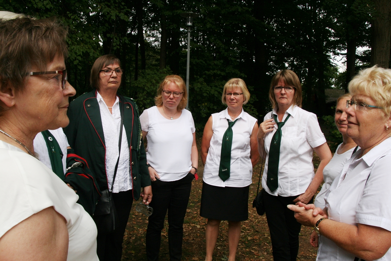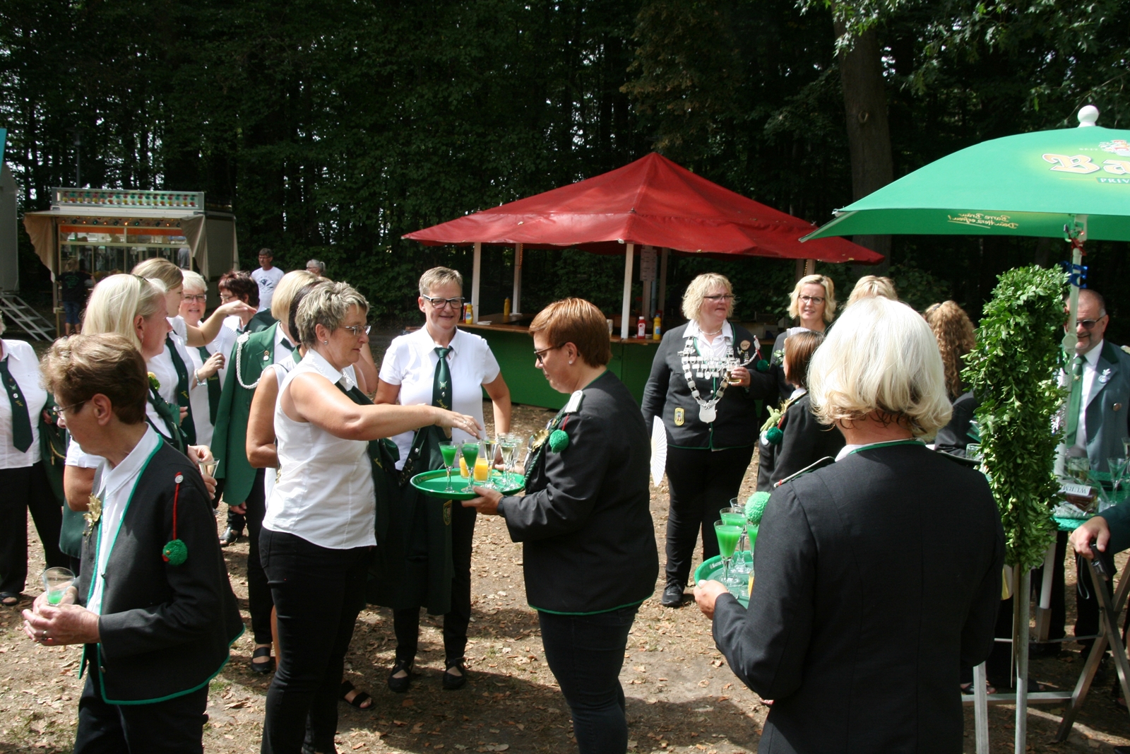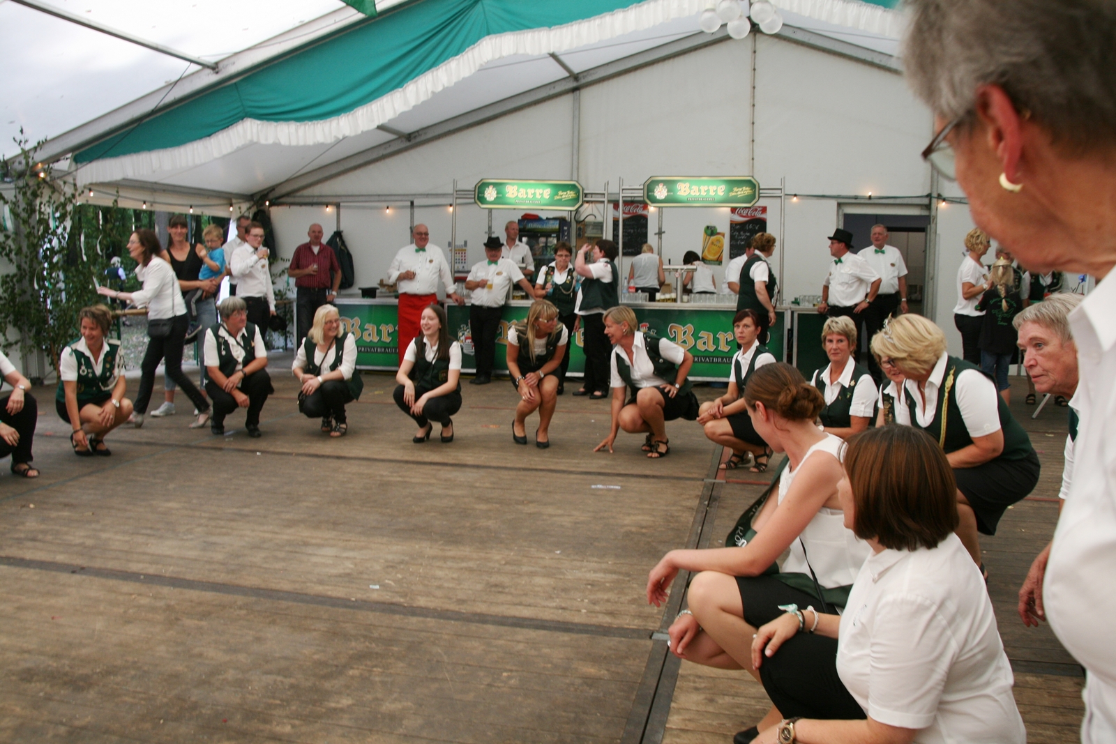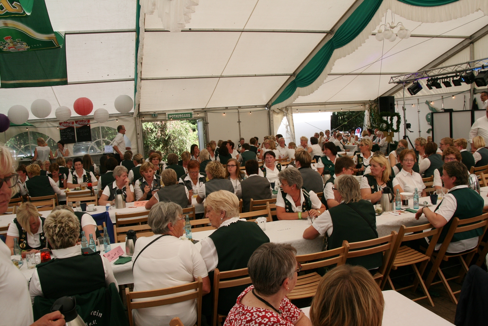 "DJ Ingolf" war dann für den musikalischen Part zuständig und die Damen ließen sich nicht lange Bitten: Mit einer Polonaise im und vor dem Zelt, begann nach der Kaffeetafel ein schwungvoller Nachmittag mit tollen Überraschungen! Die Theatergruppe Gaue mit Anneliese Schardelmann, Rita Mohrmann, Ina Laging, Karin Kluge, Annette Stallbohm und Günter Wünneker, brachte zwei Sketsche und strapazierte damit die Lachmuskeln aller Schützendamen. Der Auftritt der "Schlagerstars", Herren der "Piedelpoggen" (Björn Becker, Andreas Albers, Carsten Lüllmann und Thorsten Vielhauer) sangen im Playback, brachte dann das Zelt zum Beben, "Dancing Queen", ein Abba-Hit war die geforderte "Zugabe" der vier "Solisten"! Ein nicht endender Beifall begleitete sie von der Tanzfläche...