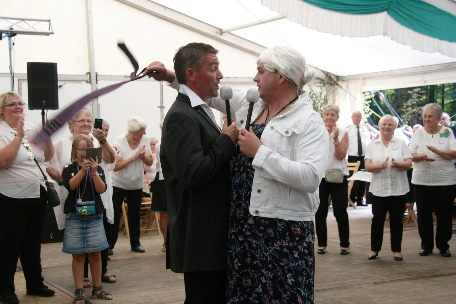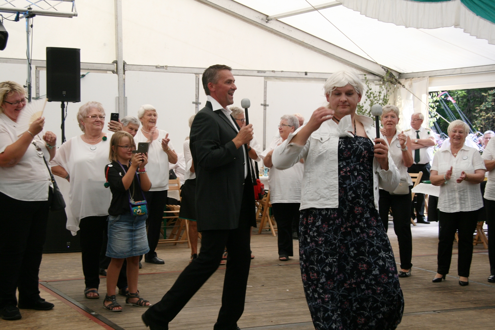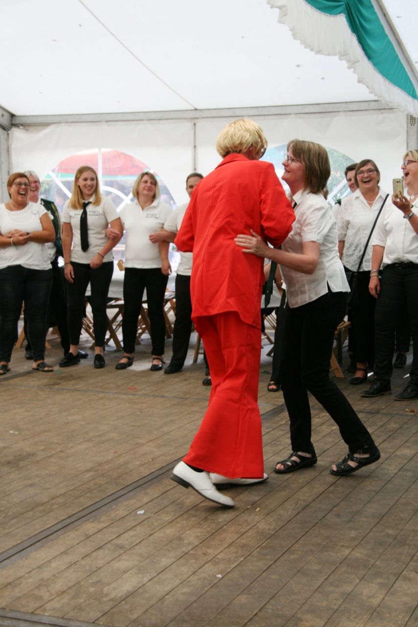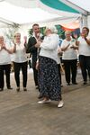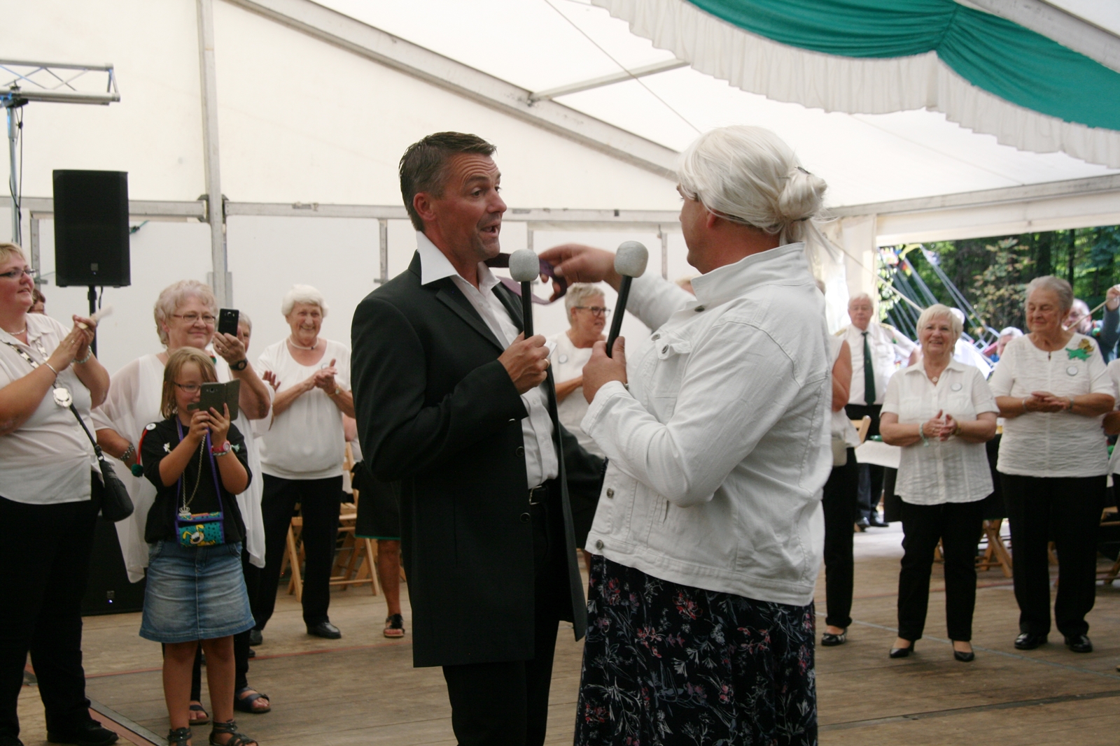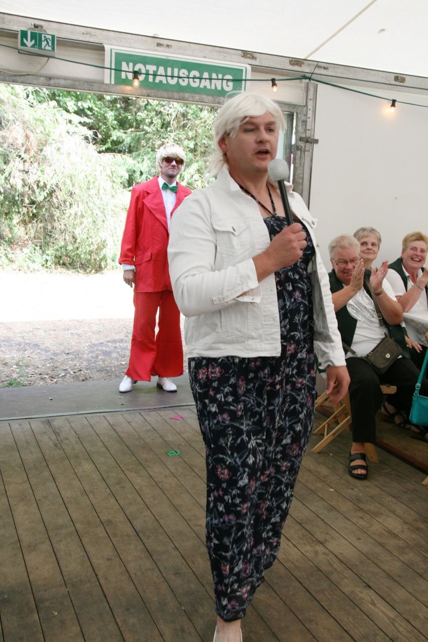 "DJ Ingolf" war dann für den musikalischen Part zuständig und die Damen ließen sich nicht lange Bitten: Mit einer Polonaise im und vor dem Zelt, begann nach der Kaffeetafel ein schwungvoller Nachmittag mit tollen Überraschungen! Die Theatergruppe Gaue mit Anneliese Schardelmann, Rita Mohrmann, Ina Laging, Karin Kluge, Annette Stallbohm und Günter Wünneker, brachte zwei Sketsche und strapazierte damit die Lachmuskeln aller Schützendamen. Der Auftritt der "Schlagerstars", Herren der "Piedelpoggen" (Björn Becker, Andreas Albers, Carsten Lüllmann und Thorsten Vielhauer) sangen im Playback, brachte dann das Zelt zum Beben, "Dancing Queen", ein Abba-Hit war die geforderte "Zugabe" der vier "Solisten"! Ein nicht endender Beifall begleitete sie von der Tanzfläche...