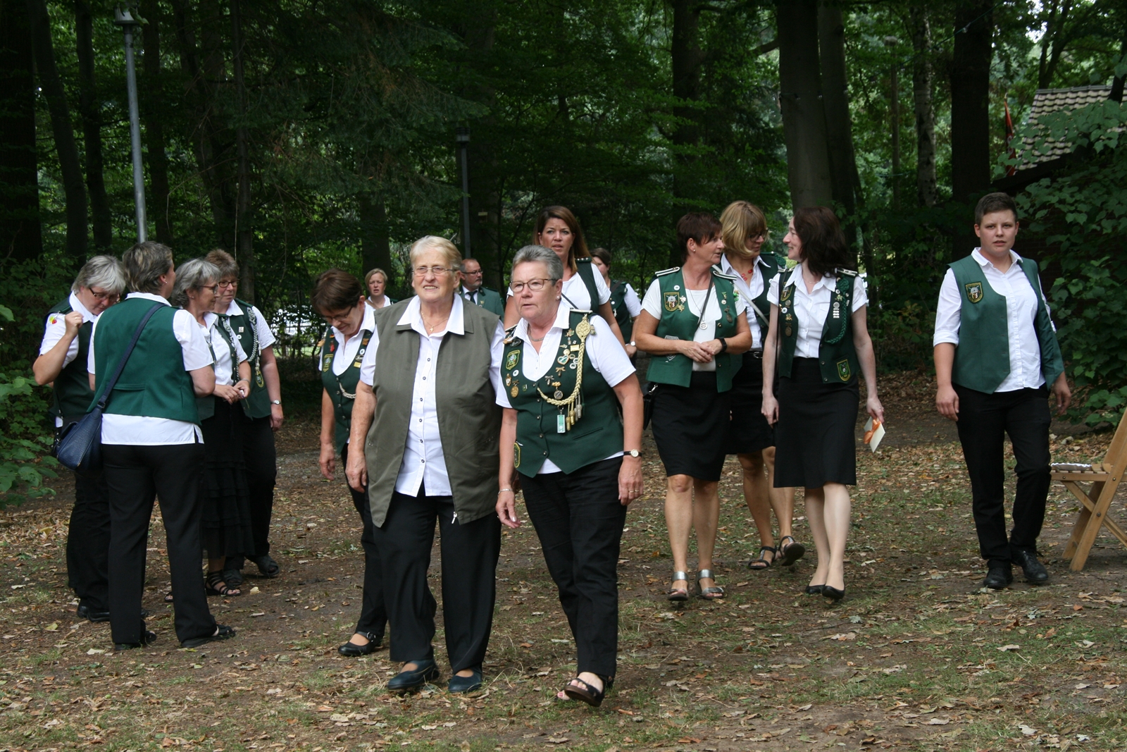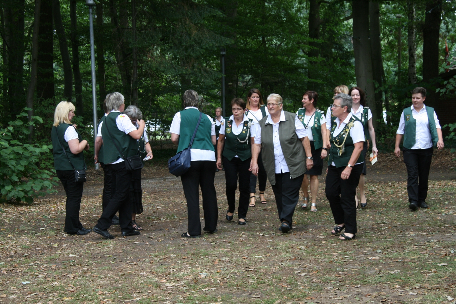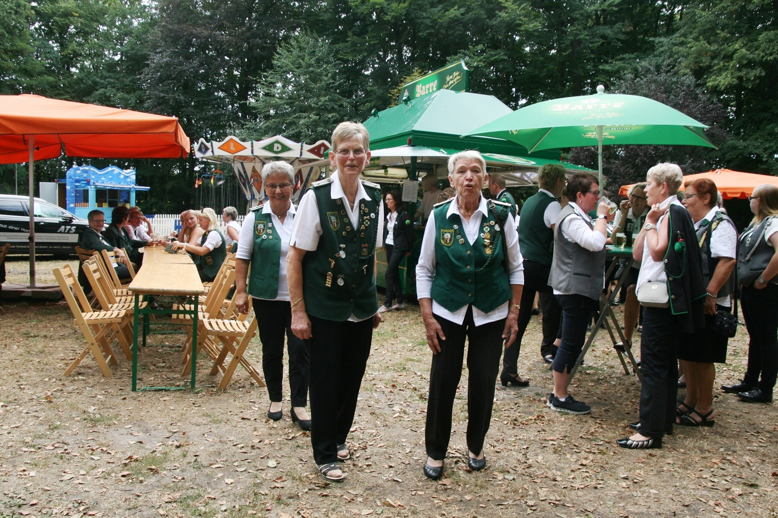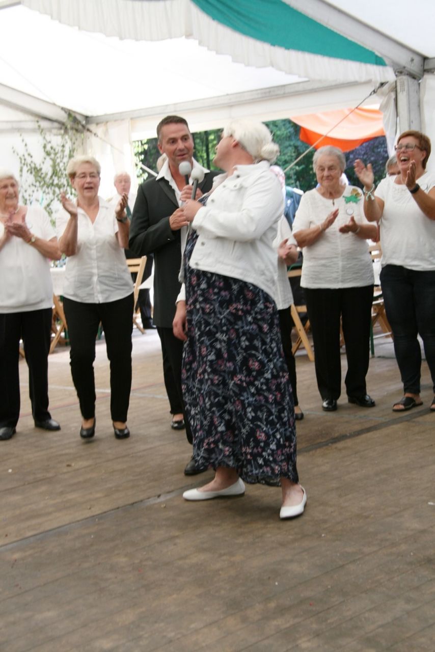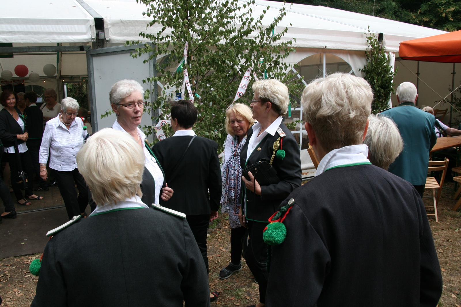 "DJ Ingolf" war dann für den musikalischen Part zuständig und die Damen ließen sich nicht lange Bitten: Mit einer Polonaise im und vor dem Zelt, begann nach der Kaffeetafel ein schwungvoller Nachmittag mit tollen Überraschungen! Die Theatergruppe Gaue mit Anneliese Schardelmann, Rita Mohrmann, Ina Laging, Karin Kluge, Annette Stallbohm und Günter Wünneker, brachte zwei Sketsche und strapazierte damit die Lachmuskeln aller Schützendamen. Der Auftritt der "Schlagerstars", Herren der "Piedelpoggen" (Björn Becker, Andreas Albers, Carsten Lüllmann und Thorsten Vielhauer) sangen im Playback, brachte dann das Zelt zum Beben, "Dancing Queen", ein Abba-Hit war die geforderte "Zugabe" der vier "Solisten"! Ein nicht endender Beifall begleitete sie von der Tanzfläche...