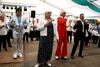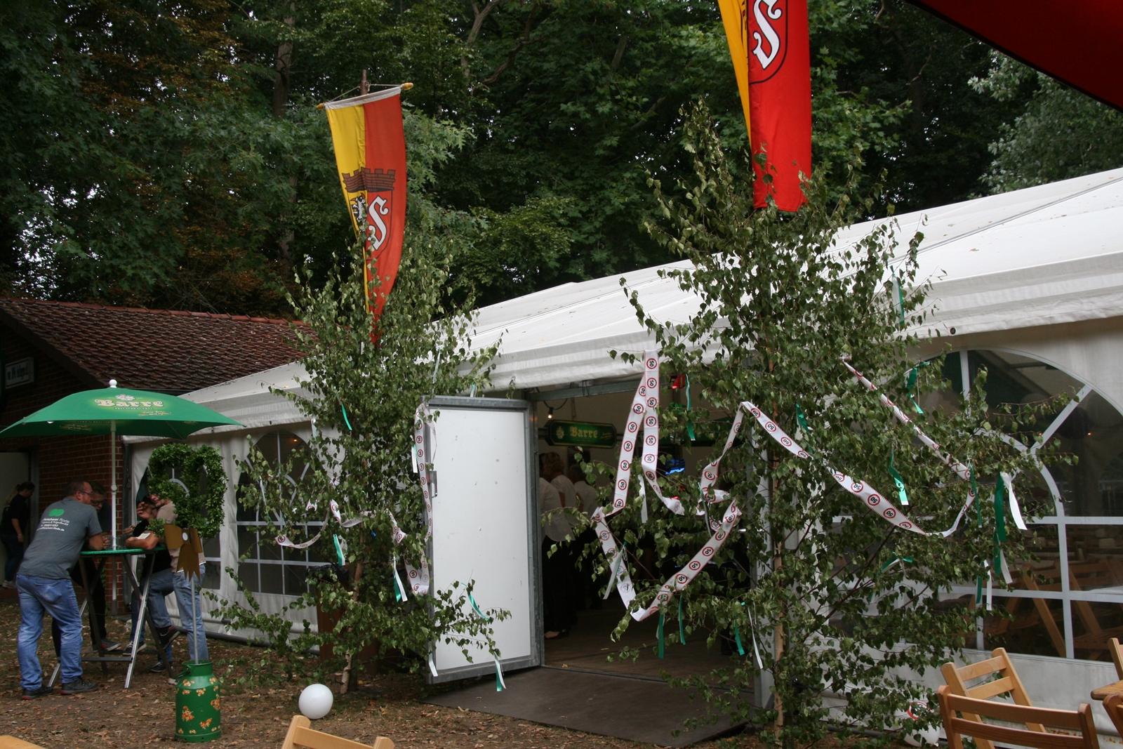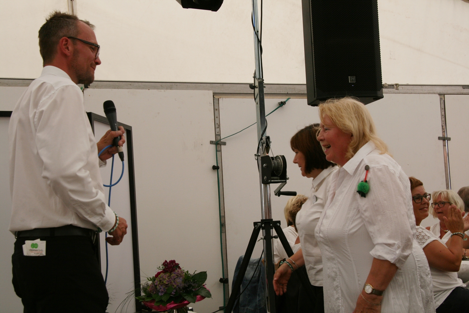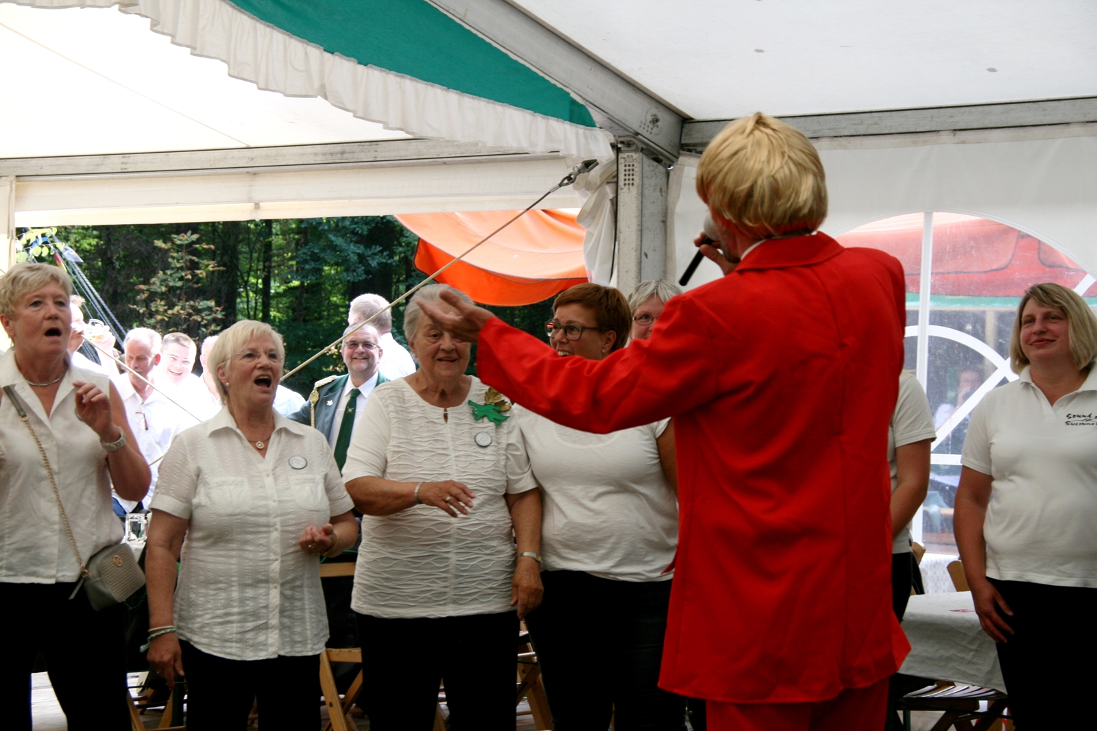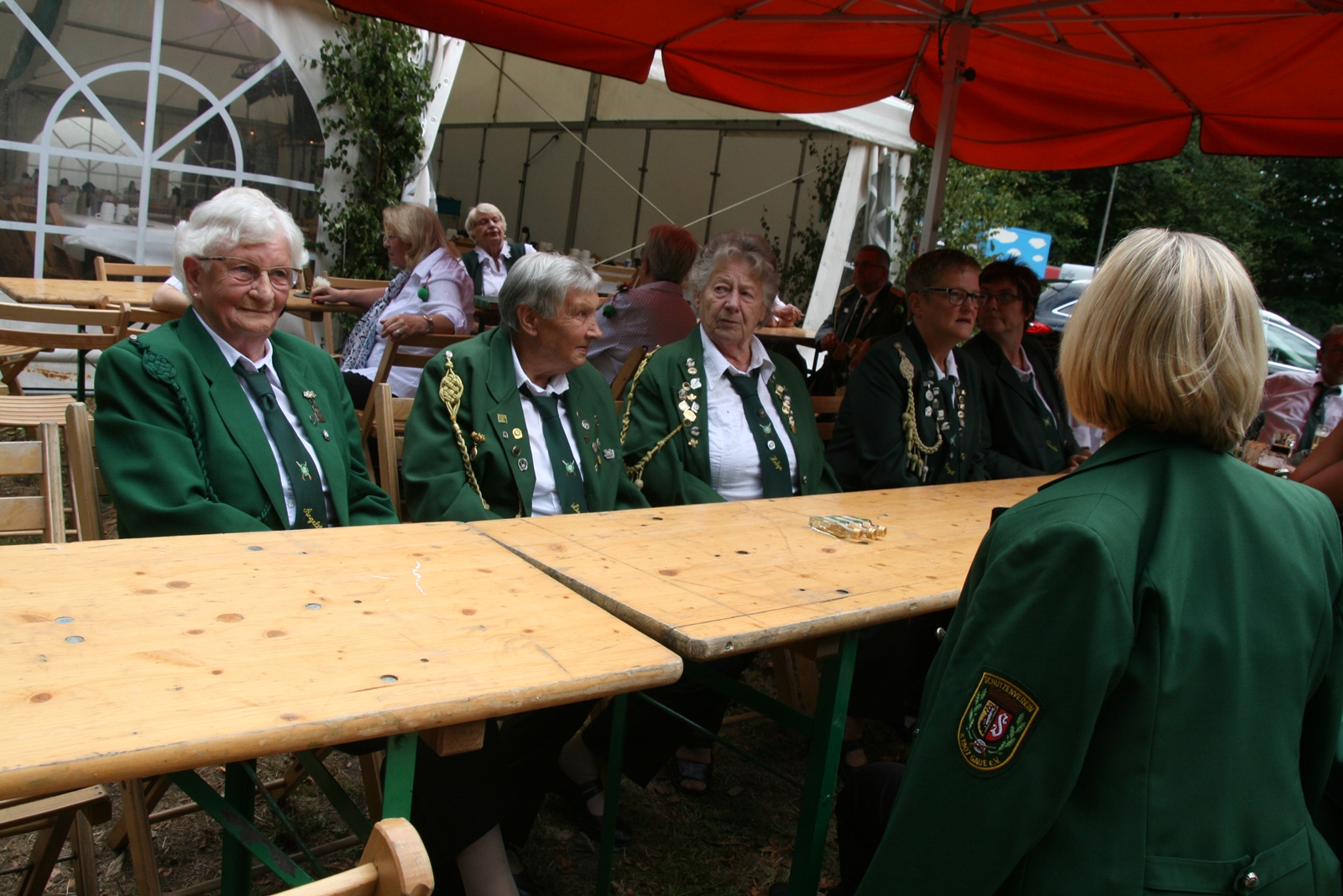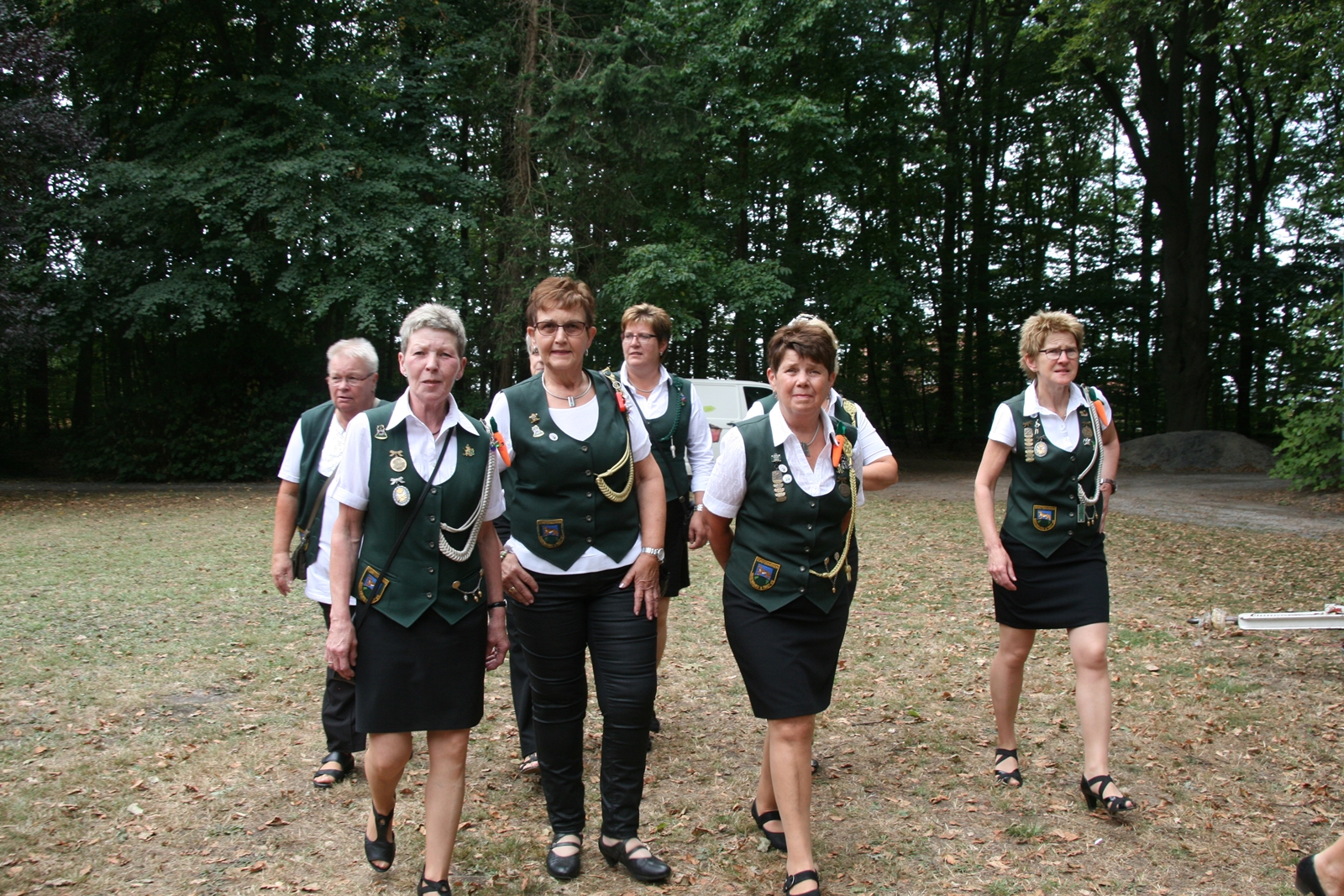 "DJ Ingolf" war dann für den musikalischen Part zuständig und die Damen ließen sich nicht lange Bitten: Mit einer Polonaise im und vor dem Zelt, begann nach der Kaffeetafel ein schwungvoller Nachmittag mit tollen Überraschungen! Die Theatergruppe Gaue mit Anneliese Schardelmann, Rita Mohrmann, Ina Laging, Karin Kluge, Annette Stallbohm und Günter Wünneker, brachte zwei Sketsche und strapazierte damit die Lachmuskeln aller Schützendamen. Der Auftritt der "Schlagerstars", Herren der "Piedelpoggen" (Björn Becker, Andreas Albers, Carsten Lüllmann und Thorsten Vielhauer) sangen im Playback, brachte dann das Zelt zum Beben, "Dancing Queen", ein Abba-Hit war die geforderte "Zugabe" der vier "Solisten"! Ein nicht endender Beifall begleitete sie von der Tanzfläche...