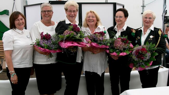 Vizepräsidentin Bärbel Müller mit Damen der ersten Stunde von links: (Annette Fischer, in Vertretung ihrer verstorbenen Mutter Anneliese Staats, welche 1975 Landesmeisterin mit dem Luftgewehr wurde), Wilhelma Ripke, Inge Wendland, Traute Ripke u. Ursel Windhorst.