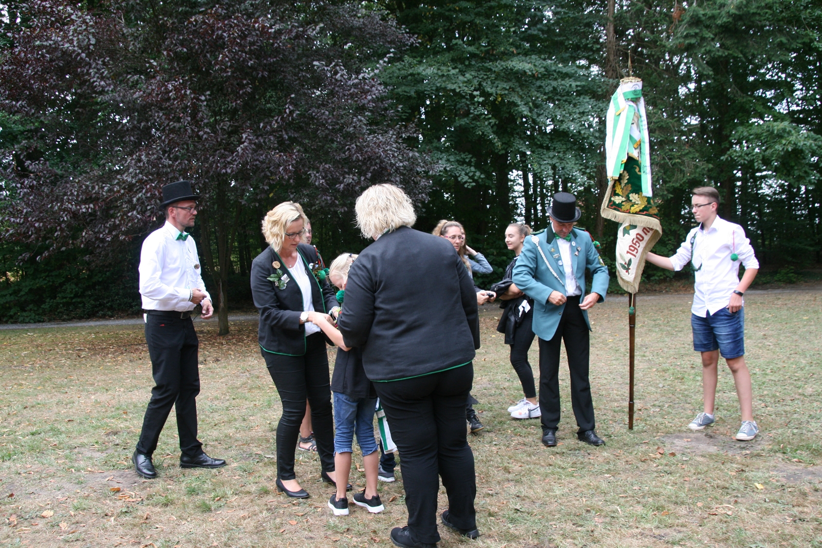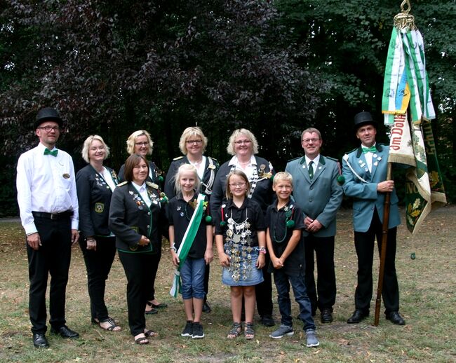 Von links, hinten: Präsident Andreas Albers,die Ehrendamen Petra Albers,Nicole Vielhauer,Adtju. Bianca Lüllmann,Königin Sandra Klinge, Prinzgewmahl Thomas Thomas Klinge,Fahnenträger Thorsten Vielhauer. Vorn von links: Vizepräsidentin Bärbel Müller, Ehrendame Amelie Vielhauer, Kinderkönigin Janika Klinge mit Begleiter Fynn Becker.