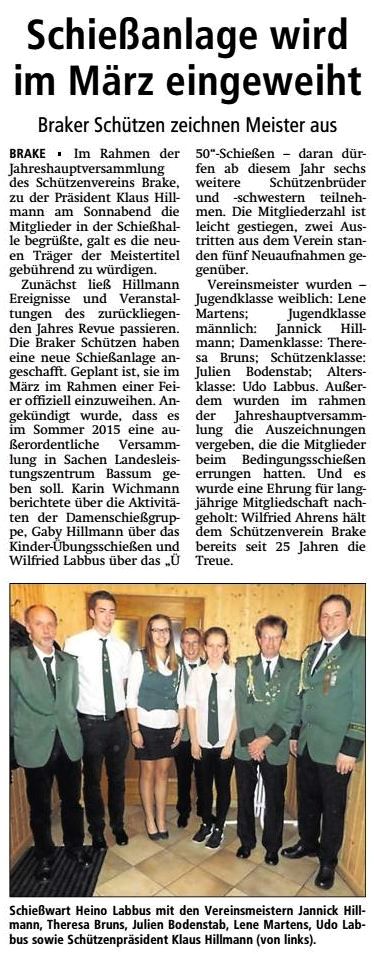 Bericht der SULINGER KREISZEITUNG vom 9. Januar 2015