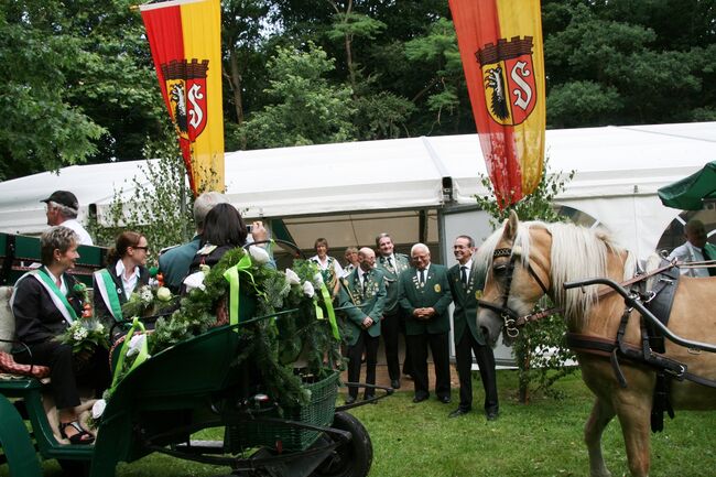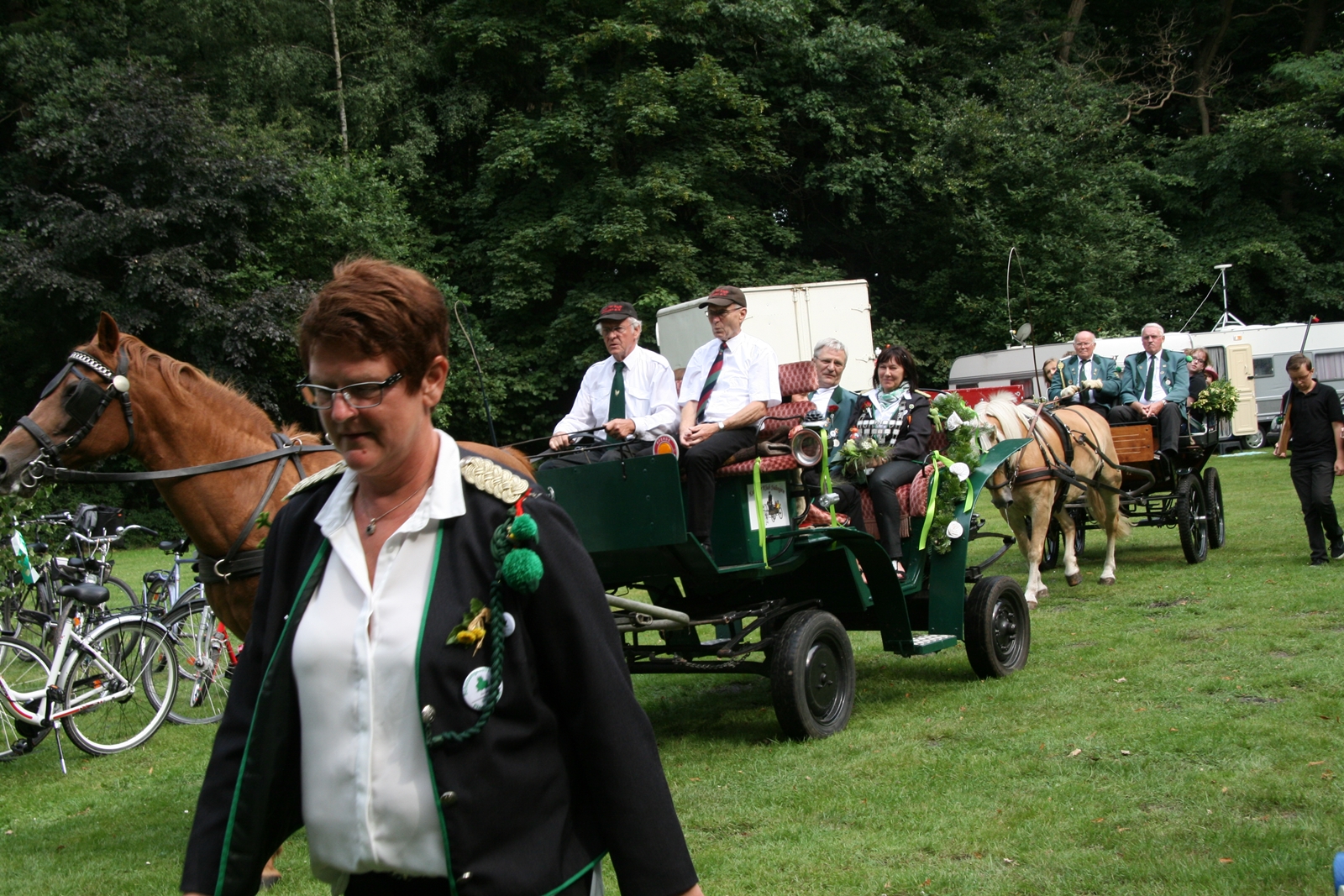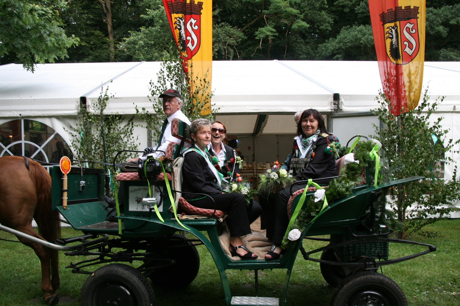 Ein Teil des Kreisverbandvorstands überraschte die Stellvertretende Pressewartin des KV III, Bärbel Müller zum Abschluß ihres "Königsjahres" bei der Schützengesellschaft von 1896 Sulingen. Sie waren im rechten Augenblick angekommen, so konnten sie den "Einmarsch" zum Festplatz/Zelt genau in Augenschein nehmen. Das "Fussvolk" mit der Marching-Band "Sound of Sulingen" vorweg, fuhren die Königspaare in zwei Kutschen vom "Kutscher Klub" vor.