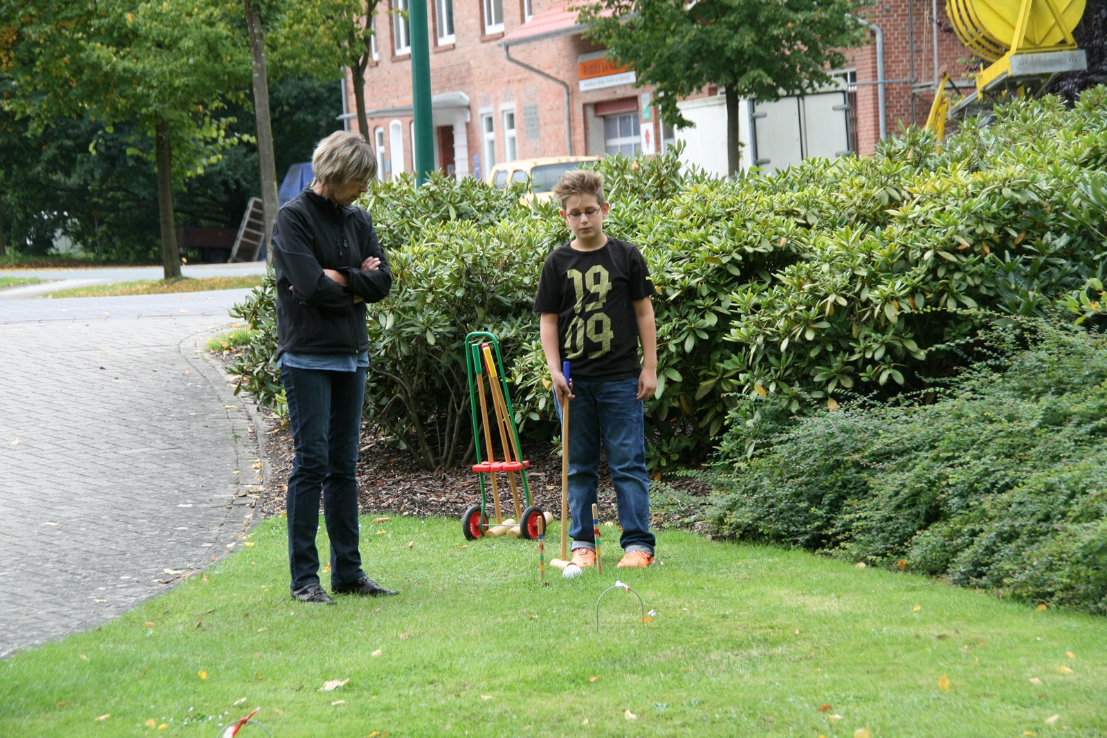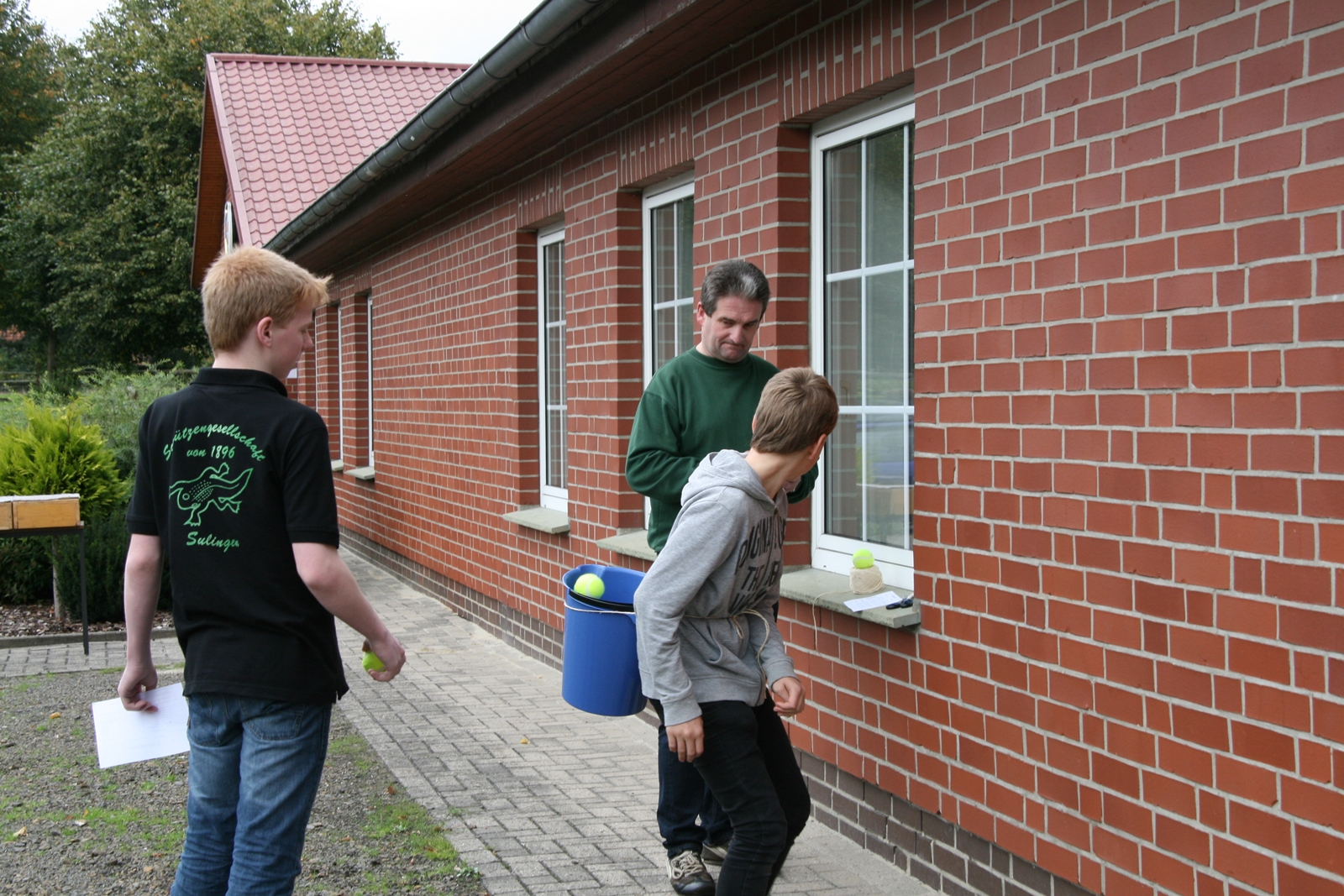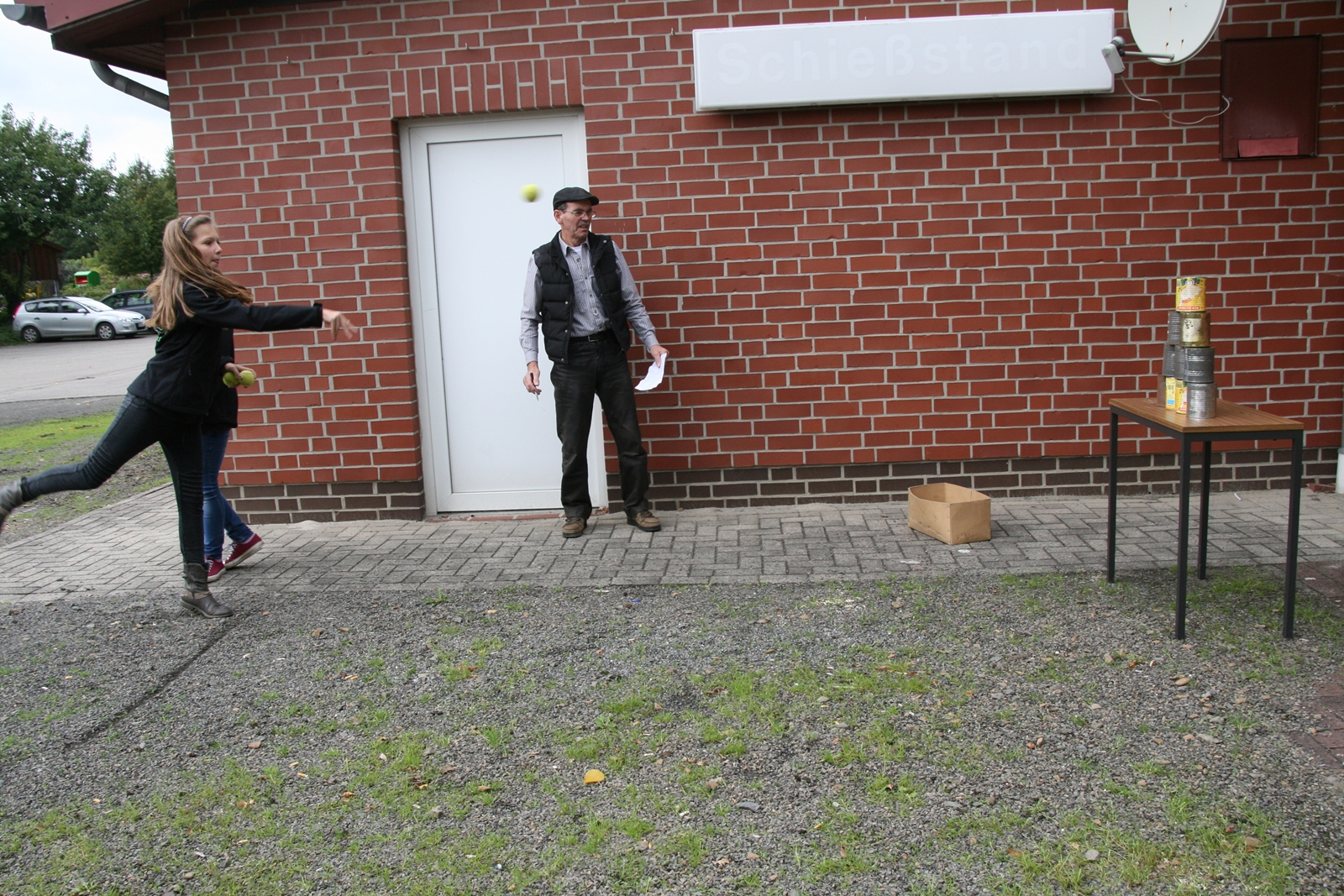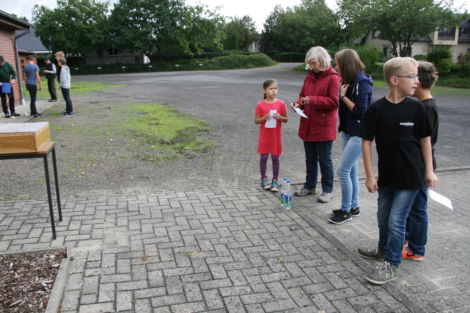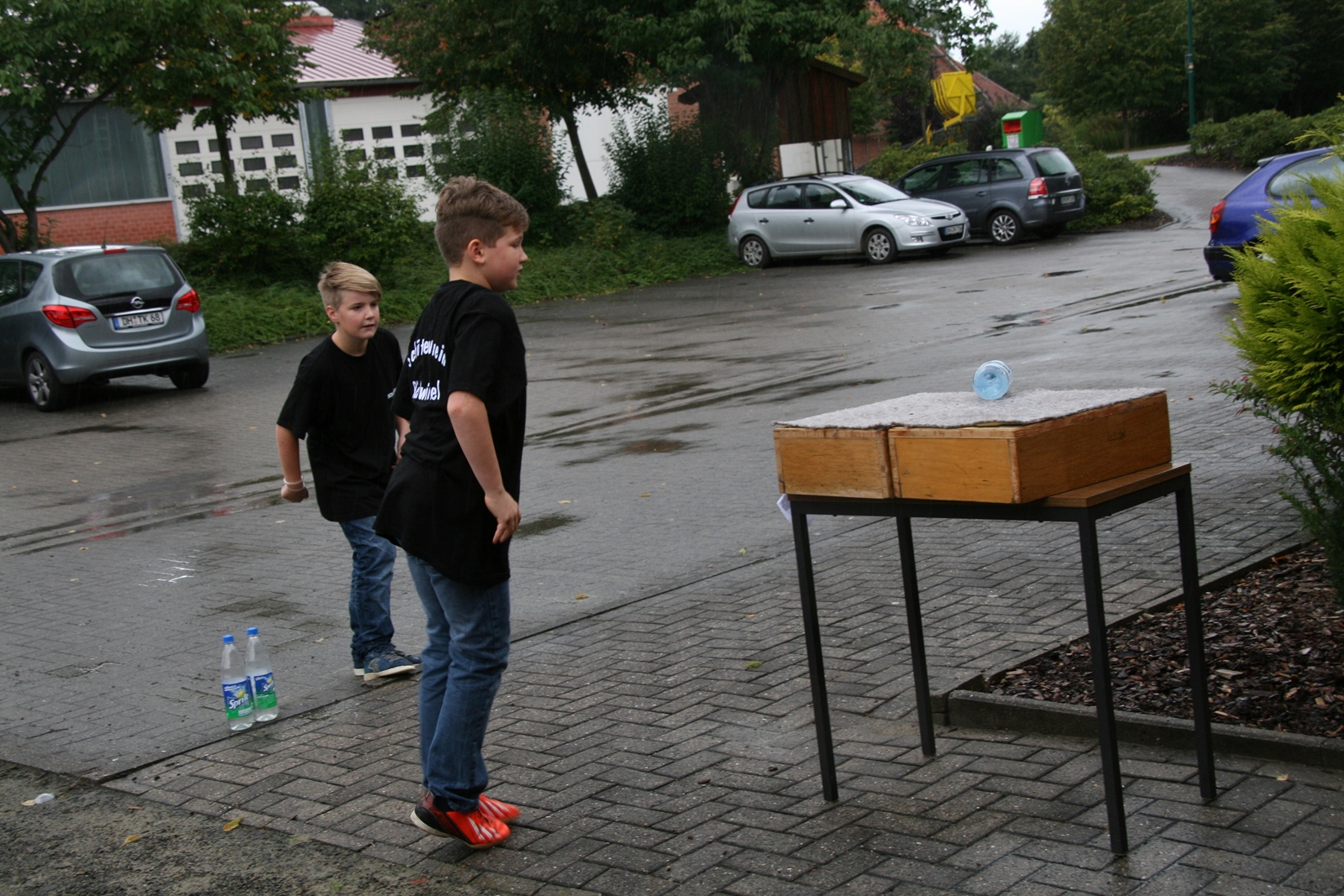 Im Aussenbereich wurden beim Cricket-Spiel die Schläge gezählt, das „Flaschendrehen“ erforderte viel Gefühl, den die Flaschen mussten sich beim Wurf einmal in der Luft “überschlagen“ und nach Möglichkeit auf dem Tisch stehen- oder liegenbleiben. Einen Tennisball mit einem auf dem Rücken befestigten Eimer auffangen, war auch nicht leicht. Das Dosenwerfen erforderte auch ein gewisses Maß an „Zielgenauigkeit“. Die Suche nach bestimmten Buchstaben in der richtigen Reihenfolge, im Aussenbereich, wurde mit „Geduld“ geschafft. Das Mikado-Spiel und der „Heiße Draht“, ist in der Schützenhalle absolviert worden. Unterbrochen wurden die Spiele leider durch ein Regenschauer, die Zeit wurde aber ausgenutzt um zu Essen, „Spaghetti Bolognese“.