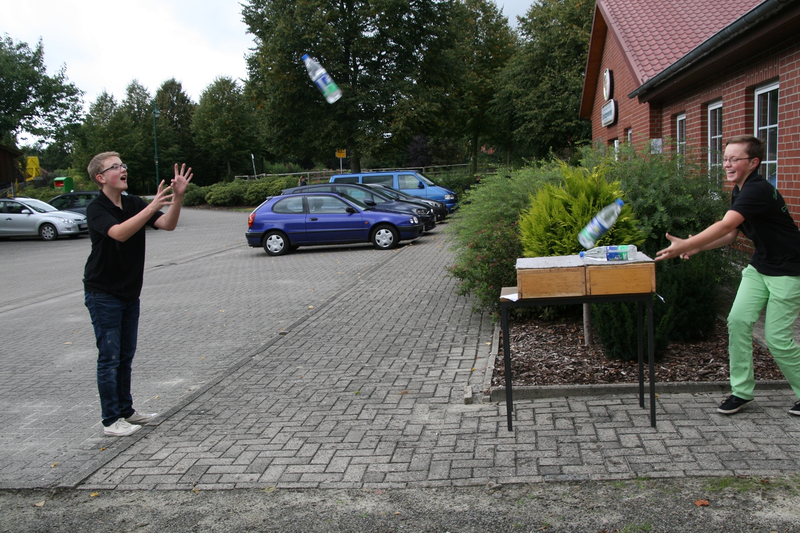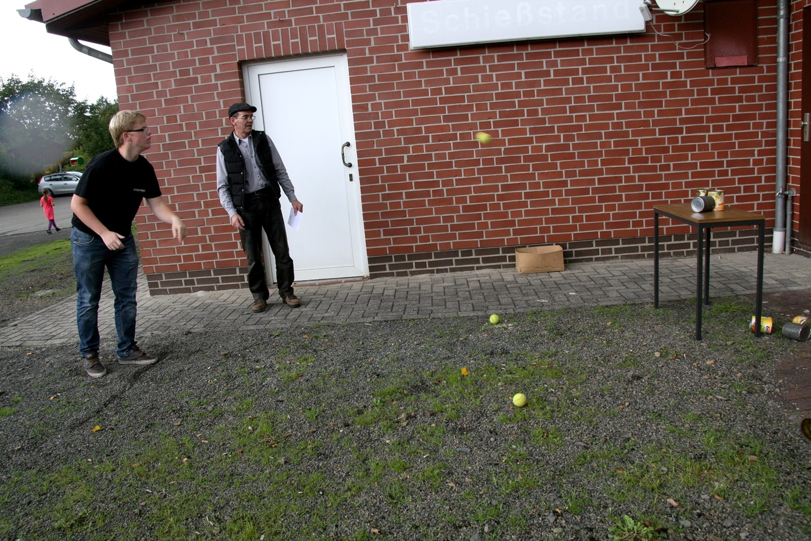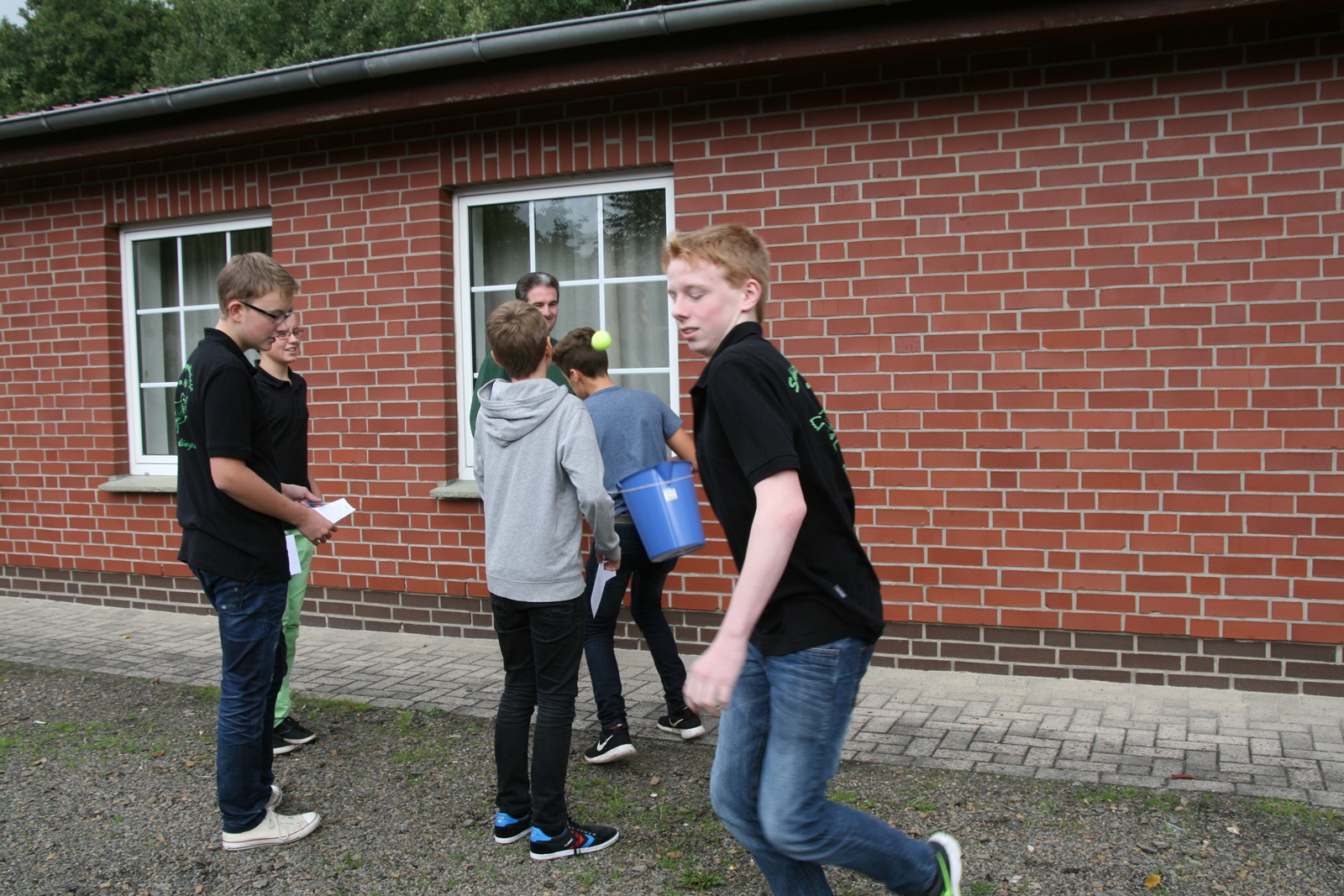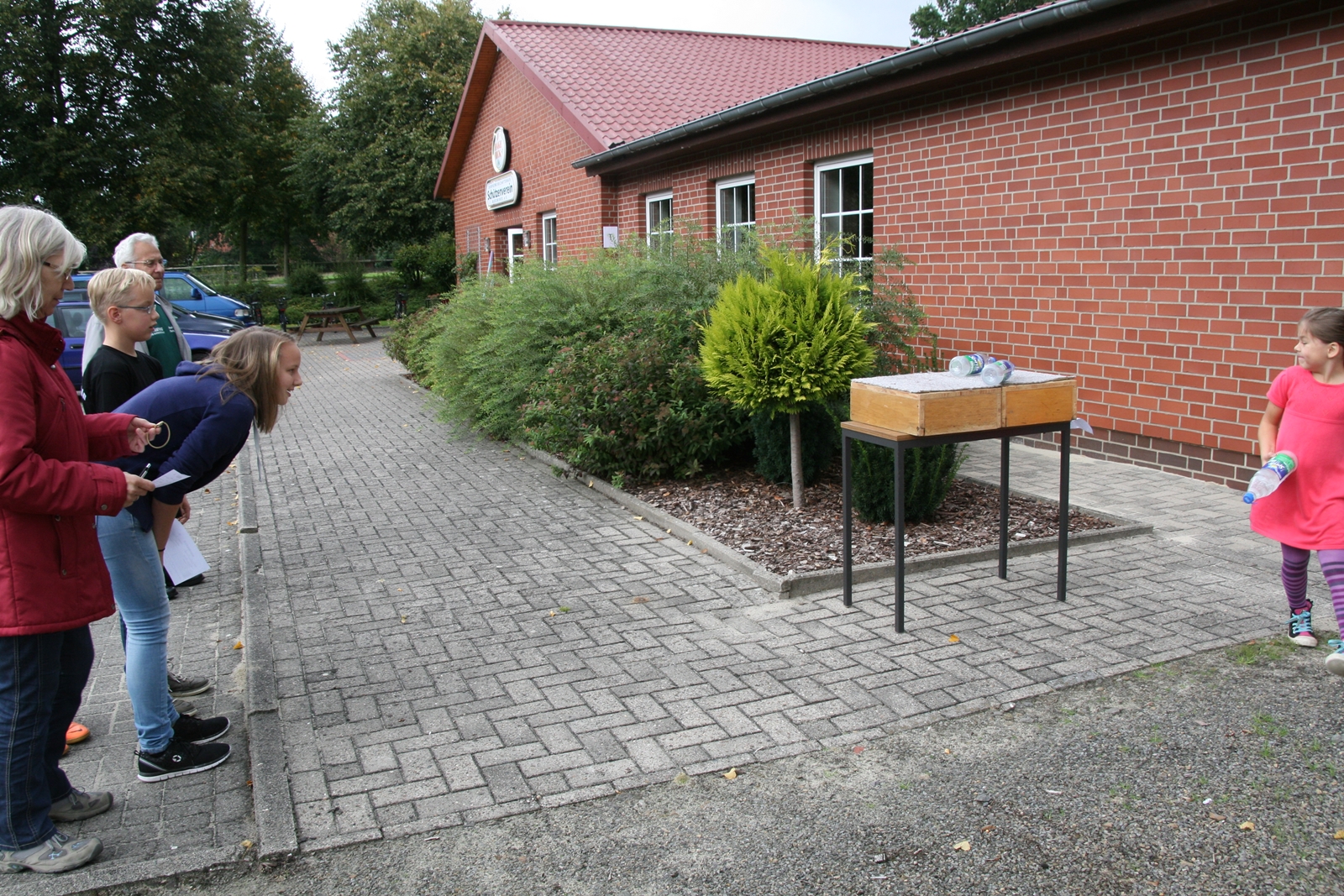 Im Aussenbereich wurden beim Cricket-Spiel die Schläge gezählt, das „Flaschendrehen“ erforderte viel Gefühl, den die Flaschen mussten sich beim Wurf einmal in der Luft “überschlagen“ und nach Möglichkeit auf dem Tisch stehen- oder liegenbleiben. Einen Tennisball mit einem auf dem Rücken befestigten Eimer auffangen, war auch nicht leicht. Das Dosenwerfen erforderte auch ein gewisses Maß an „Zielgenauigkeit“. Die Suche nach bestimmten Buchstaben in der richtigen Reihenfolge, im Aussenbereich, wurde mit „Geduld“ geschafft. Das Mikado-Spiel und der „Heiße Draht“, ist in der Schützenhalle absolviert worden. Unterbrochen wurden die Spiele leider durch ein Regenschauer, die Zeit wurde aber ausgenutzt um zu Essen, „Spaghetti Bolognese“.