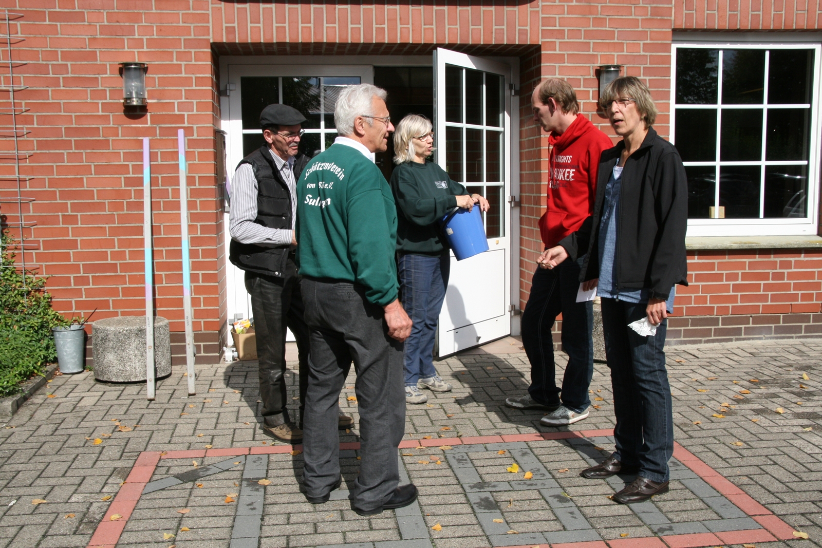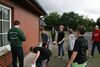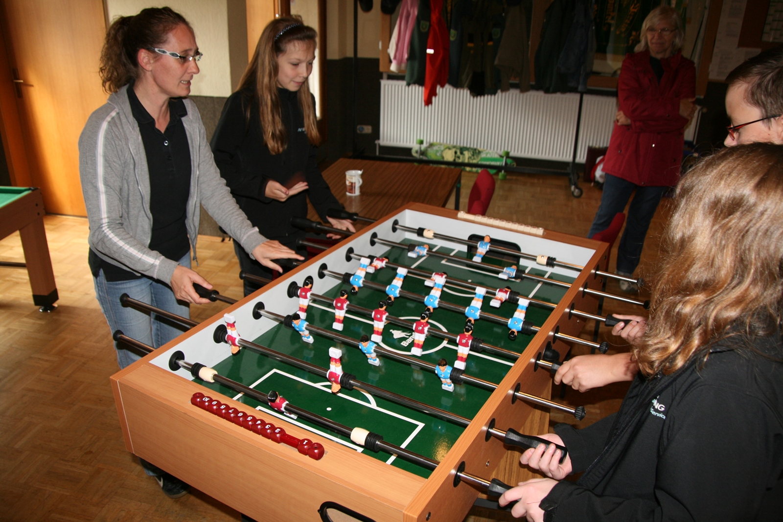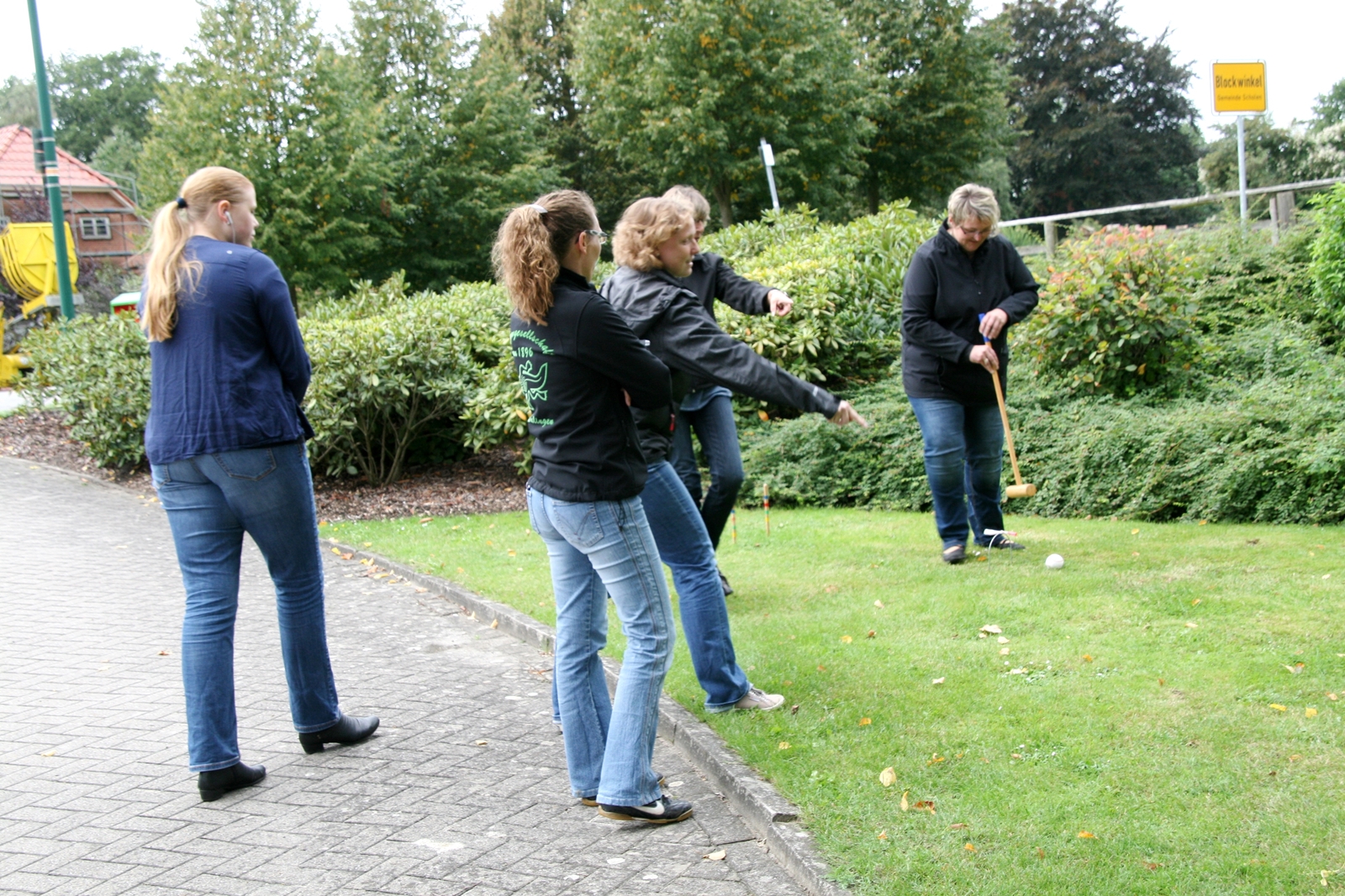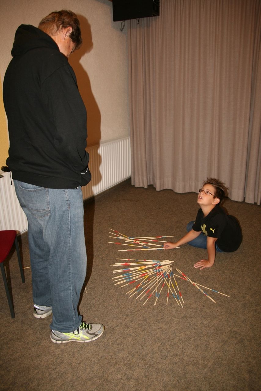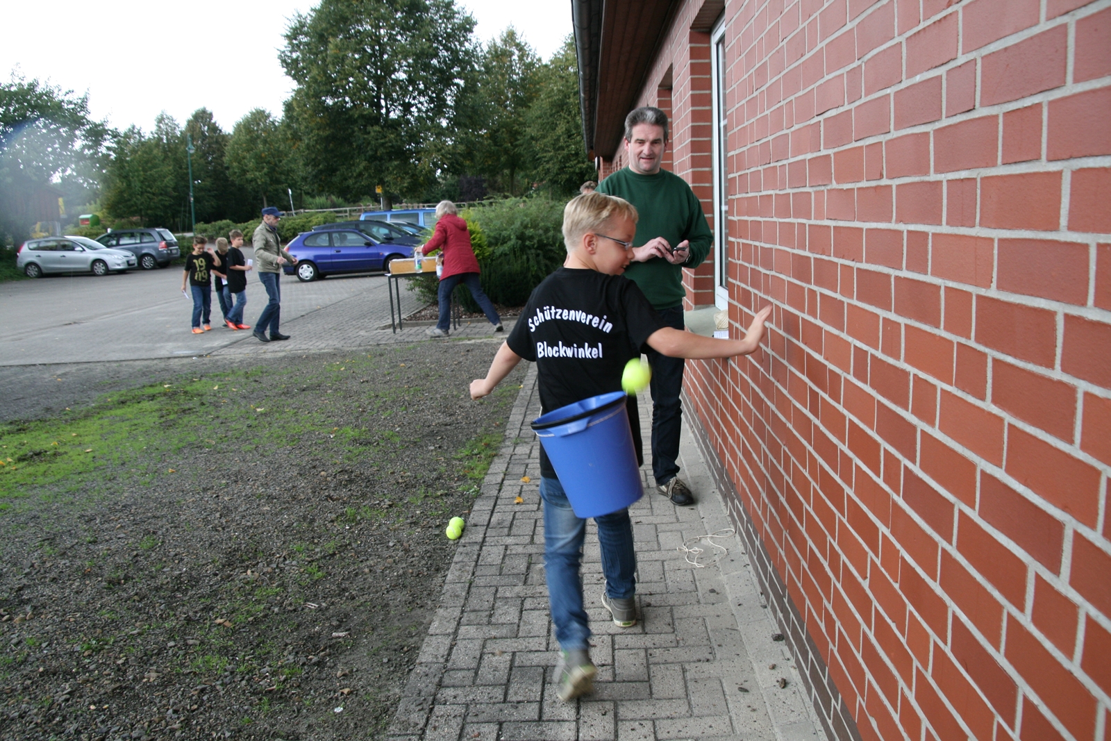 Im Aussenbereich wurden beim Cricket-Spiel die Schläge gezählt, das „Flaschendrehen“ erforderte viel Gefühl, den die Flaschen mussten sich beim Wurf einmal in der Luft “überschlagen“ und nach Möglichkeit auf dem Tisch stehen- oder liegenbleiben. Einen Tennisball mit einem auf dem Rücken befestigten Eimer auffangen, war auch nicht leicht. Das Dosenwerfen erforderte auch ein gewisses Maß an „Zielgenauigkeit“. Die Suche nach bestimmten Buchstaben in der richtigen Reihenfolge, im Aussenbereich, wurde mit „Geduld“ geschafft. Das Mikado-Spiel und der „Heiße Draht“, ist in der Schützenhalle absolviert worden. Unterbrochen wurden die Spiele leider durch ein Regenschauer, die Zeit wurde aber ausgenutzt um zu Essen, „Spaghetti Bolognese“.