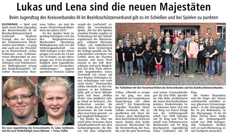 Lukas Goldmann vom SV Blockwinkel ist Jugendkönig und Lena Löhmann vom SV Mallinghausen errang den Kinderkönigstitel, sie sind die neuen Kreisverbands-Majestäten des Jahres 2015