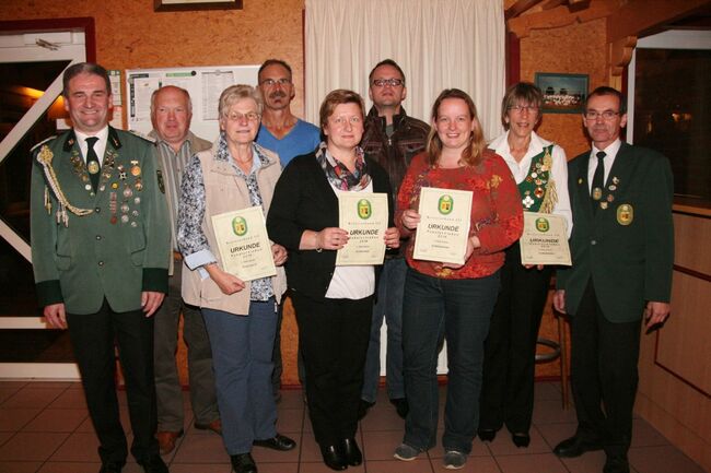 von links: Sportleiter Udo Bolte, Hermann Schoof, Marlies Immoor-Koopmann, Tagesbester Udo Jaschkowske, Kreiskönigin Hella Denker, Andreas Albers, Britta Löhmann, Sabine Prochazka, Präsident Dieter Lüdeke.