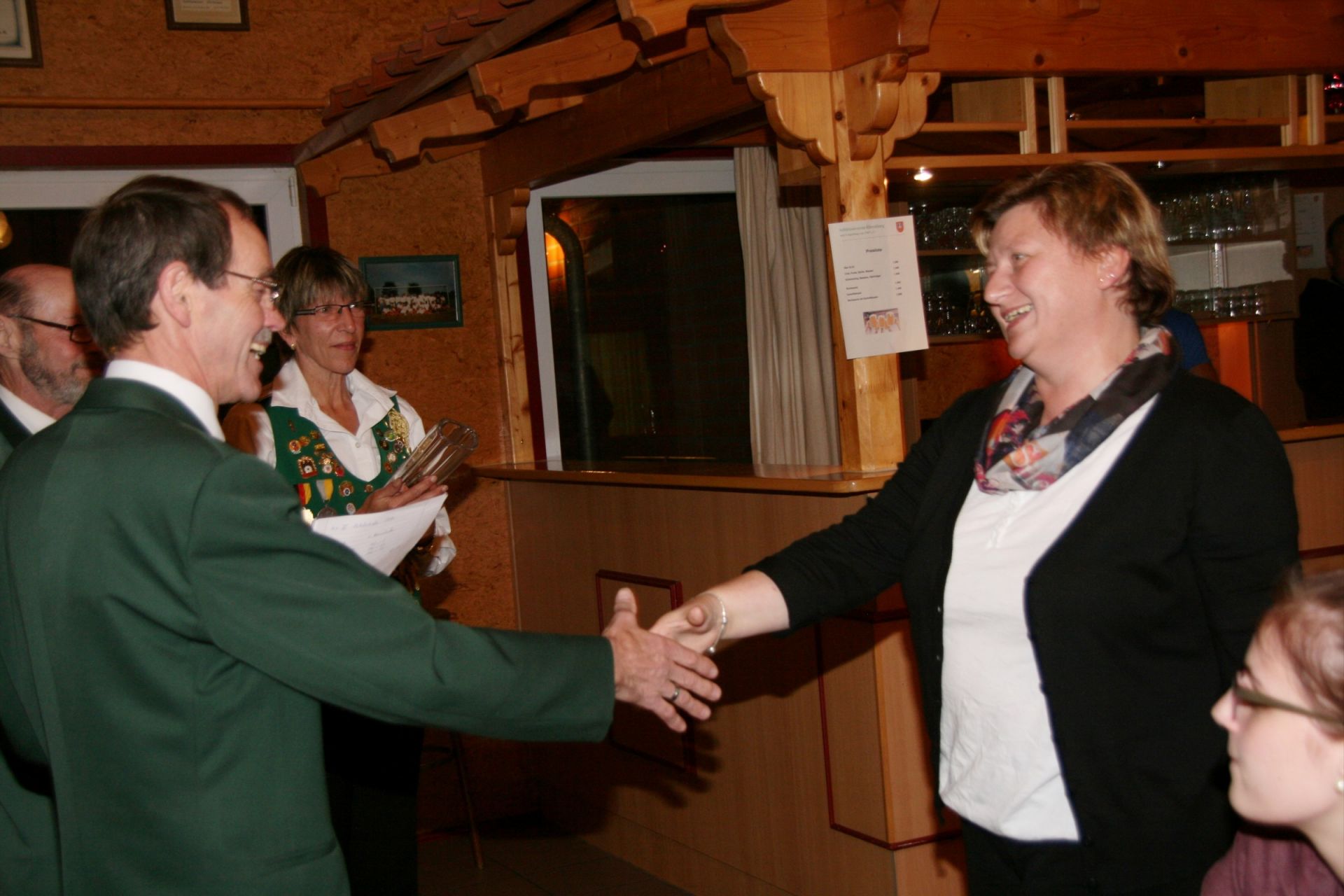 Nach dem Verkünden der Ergebnisse des Königsschießens, nahm Hella Denker den herzlichen Glückwunsch von KV-Präsident Dieter Lüdeke, glücklich entgegen, 98 Ringe war schon eine Spitzenleistung! Hermann Schoof vom SV von 1848 Sulingen, nahm Rang zwei mit 94 Ring ein, es folgten Frank Ruröde vom SV Brake mit 93 und Bärbel Müller von der SG von 1896 Sulingen mit 90 Ringen.