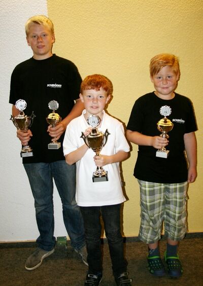 Von links: Paul Stein KV III-Jugendkönig u. 1. beim Spielewettbewerb, Erik Heitmann KV III-Kinderkönig, Tim Bischoff ebenfalls 1. beim Spielewettbewerb.