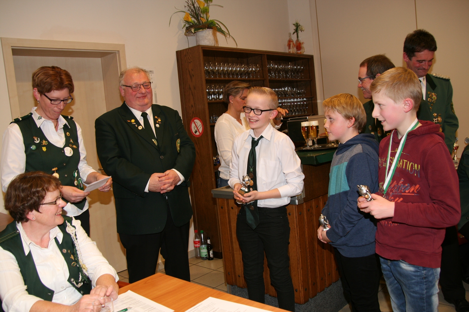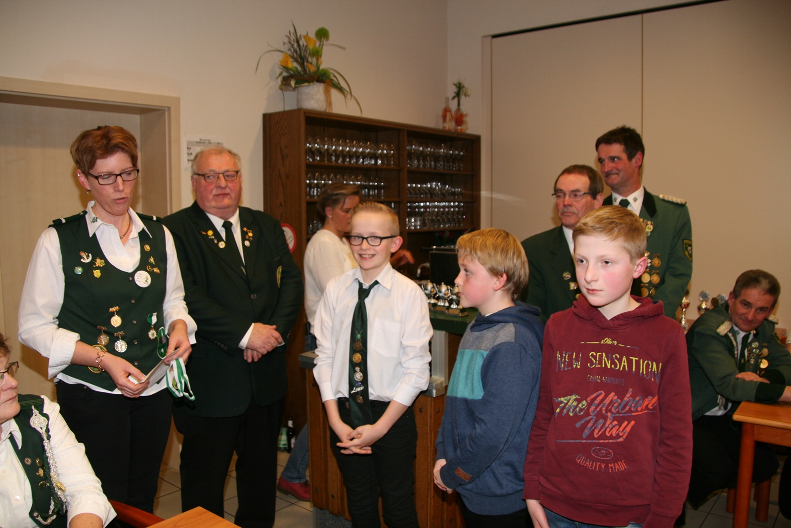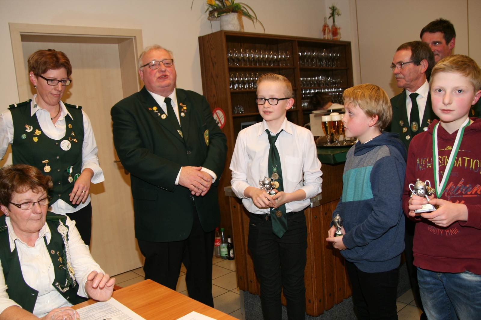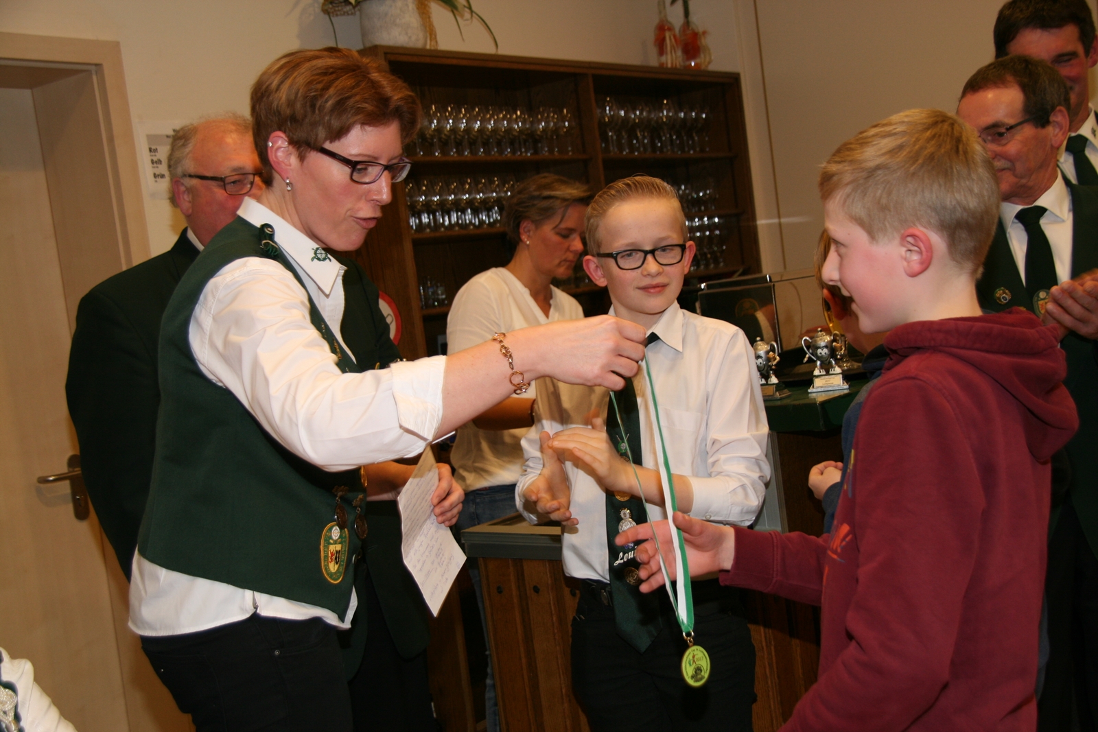 Claudia Reuter begann ihre Laudatio mit einem Rückblick auf die Leistungen der drei jungen Schützen. Jan Thiele, Konstantin Belke und Louis Löhmann bescheinigte sie auch für dieses Jahr eine tolle Steigerung ihrer Leistungen beim Lichtpunktschießen. Erfolgreich nahmen sie an der Kreis-, Bezirks- und Landesverbandsmeisterschaft teil, das Leistungszentrum des Nordwestdeutschen Schützenbundes (NWDSB - LLZ) in Bassum war auch ein gutes „Pflaster“ für sie. Zur Erinnerung: zum Norddeutschland Cup qualifizieren sich nur die besten Lichtpunktschützen aus den Landesverbänden! Es ist schon eine besondere Ehre, überhaupt daran teilnehmen zu dürfen für die noch recht jungen Sportschützen. In diesem Jahr wurden 155 Starts beim 3. Norddeutschland Cup gezählt. Mit der Lichtpunktpistole freihand Schüler B, errang Louis Löhmann eine Goldmedaille und in der gleichen Klasse nahm Jan Thiele die Silbermedaille in Empfang! Konstantin Belke errang mit der Lichtpunktpistole Auflage in der Schülerklasse C eine Goldmedaille. Das ist schon sehr bemerkenswert, bei solch einer großen Konkurrenz auf dem „Treppchen“ zu stehen! Louis und Jan nahmen zudem auch noch am 1. NWDSB Lichtpunkt Target Sprint Kids Cup teil (Biathlon ähnlich), in der Schülerklasse B hatte sich Jan auf den ersten- und Louis auf den dritten Platz „vorgeschoben“!