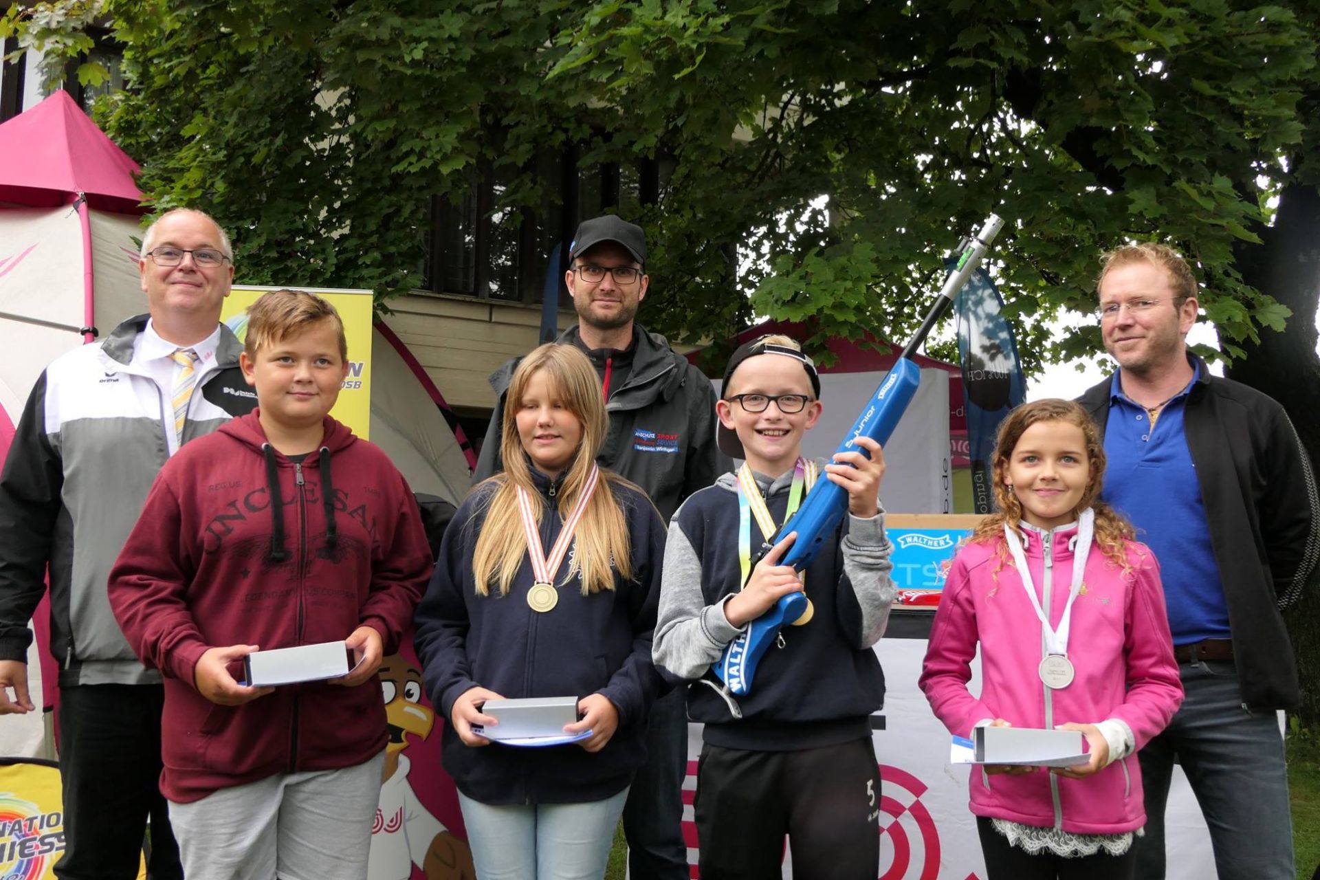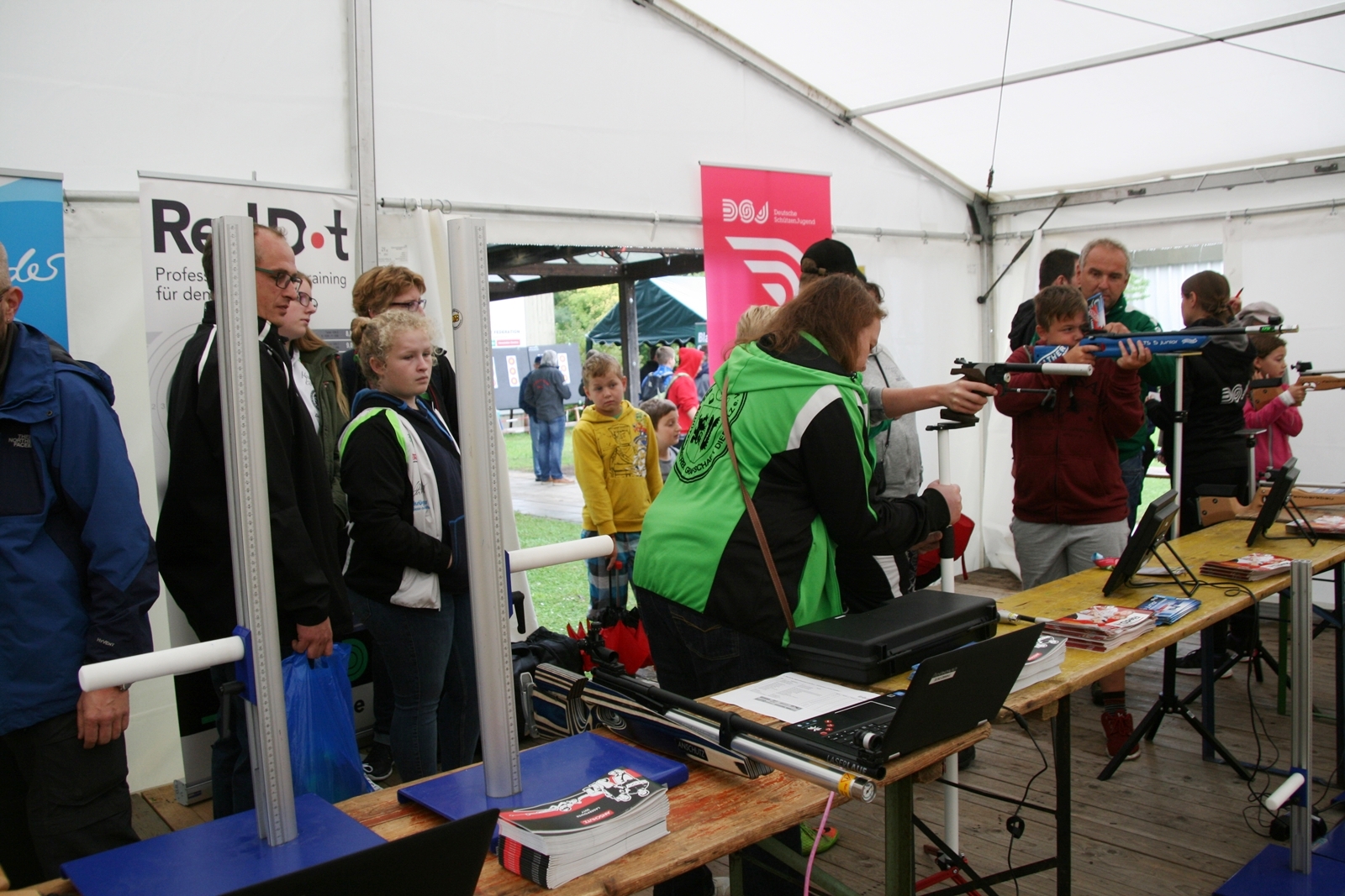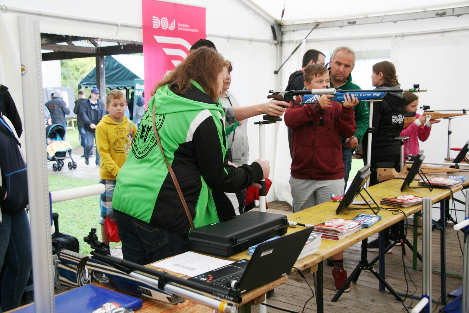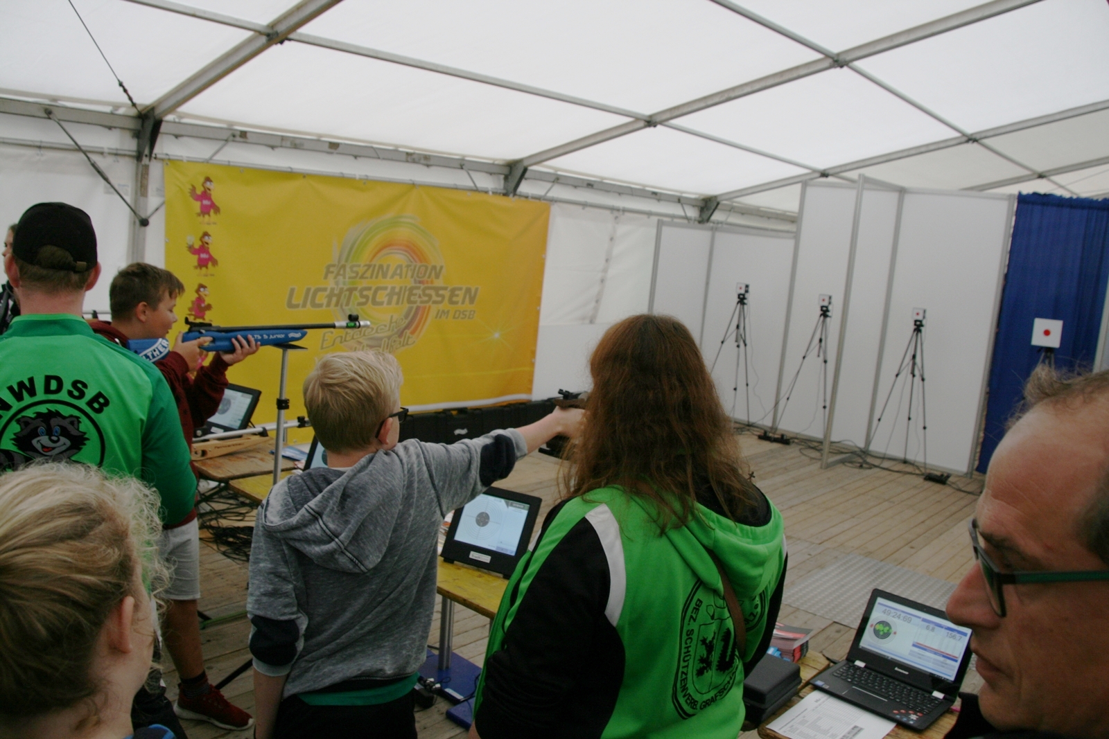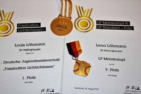 Louis Löhmann hatte am 1. September ab 12:00 Uhr seinen Lichtpunktwettkampf bestritten. Es wurden allgemein-sportliche Disziplinen ausgetragen. Auf das Laufen wurde wegen der regnerischen Witterung verzichtet. So standen den Kindern in den verschiedenen Altersgruppen mehrere Spiele zur Auswahl. Louis wählte Seilspringen, Ringzählwerfen, Puzzlespiel und am Schluß Lichtpunktpistole Auflage. Insgesamt reichten zum Sieg in seiner Altersgruppe U11 276 Punkte. Dafür erhielt er eine Goldmedaille, einen Gutschein und ein Lichtpunktgewehr. Das nicht nur er sich darüber sehr freute, ist klar.