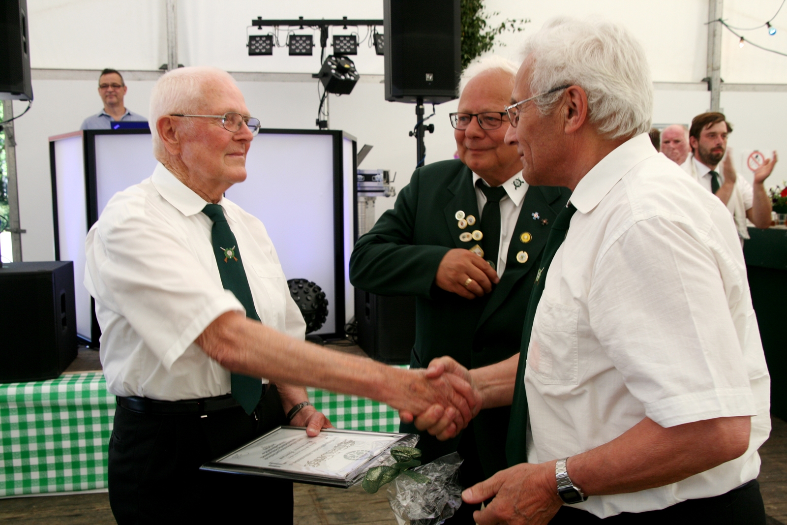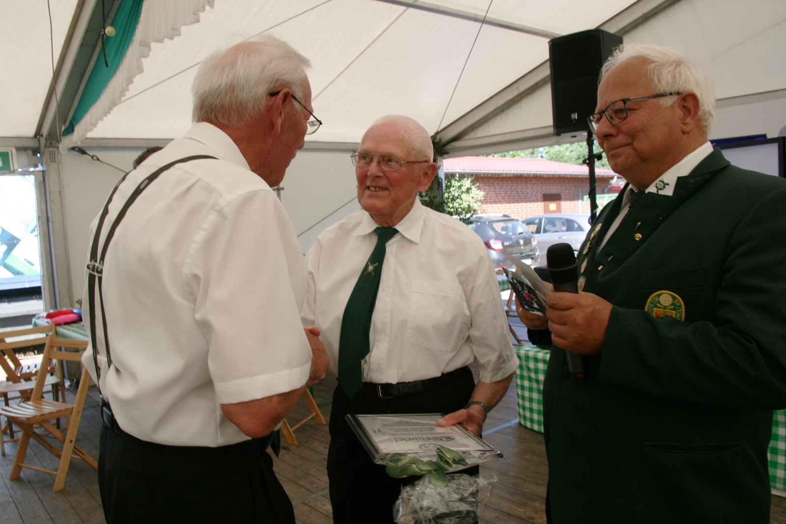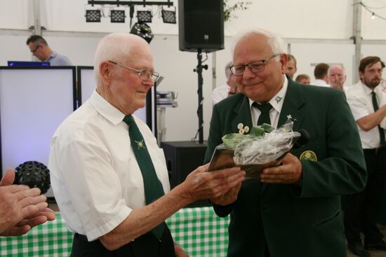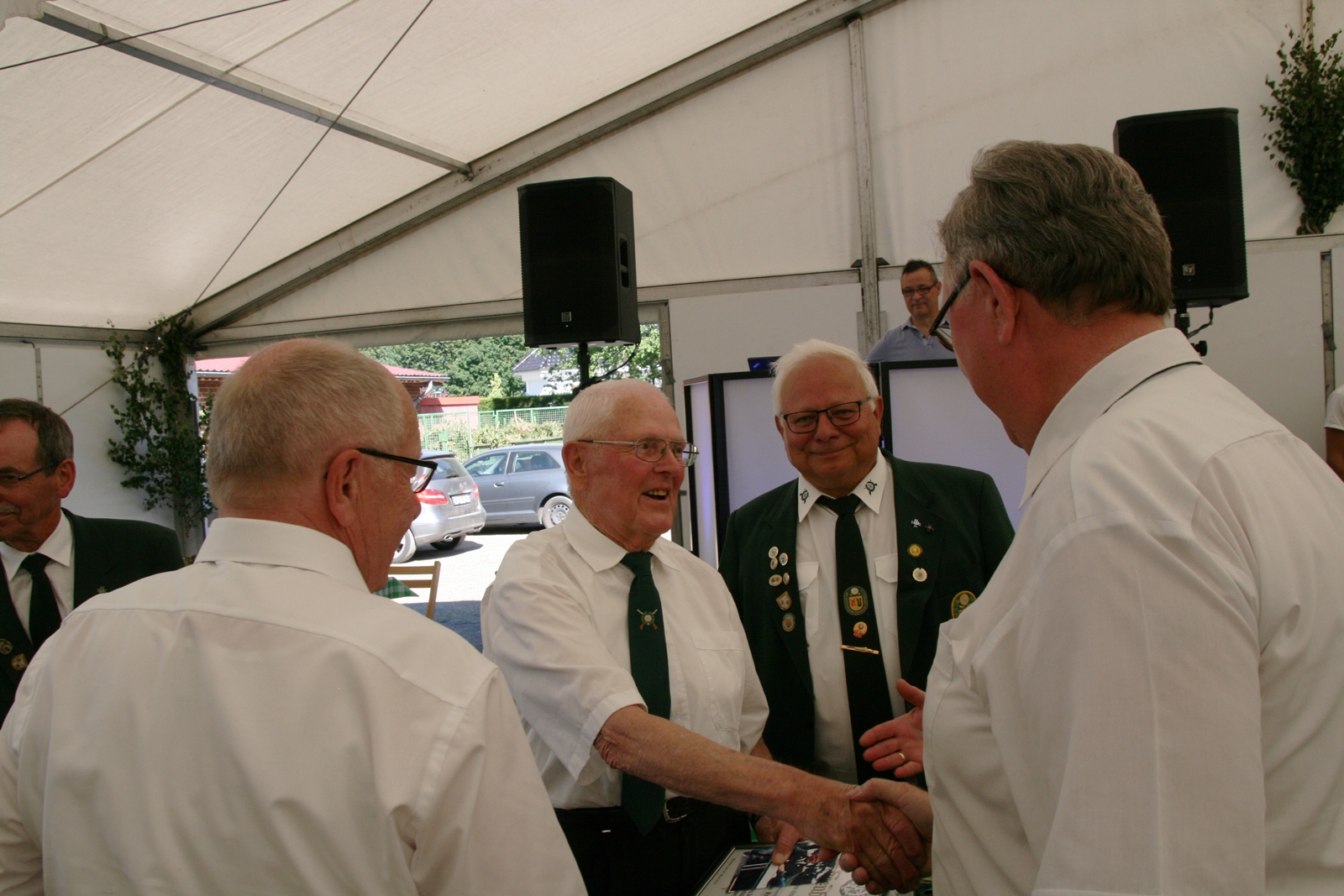 Günter Herzig und Dieter Lüdeke waren die ersten Gratulanten, welche ihm zu dieser Auszeichnung herzlich die Hand schüttelten, viele Schützinnen und Schützen folgten diesem Beispiel. Unter ihnen Vereinspräsident Christoph Neumann, sowie die „alten Vereinspräsidenten“ Horst Schröder und Helmut Riedemann.