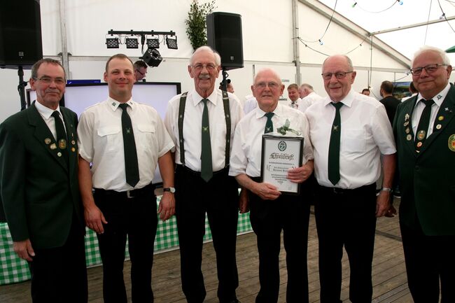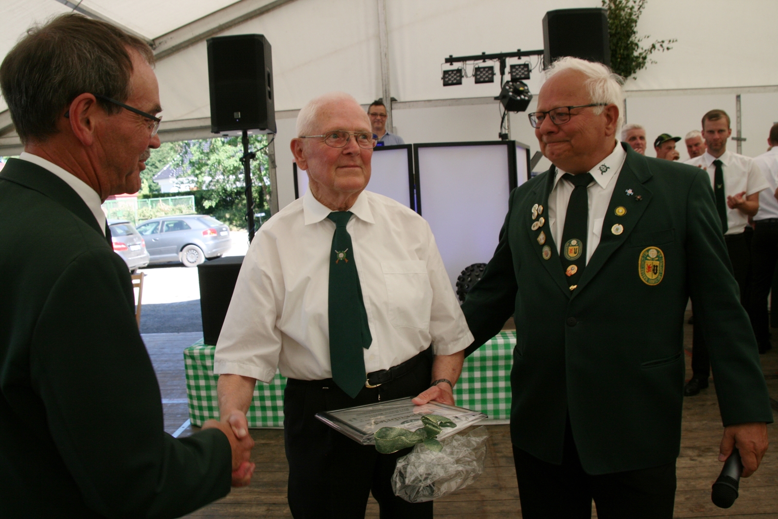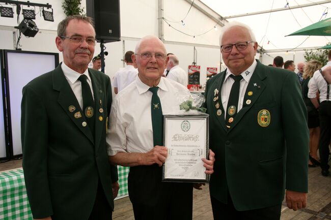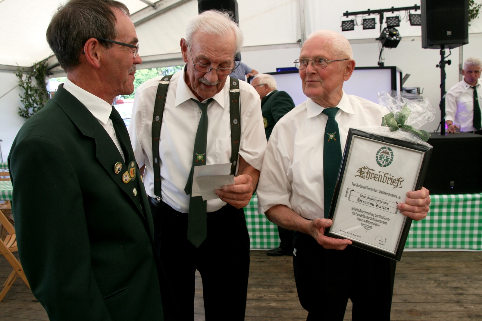 Sie möchten einen Schützenbruder ehren, der sich Jahrzehnte für das Schützenwesen, auch über die Vereinsgrenzen hinaus, eingesetzt hat und in diesem Jahr seinen 80. Geburtstag feiern wird. So möchten wir Hermann Hartau zu uns nach vorne bitten.