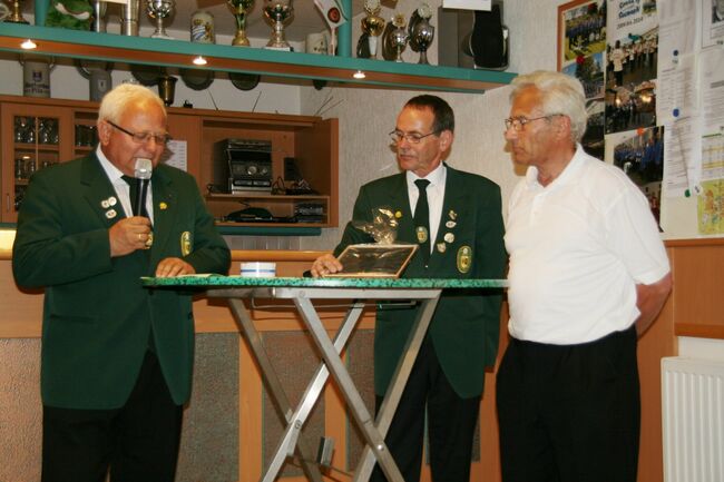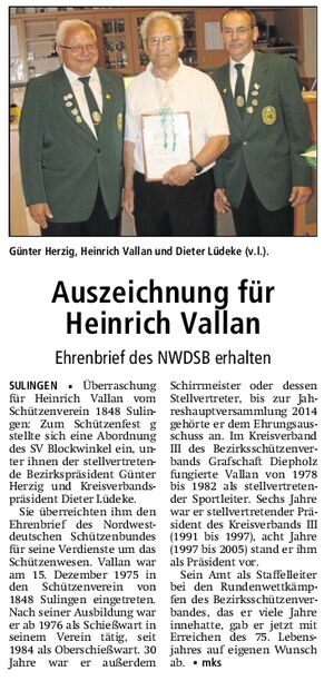 Kurz nach dem 13. "Matjes-Essen" anlässlich des Schützenfestes der "Ützen", überreichten Günter Herzig als Vizepräsident des Bezirksschützenverbandes Grafschaft Diepholz und Dieter Lüdeke, Präsident des Kreisverbandes III, Heinrich Vallan den Ehrenbrief des Nordwestdeutschen Schützenbundes.