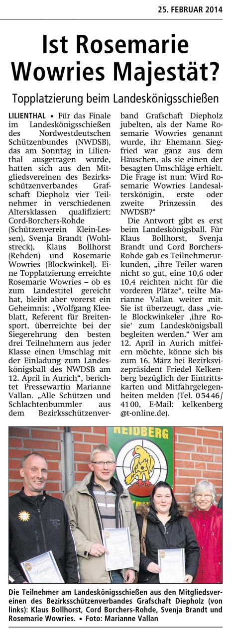 Am Abend des 12. April werden wir es nach der Proklamation der neuen Majestäten auf dem NWDSB-Landeskönigsball wissen. Bis dahin "Daumendrücken".
