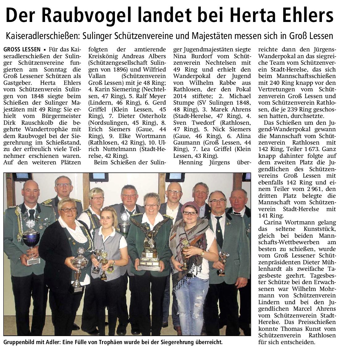 Das traditionelle "Kaiser-Adler-Schießen"der Sulinger Vereine findet seit 1974 jedes Jahr statt. Verbunden mit dem Ausschießen des "Jürgens-Wanderpokal", wurde der Wettkampf wieder von allen Vereinen der Stadt besucht. Der Wander-Pokal der Jugend wurde von 7 Vereinen wahrgenommen. Der Schützenverein Groß-Lessen war Ausrichter, hatte doch Rainer Gaumann den "Adler" im vergangenen Jahr als König nach Groß Lessen "entführt".