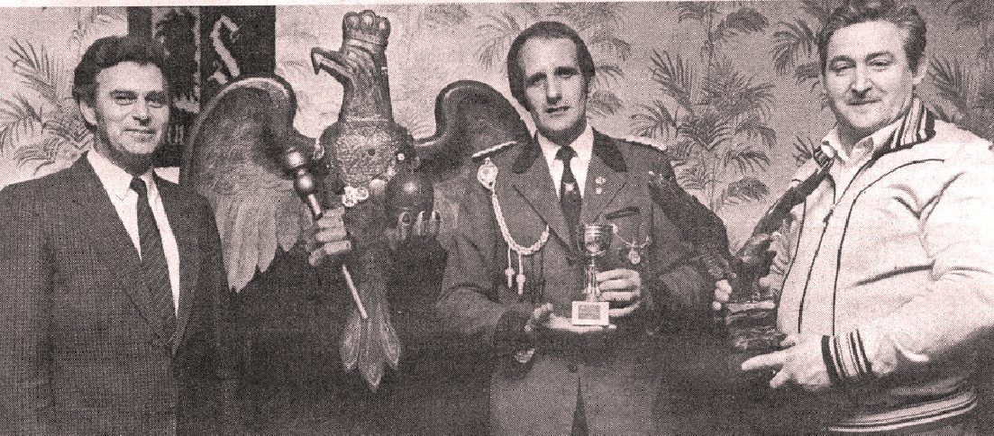 1985 wurde beim SV Stadt-Herelse erstmals ein "handlicher" Adler ausgeschossen, er wurde vom damaligen Bürgermeister der Stadt Sulingen Werner Kling gestiftet. Das Foto zeigt Bürgermeister Werner Kling, den "alten" Adler (1974 von der Fima Wilhelm Ranck gestiftet), Präsident Hermann Ehlers und Werner Möse, stellvertretend für König Ludwig Hamacher vom SV Nordsulingen, mit dem "neuen" Adler.(Foto Egon Nerger)