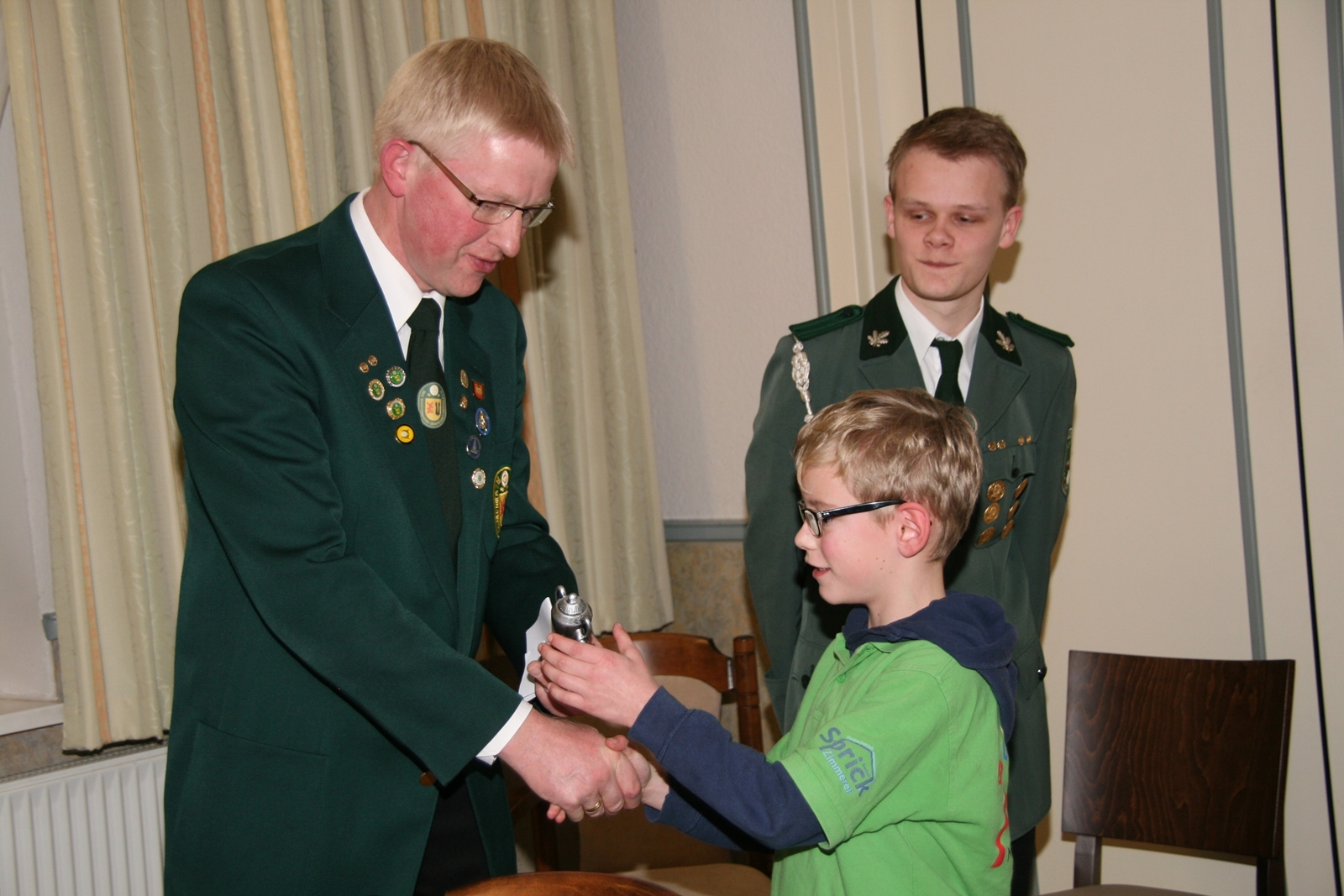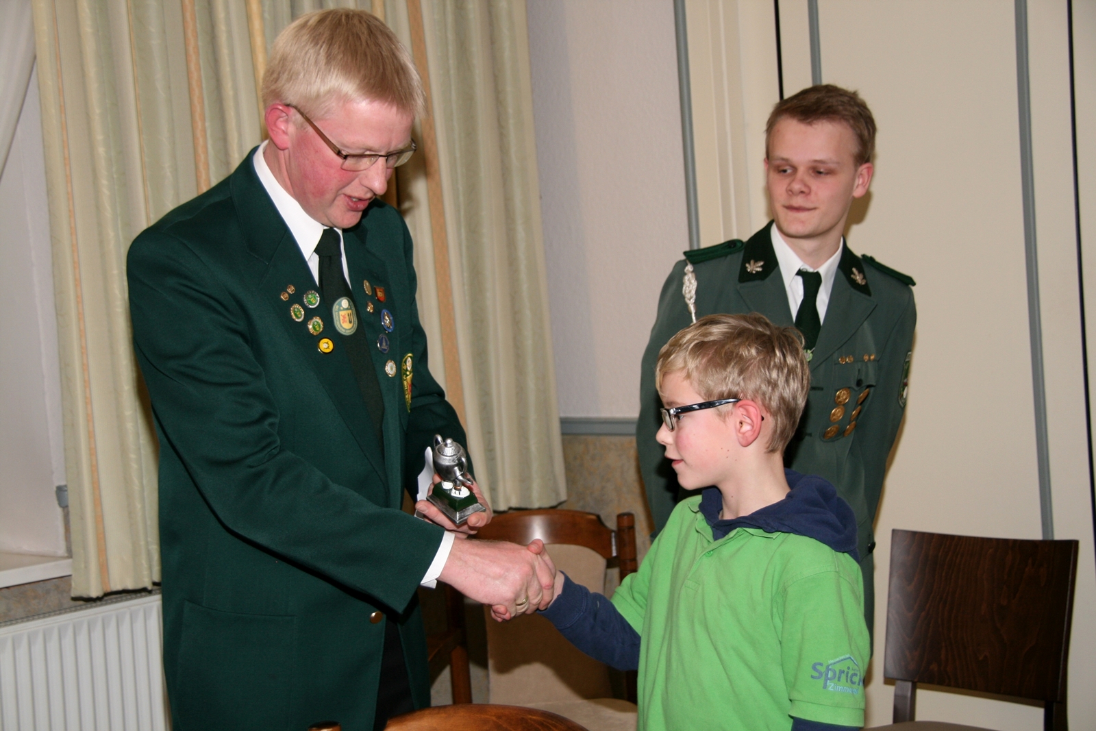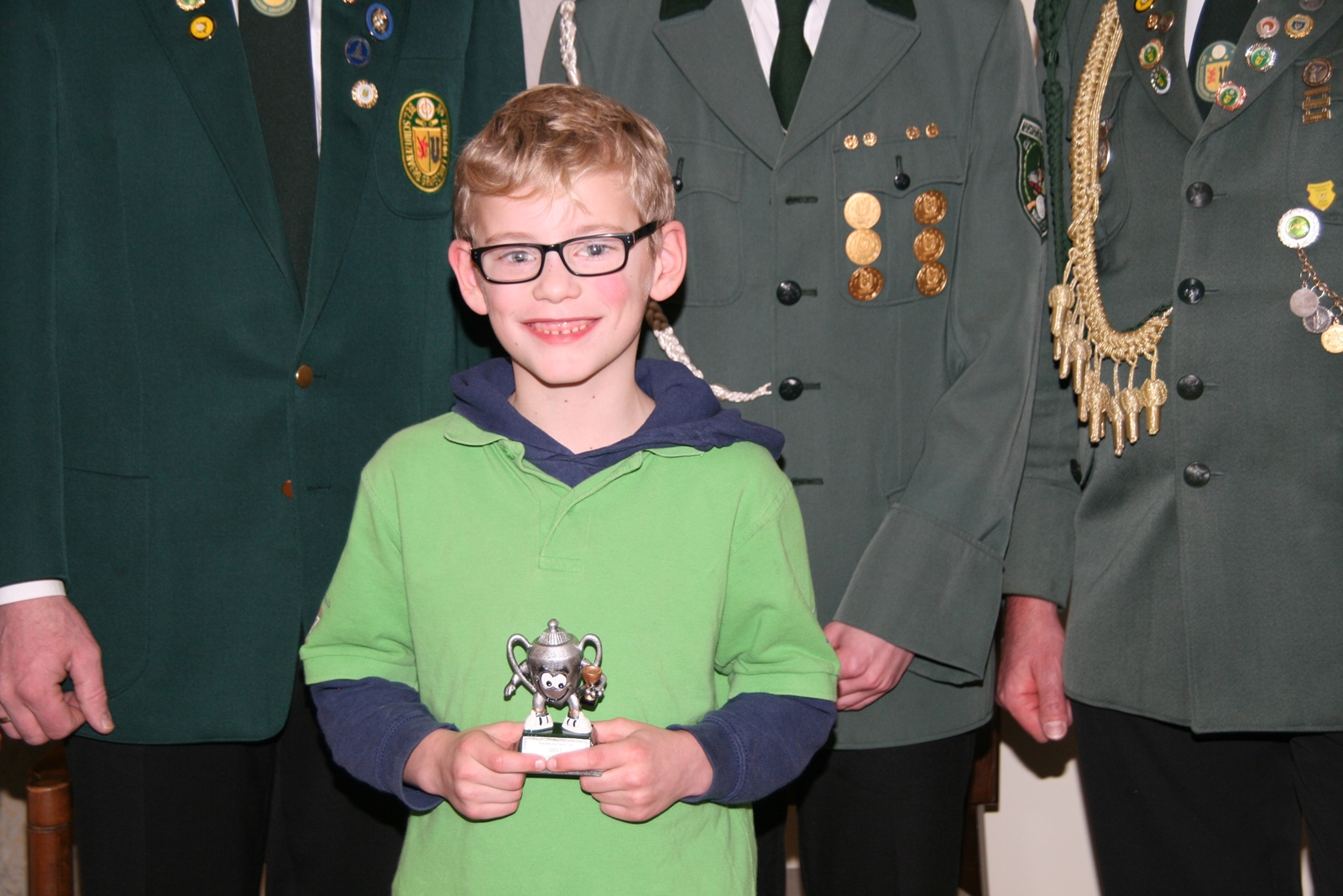 In den vergangenen Jahren habe man die Lichtpunktschützen zu diesem Wettkampf im Oktober immer so melden können, in diesem Jahr war es etwas anders, man musste sich qualifizieren. Erstmals musste eine sportliche "Hürde" genommen werden und diese habe Colin mit Bravour gemeistert. Nur die besten Lichtpunktschützen aus mehreren Landesverbänden qualifizieren sich für diese überregionale Meisterschaft. Mit der Lichtpunktpistole hatte Colin bei der Landesverbandsmeisterschaft in der Schülerklasse D die Silbermedaille gewonnen. So konnte er in der Mannschaft des Nordwestdeutschen Schützenbundes (NWDSB) mitschießen, diese habe zudem die Goldmedaille gewonnen. Die Übergabe des Pokals an Colin wurde mit viel Beifall aller Anwesenden belohnt. Es gratulierte ebenso Bezirksjugendsprecher Bjarne Lohmeier sowie Vereinskönigin Susanne Zwick, Colin freute sich natürlich auch über die vielen Glückwünsche der nicht gekrönten "Häupter".