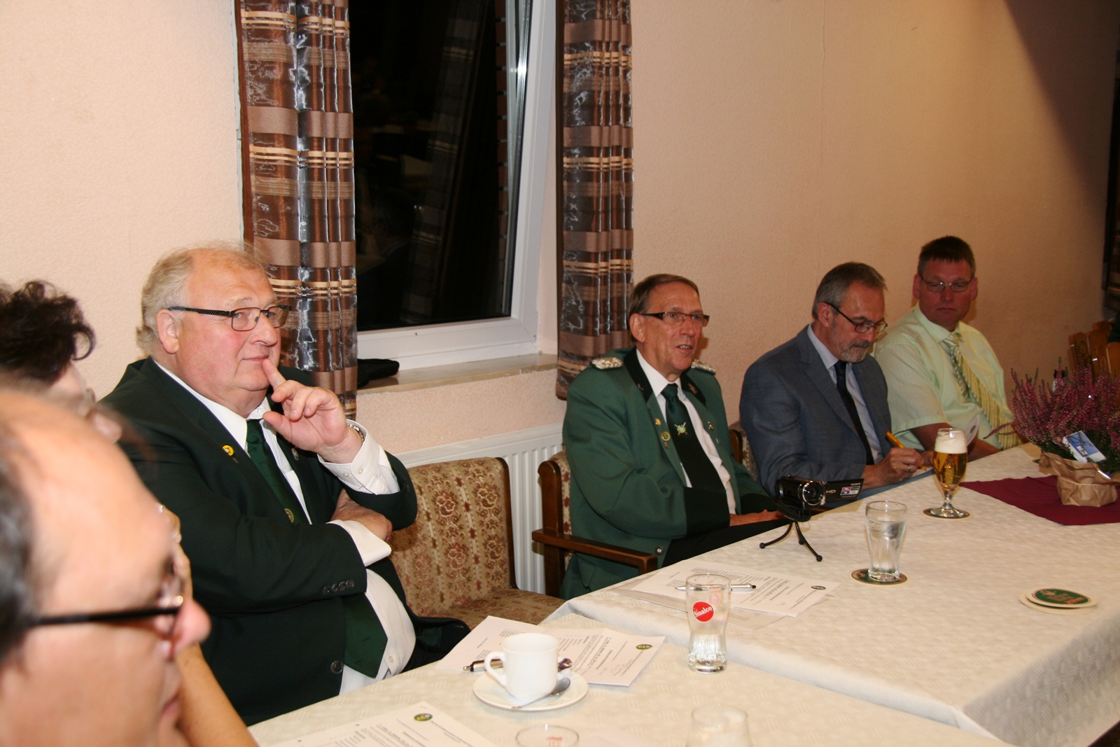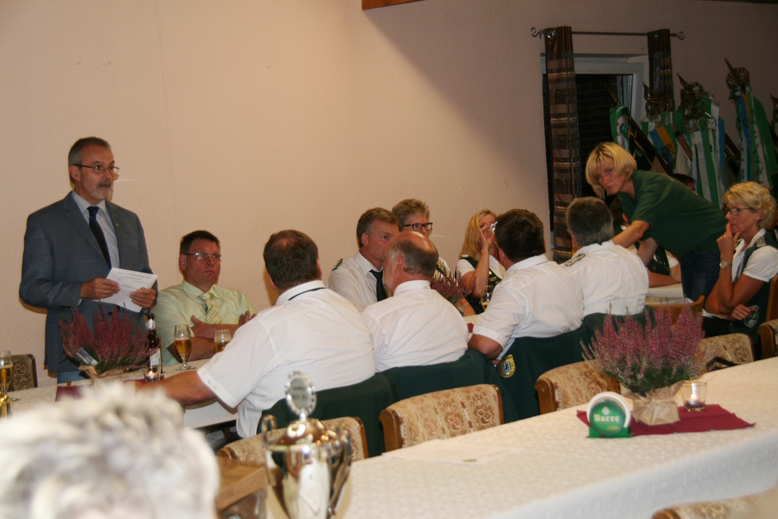 Bezirkspräsident Karl-Friedrich Scharrelmann überbrachte beste Grüße des Bezirks-Schützenverbandes Diepholz. Er schloss sich den Wünschen seiner Vorredner an, wollte aber noch einmal hervorheben, dass wir Schützen in der Vergangenheit immer „Schläge“ bekommen haben, unberechtigter Weise. Dann kamen die Olympischen Spiele in Rio, zum Glück mit fünf Medaillengewinnern! Da wunderte sich doch glatt ein Fernsehreporter, dass die Einschaltquoten über 7 Millionen lagen. Ganz erstaunlich ist das, denn wir sind keine Bösewichter, wir sind die Guten, die die grüne Jacke tragen, wir sind die die Tradition pflegen, aber auch den Schießsport und die Jugend an den Sport führen. Wir eignen uns nicht als Sündenböcke, da müssen sie sich andere aussuchen!