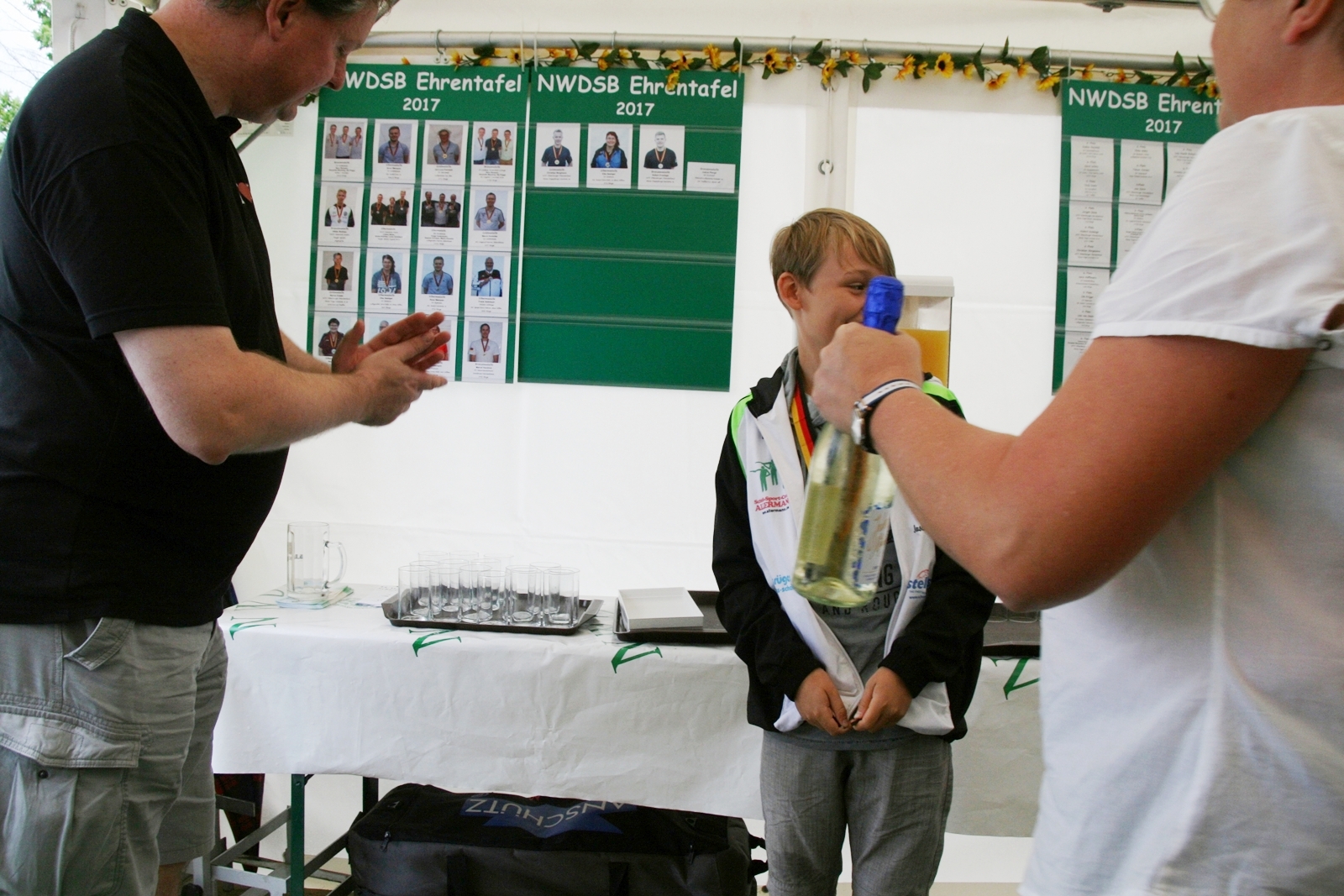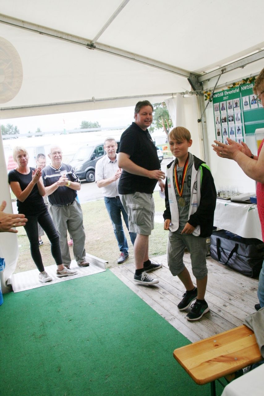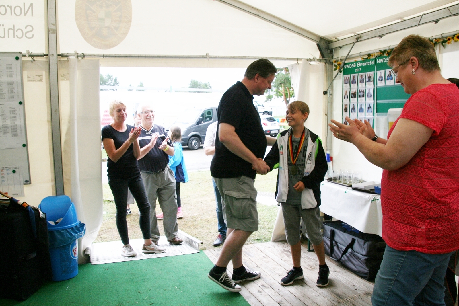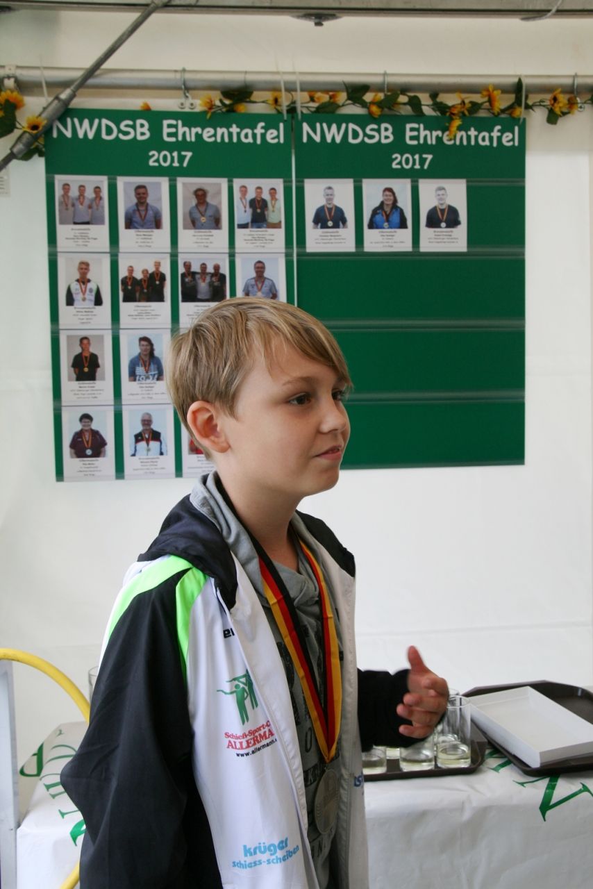Er freute sich wieder einen Medaillengewinner heute hier hochleben lassen zu können, und zwar ist das Justus Plenge vom SV Kirchdorf, der in der Schülerklasse mit der mehrschüssigen Luftpistole ein ganz tolles Ergebnis hingelegt hat. Er hat hier seine persönliche Bestleistung von 28 von 30 Treffern geschossen, er war aber nicht der Einzige, ein Kollege vom Landesverband Hessen hatte die gleiche Anzahl. So gab es ein Shoot off, welches er auch mit verfolgen konnte und es war ihm aufgefallen, dass die beiden jungen Sportschützen ganz "cool" in den Wettkampf gingen. So hatten sie in den ersten drei Serien beide jeweils 5 Treffer "gelandet" in der vierten Serie hatte Justus nur einen Treffer, sein Kollege aber zwei! So war es entschieden, Justus wurde dadurch trotzdem glücklicher "Bronzemedaillengewinner". Frank Pingel gratulierte ihm nochmals zu dieser herausragenden Leistung Seitens des ganzen NWDSB's. Dank sprach er auch seinem Trainingsfleiß aus, dankte auch seiner Familie und seinem Verein für die gute Unterstützung.