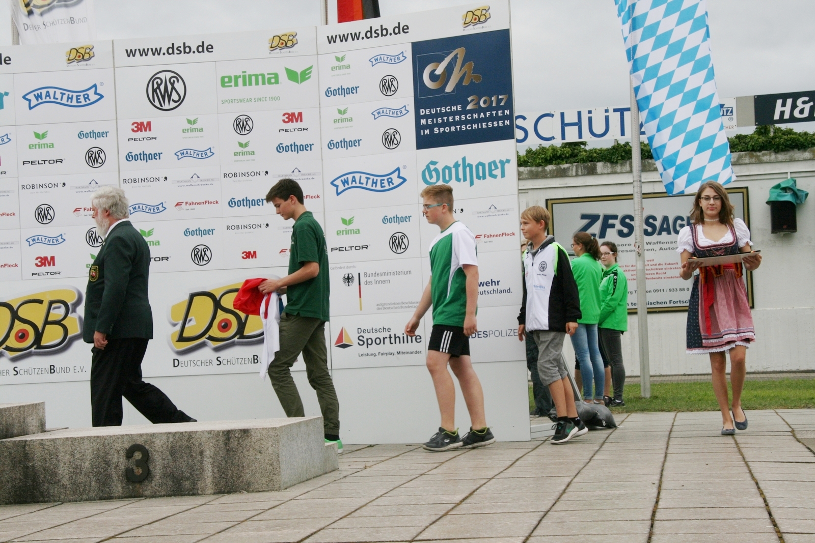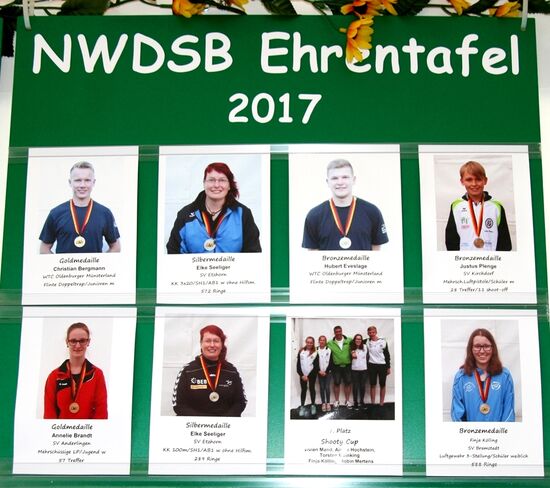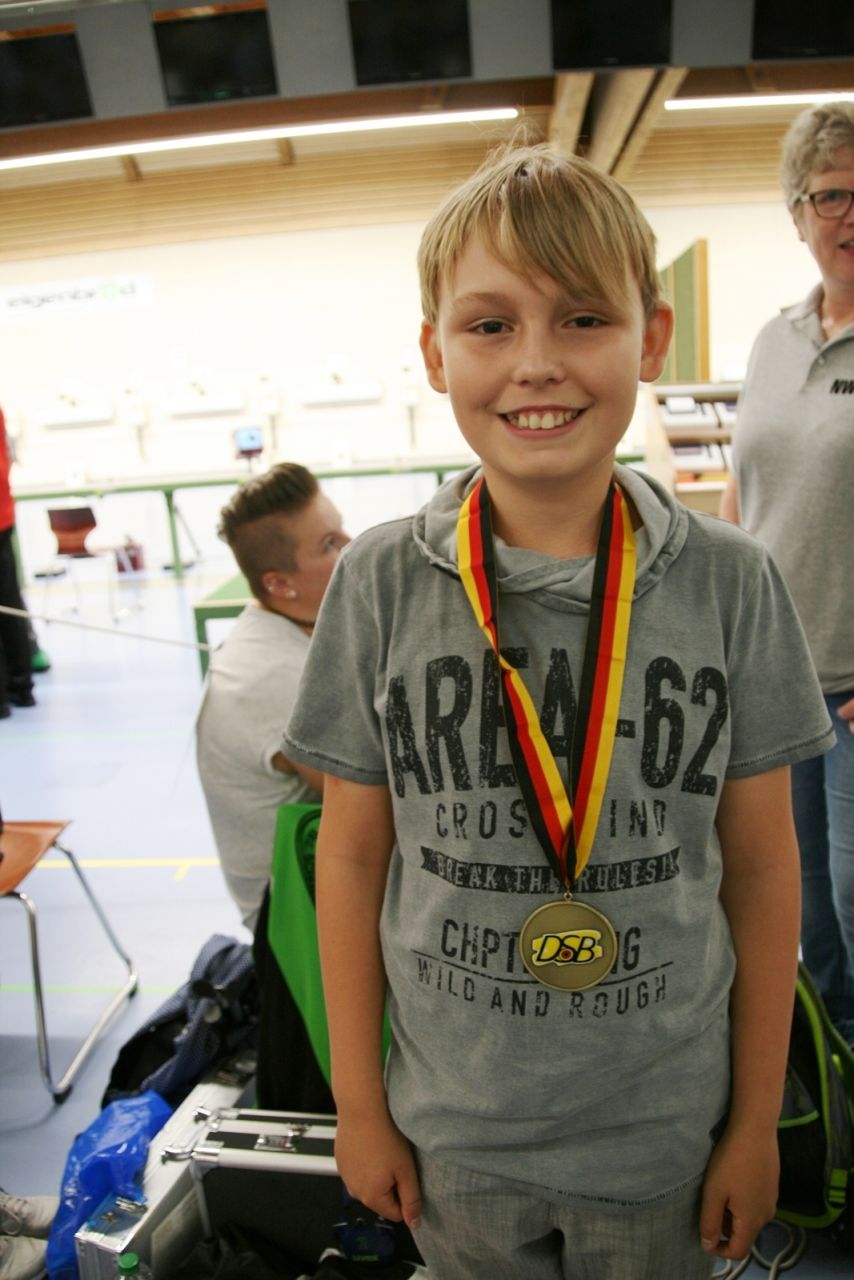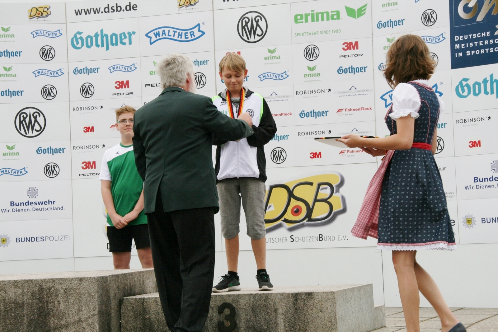 Er freute sich wieder einen Medaillengewinner heute hier hochleben lassen zu können, und zwar ist das Justus Plenge vom SV Kirchdorf, der in der Schülerklasse mit der mehrschüssigen Luftpistole ein ganz tolles Ergebnis hingelegt hat. Er hat hier seine persönliche Bestleistung von 28 von 30 Treffern geschossen, er war aber nicht der Einzige, ein Kollege vom Landesverband Hessen hatte die gleiche Anzahl. So gab es ein Shoot off, welches er auch mit verfolgen konnte und es war ihm aufgefallen, dass die beiden jungen Sportschützen ganz "cool" in den Wettkampf gingen. So hatten sie in den ersten drei Serien beide jeweils 5 Treffer "gelandet" in der vierten Serie hatte Justus nur einen Treffer, sein Kollege aber zwei! So war es entschieden, Justus wurde dadurch trotzdem glücklicher "Bronzemedaillengewinner". Frank Pingel gratulierte ihm nochmals zu dieser herausragenden Leistung Seitens des ganzen NWDSB's. Dank sprach er auch seinem Trainingsfleiß aus, dankte auch seiner Familie und seinem Verein für die gute Unterstützung.