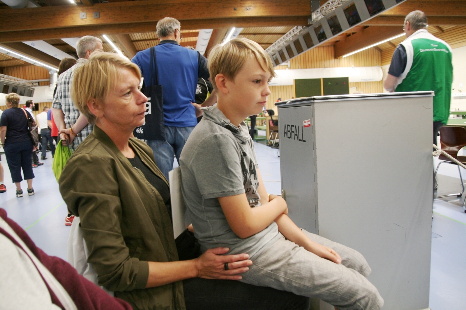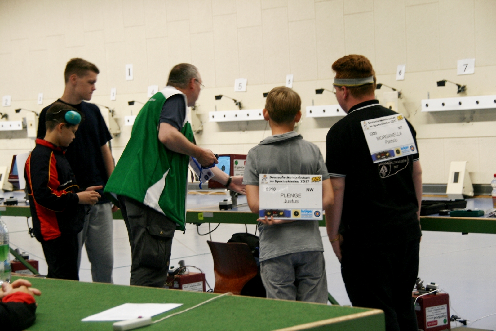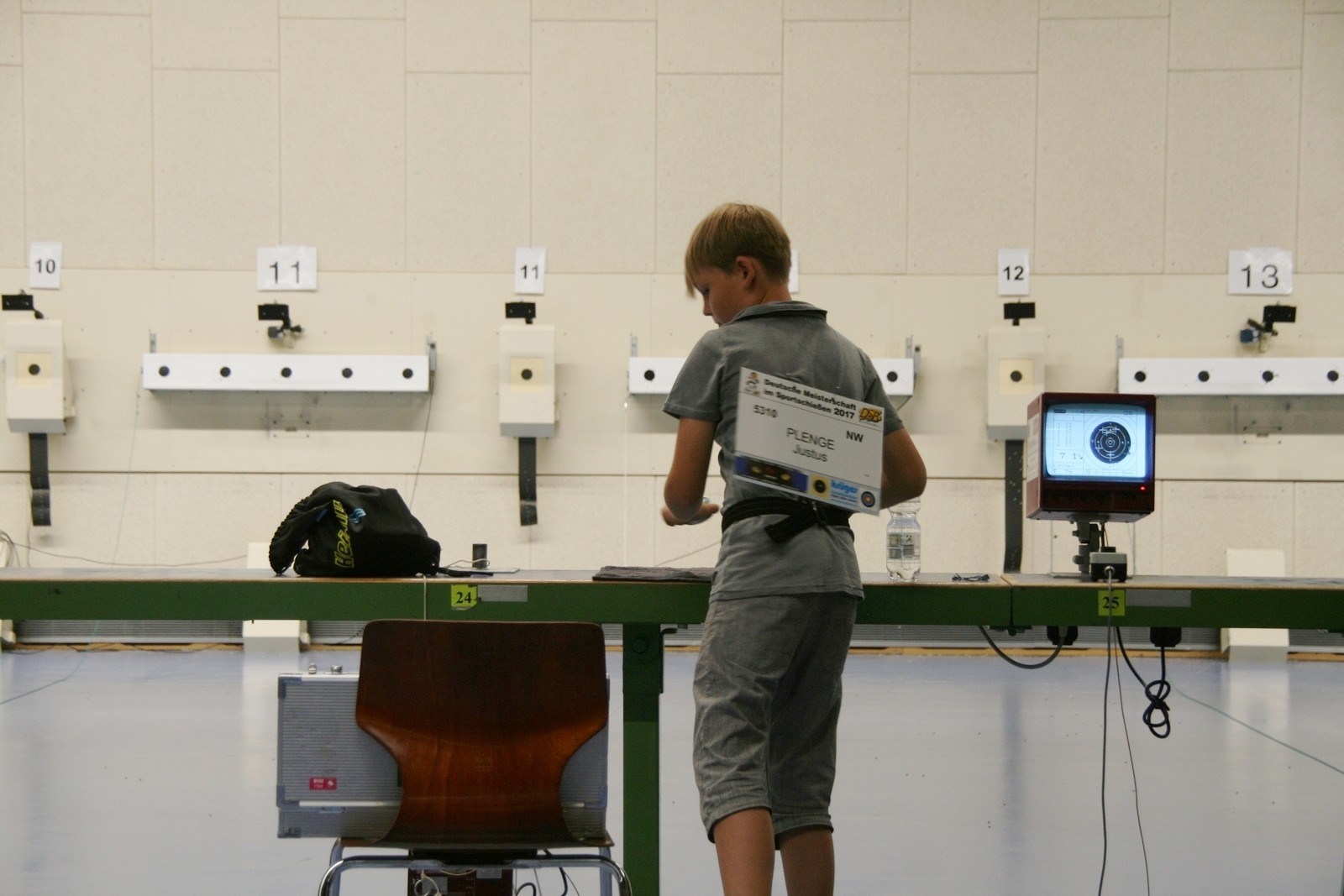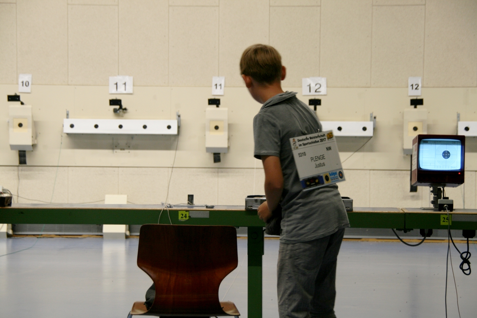 Schon am frühen Morgen um 8:35 Uhr hatte Justus seinen Start mit der mehrschüssigen Luftpistole in der Luftdruckhalle. In seiner Schülerklasse waren 47 Schützen gemeldet. Zu Beginn wurde ihre Gruppe mit vier Schützen aufgerufen und ihnen der Ablauf des Wettkampfes von einem Helfer des DSB erklärt. Seine ersten Treffer begannen "verhalten" mit zwei 4er Treffern, dann schien ihn nichts mehr aus der Ruhe zu bringen: es folgten dann vier Serien mit jeweils fünf Treffern! Mutter und alle Fans waren begeistert, unter ihnen auch unser Bezirkspräsident Karl-Friedrich Scharrelmann(auch mit ihm hatten sie die Mehrschüssige trainiert) Bezirkstrainerin Karin Husmann, Jugendsportleiterin Britta Löhmann, Stellvertretende Damensportleiterin Claudia Reuter sowie Pressewartin Marianne Vallan und sparten nicht mit Beifall! Es stellte sich dann heraus, dass ein weiterer Schütze 28 Treffer hatte. Es blieb bis zum letzten Durchgang spannend.