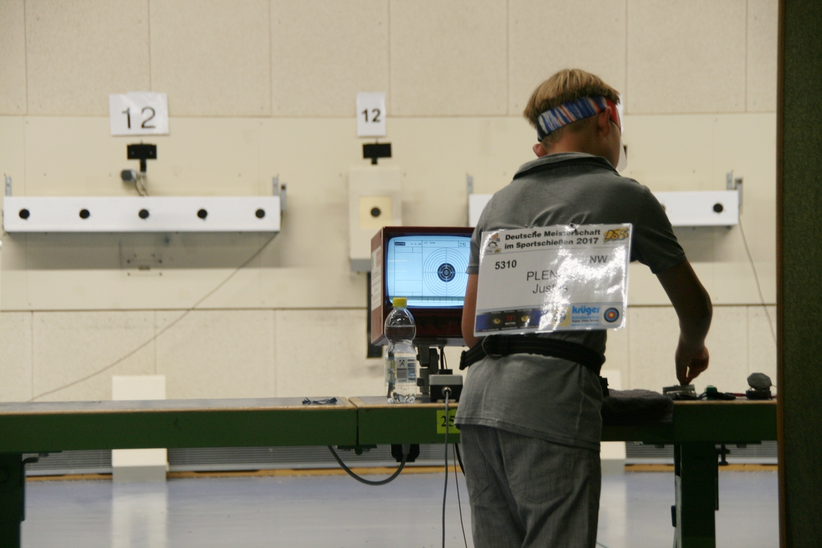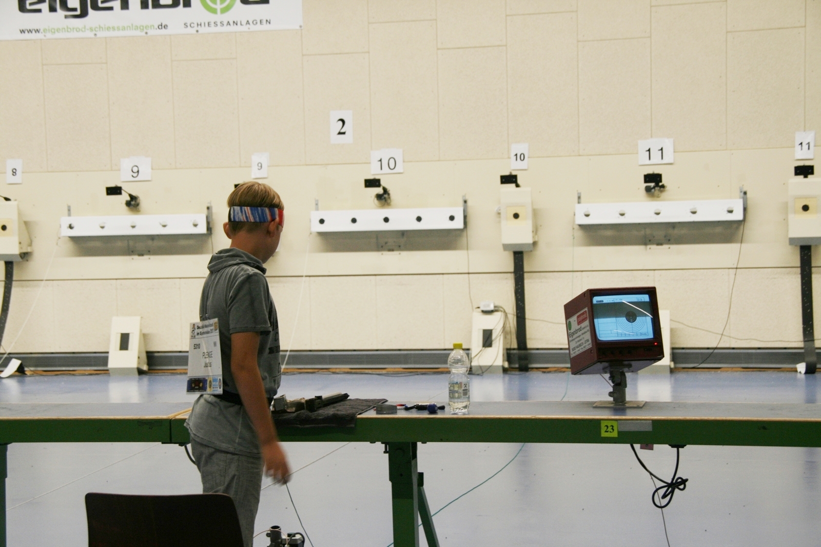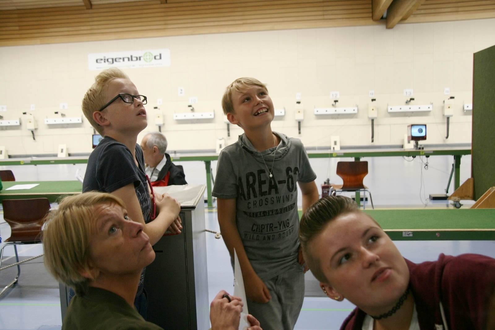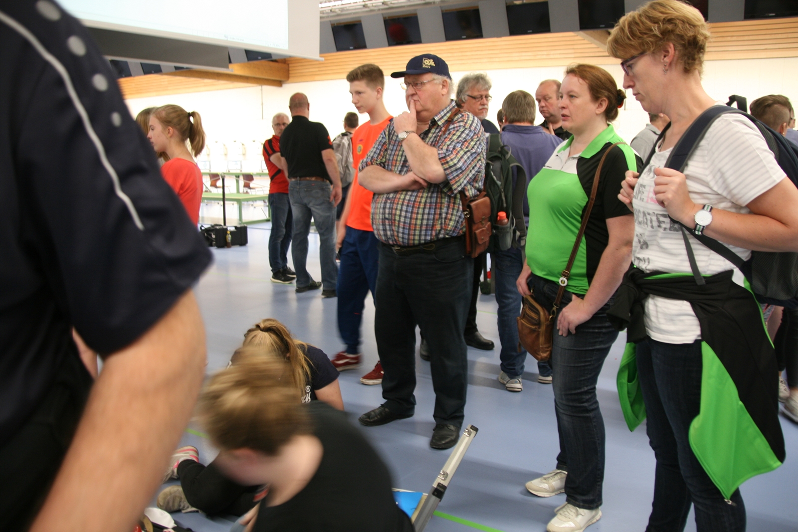 Schon am frühen Morgen um 8:35 Uhr hatte Justus seinen Start mit der mehrschüssigen Luftpistole in der Luftdruckhalle. In seiner Schülerklasse waren 47 Schützen gemeldet. Zu Beginn wurde ihre Gruppe mit vier Schützen aufgerufen und ihnen der Ablauf des Wettkampfes von einem Helfer des DSB erklärt. Seine ersten Treffer begannen "verhalten" mit zwei 4er Treffern, dann schien ihn nichts mehr aus der Ruhe zu bringen: es folgten dann vier Serien mit jeweils fünf Treffern! Mutter und alle Fans waren begeistert, unter ihnen auch unser Bezirkspräsident Karl-Friedrich Scharrelmann(auch mit ihm hatten sie die Mehrschüssige trainiert) Bezirkstrainerin Karin Husmann, Jugendsportleiterin Britta Löhmann, Stellvertretende Damensportleiterin Claudia Reuter sowie Pressewartin Marianne Vallan und sparten nicht mit Beifall! Es stellte sich dann heraus, dass ein weiterer Schütze 28 Treffer hatte. Es blieb bis zum letzten Durchgang spannend.