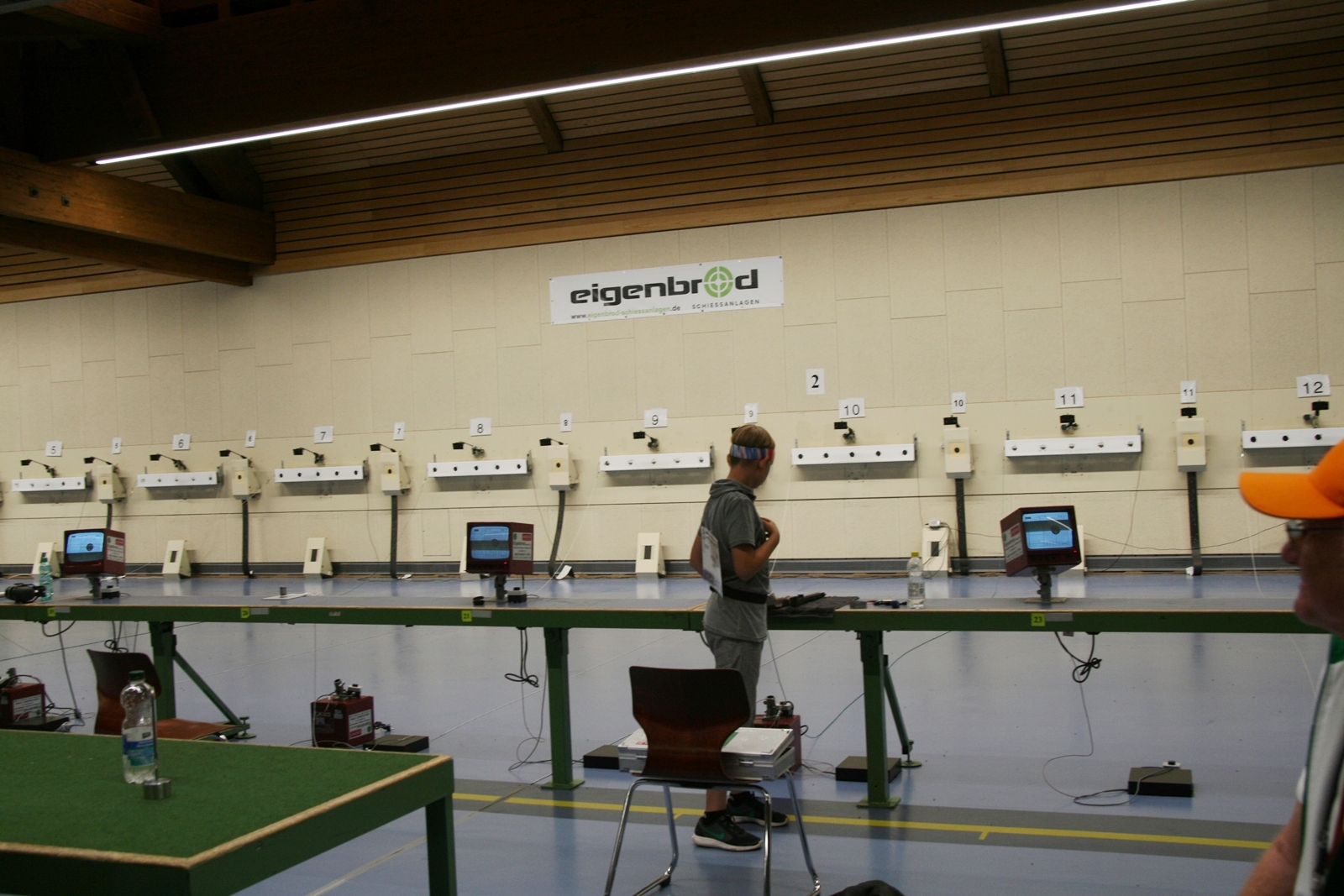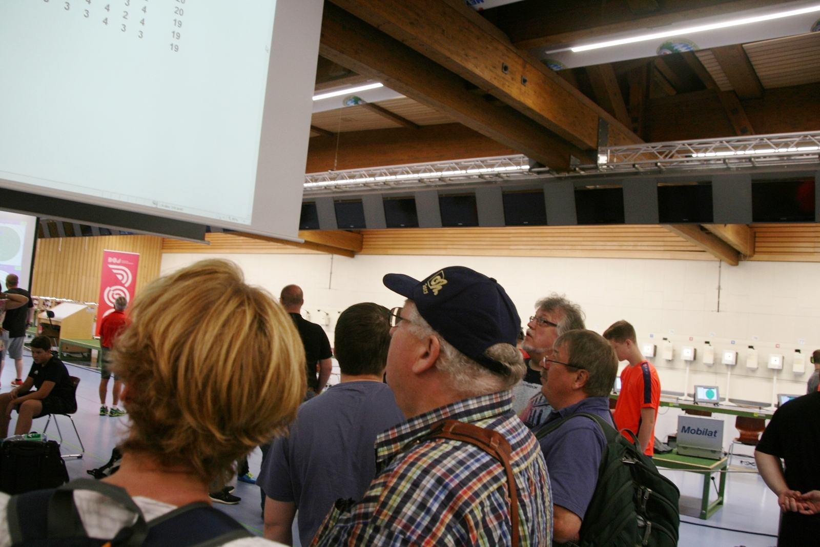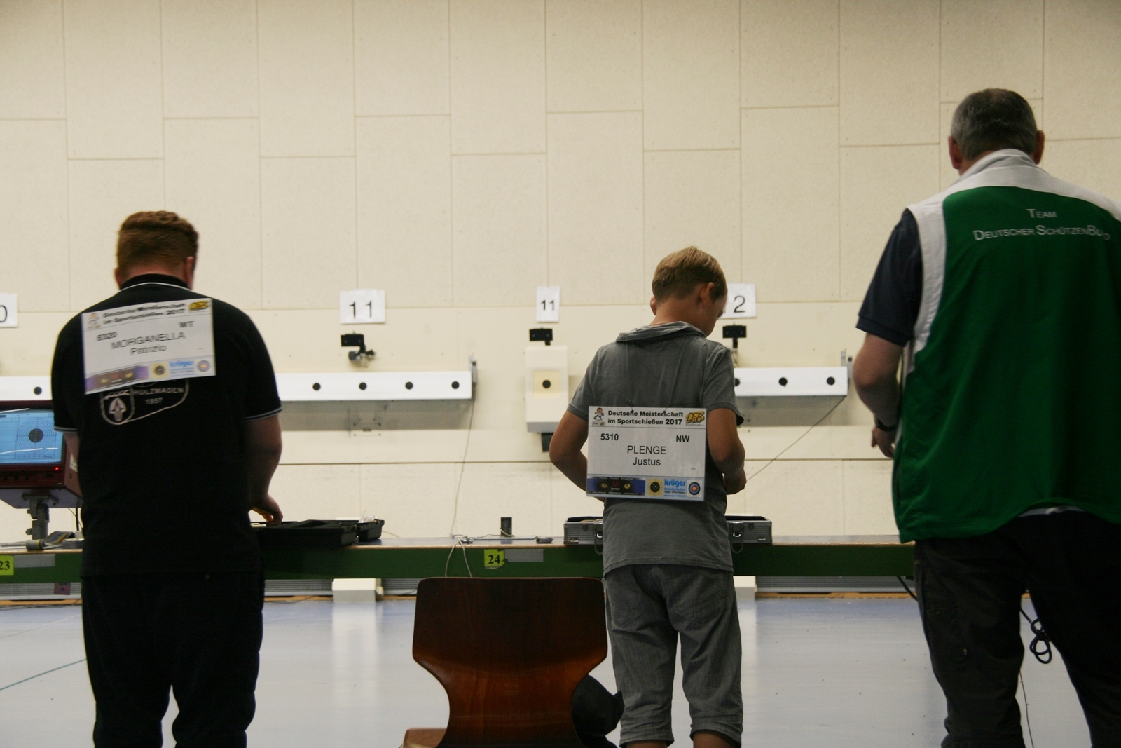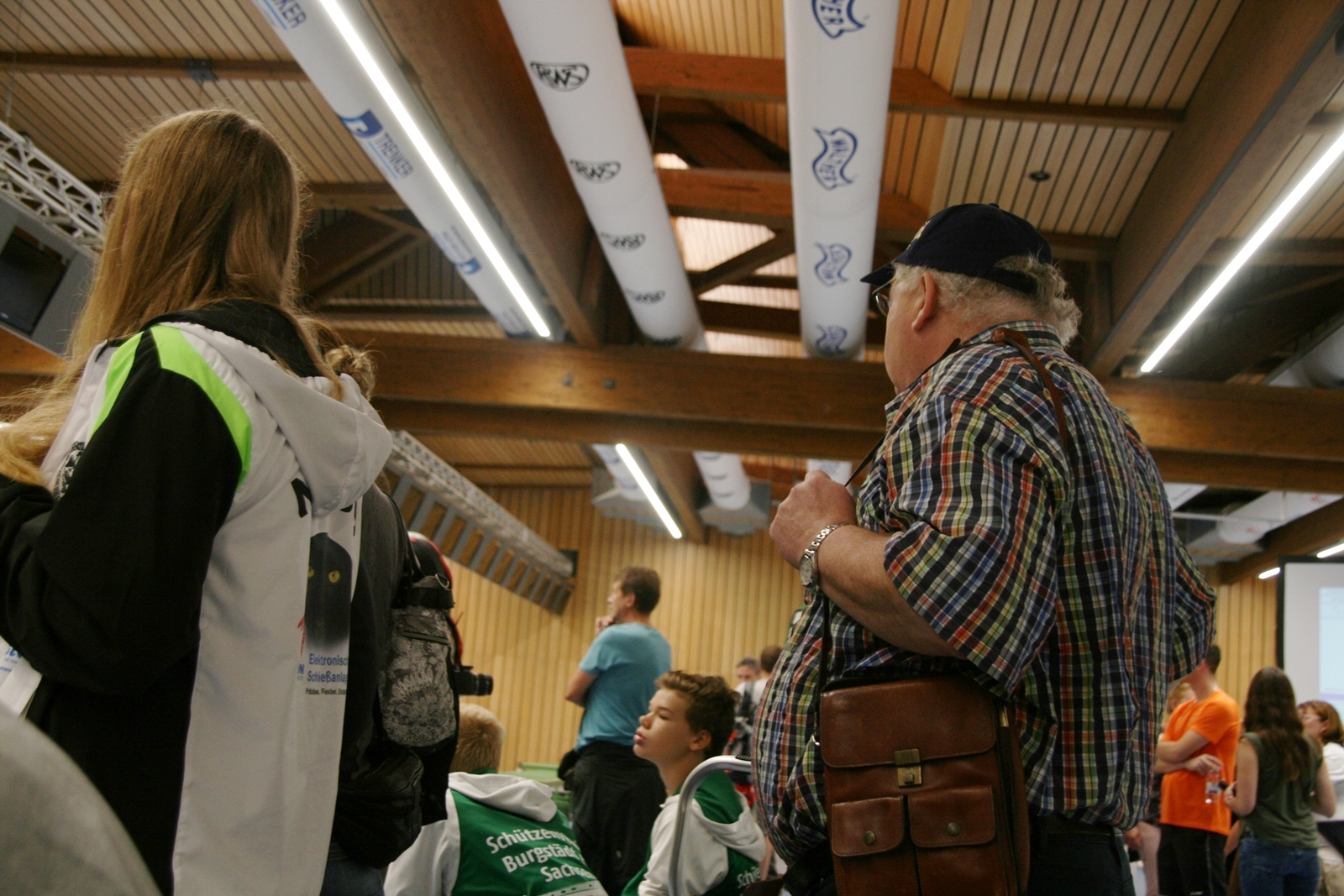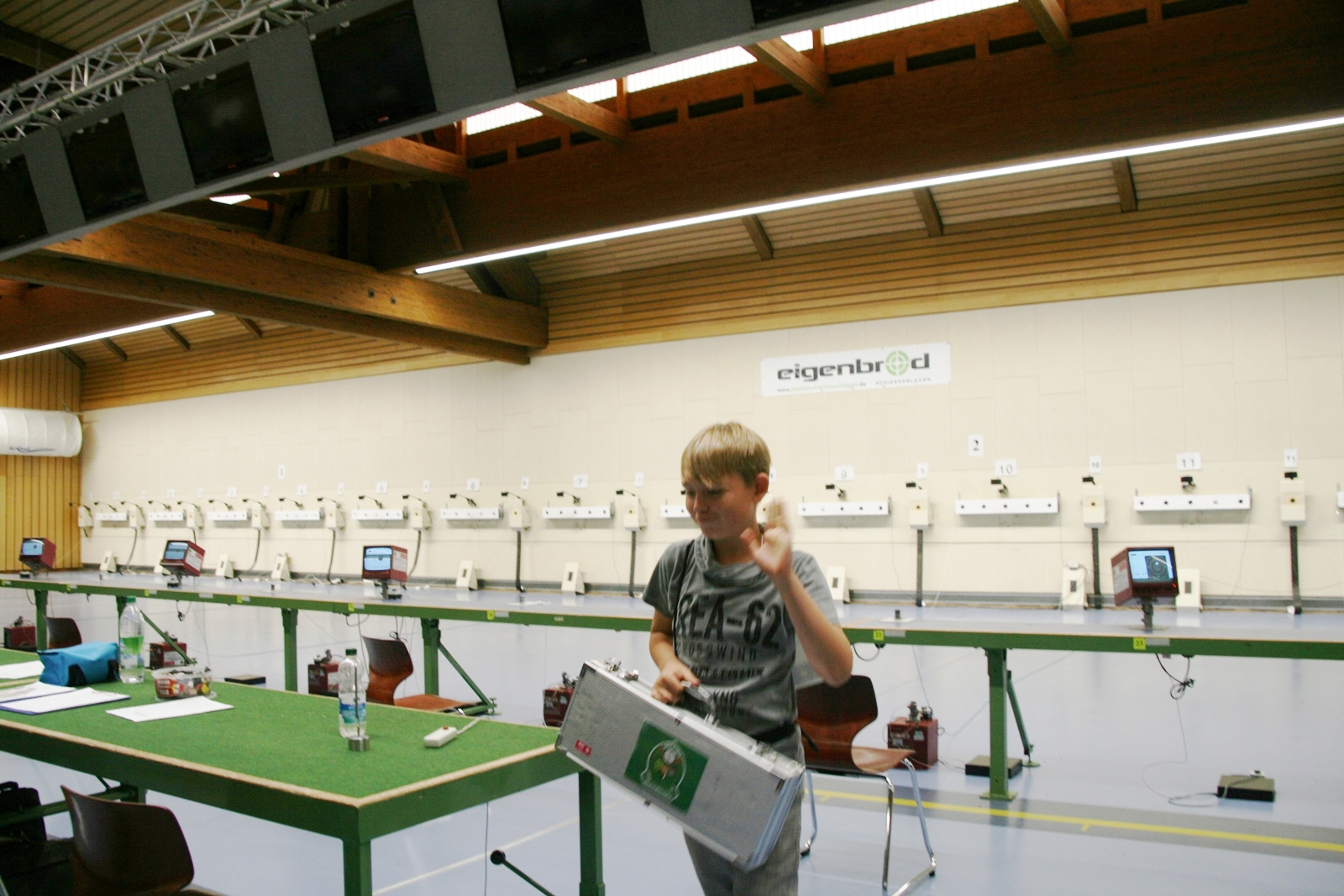Schon am frühen Morgen um 8:35 Uhr hatte Justus seinen Start mit der mehrschüssigen Luftpistole in der Luftdruckhalle. In seiner Schülerklasse waren 47 Schützen gemeldet. Zu Beginn wurde ihre Gruppe mit vier Schützen aufgerufen und ihnen der Ablauf des Wettkampfes von einem Helfer des DSB erklärt. Seine ersten Treffer begannen "verhalten" mit zwei 4er Treffern, dann schien ihn nichts mehr aus der Ruhe zu bringen: es folgten dann vier Serien mit jeweils fünf Treffern! Mutter und alle Fans waren begeistert, unter ihnen auch unser Bezirkspräsident Karl-Friedrich Scharrelmann(auch mit ihm hatten sie die Mehrschüssige trainiert) Bezirkstrainerin Karin Husmann, Jugendsportleiterin Britta Löhmann, Stellvertretende Damensportleiterin Claudia Reuter sowie Pressewartin Marianne Vallan und sparten nicht mit Beifall! Es stellte sich dann heraus, dass ein weiterer Schütze 28 Treffer hatte. Es blieb bis zum letzten Durchgang spannend.