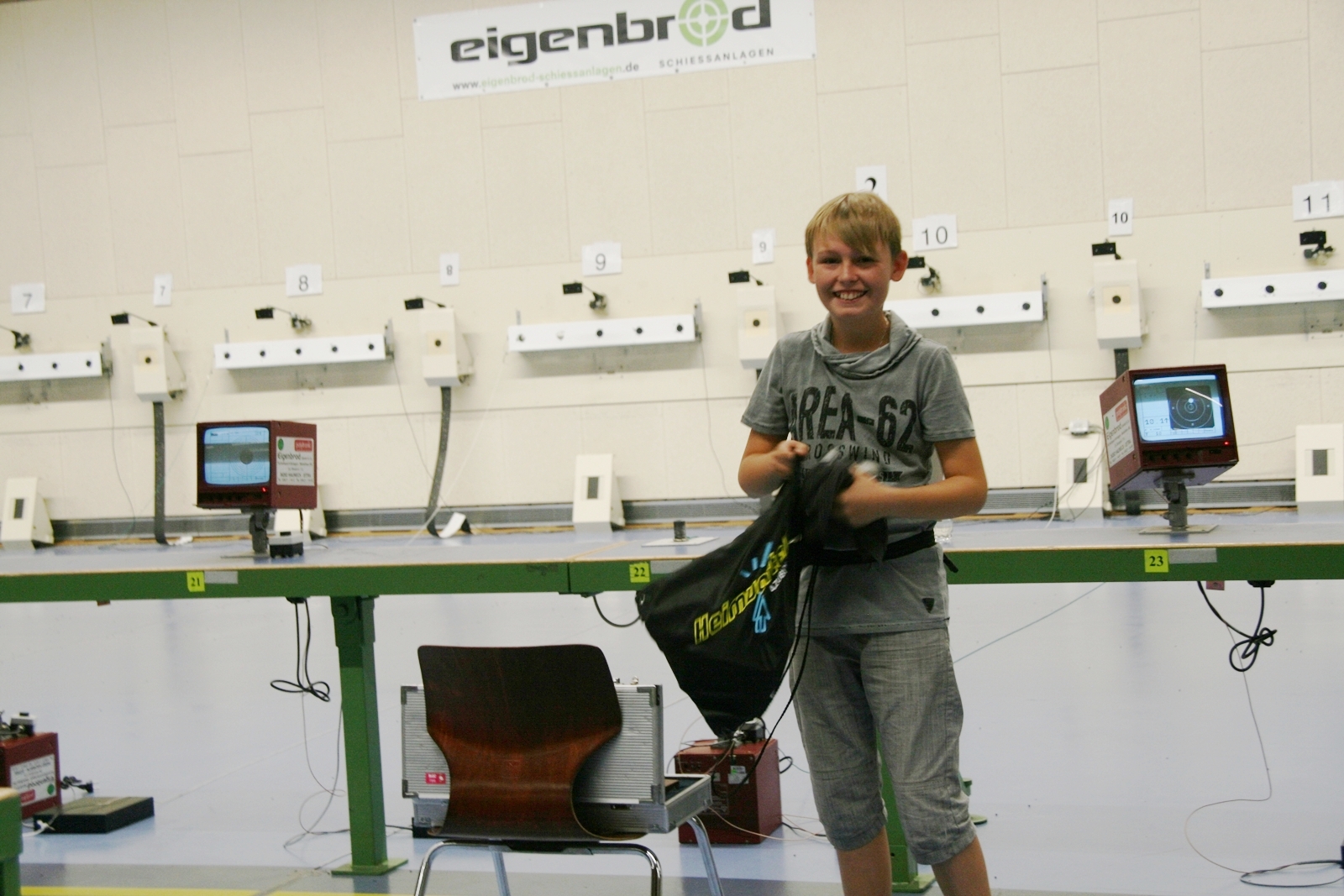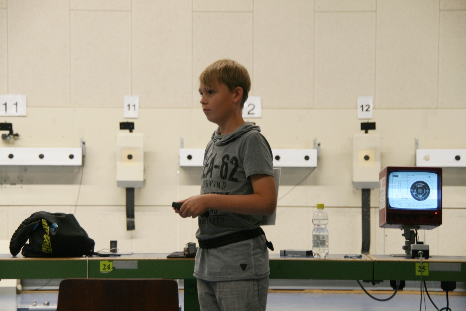 Genau wie zuvor legten die beiden jungen Sportschützen zwei 5er Serien hin, bei der dritten Serien waren wohl beide nicht mehr ganz bei der Sache: Justus hob den Arm für seine dritte Serie, senkte ihn wieder, da fiel ihm wohl ein, dass er ja auch abdrücken musste, so traf er nur eine Klappscheibe. Seinem Kontrahenten ging es nicht viel besser, er traf aber zwei Scheiben, so war es entschieden: Marion Hemmerle "holte" SILBER" und unser Justus "BRONZE"!
