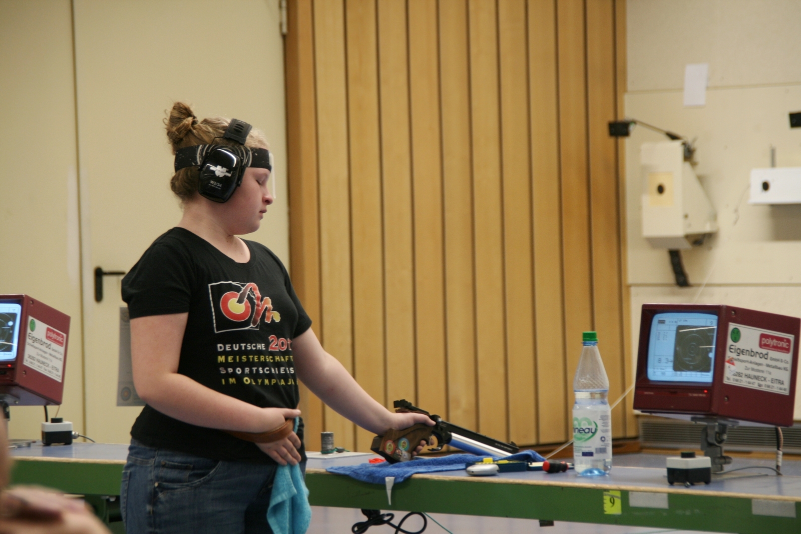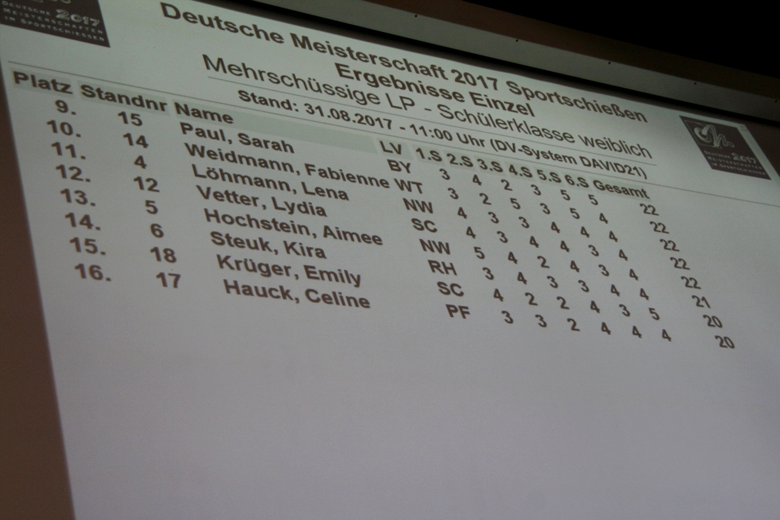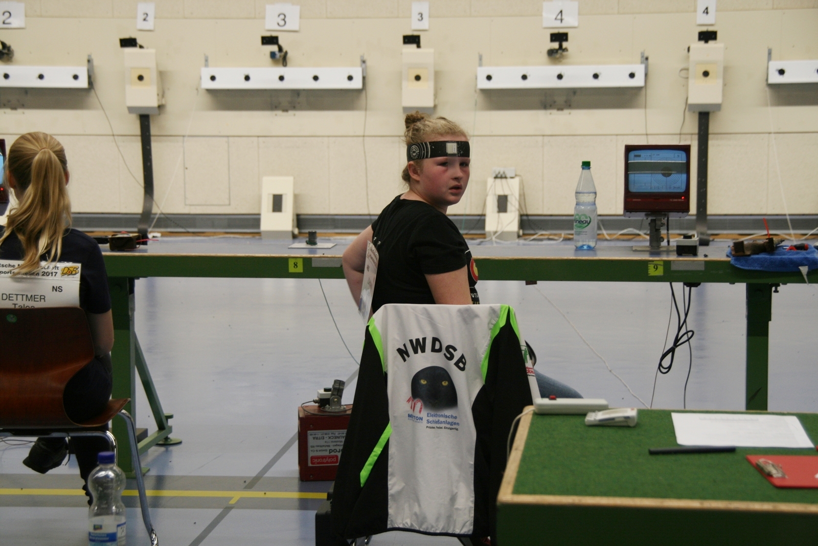 Lea Grünenwald hatte um 13:00 Uhr ihren Start in der gleichen Disziplin, ebenfalls vom SV Kirchdorf, sie trat in der Jugendklasse an. Sie hatte 12 Serien a' 5 Schuß zu absolvieren, insgesamt kam sie auf 44 Treffer und nahm den 23 Platz von 34 Teilnehmerinnen ein. Beste Schützin mit 57 Treffern wurde Annelie Brandt vom SV Anderlingen u. Umgeb. (NWDSB).
