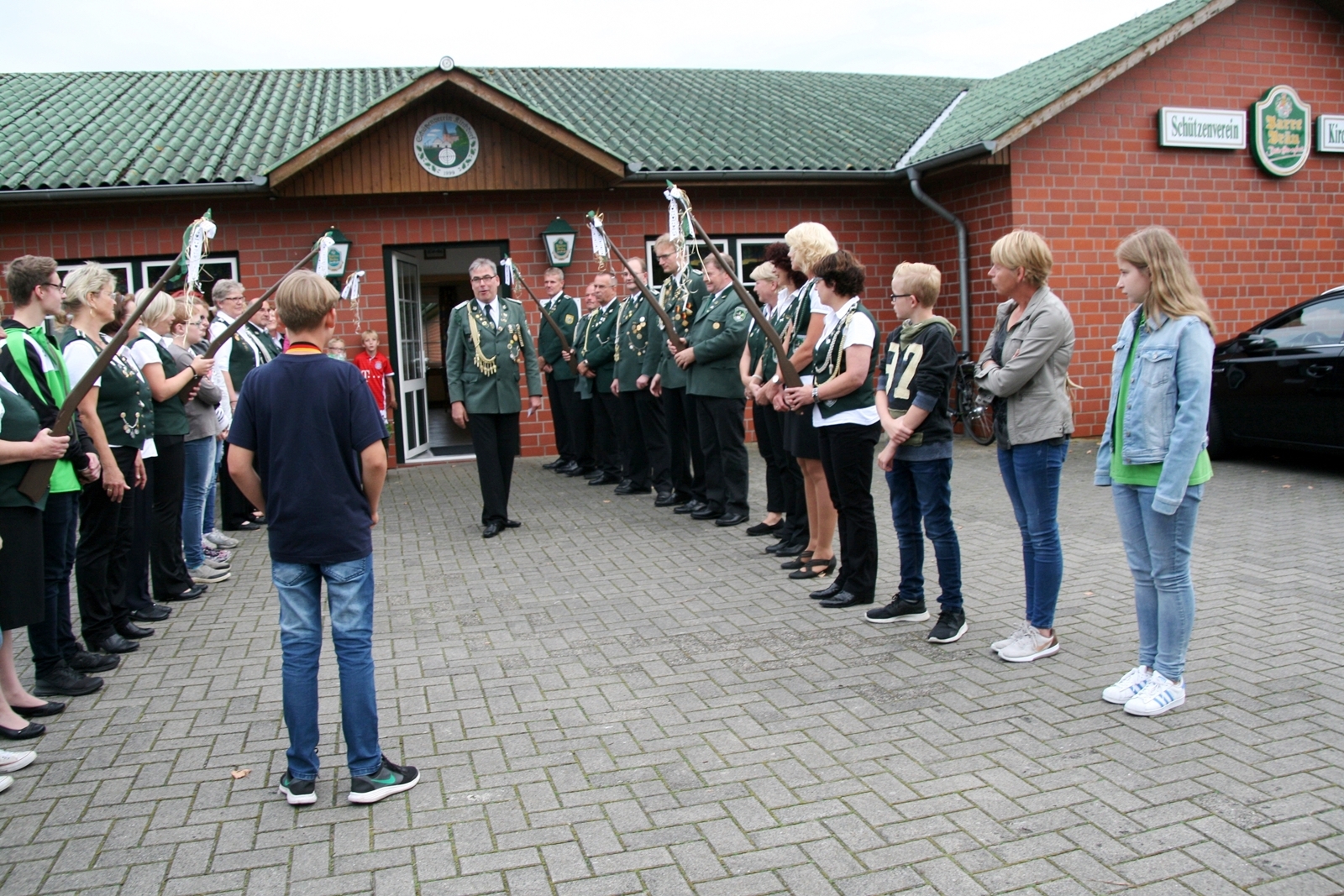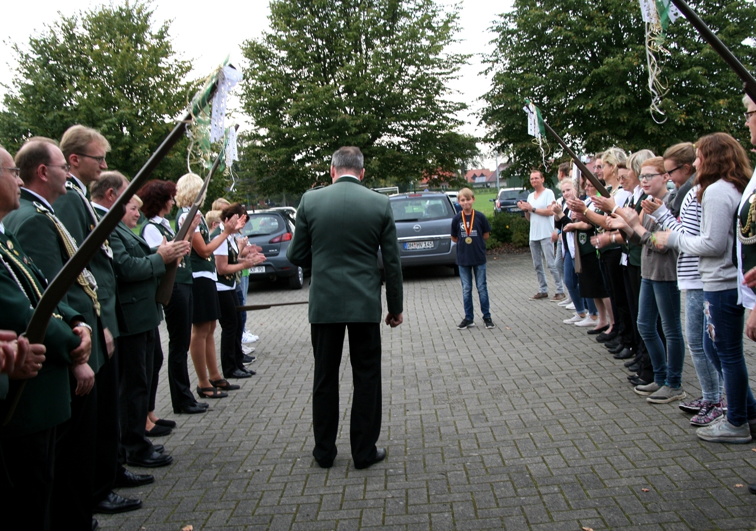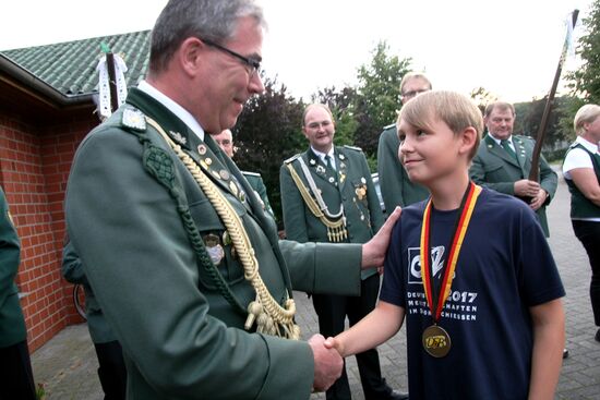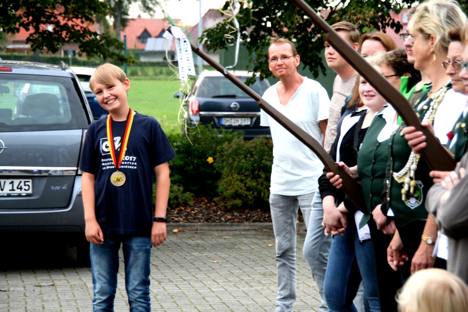 Ein herzlicher Empfang wurde Justus Plenge für das Erringen seiner BRONZEMEDAILLE bei den Deutschen Meisterschaften mit der mehrschüssigen Luftpistole in München vom Schützenverein Kirchdorf bereitet. Traditionsschützen und Gäste trafen sich hier zum feierlichen Empfang.