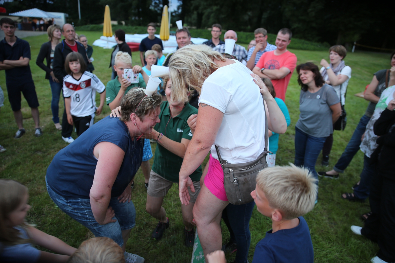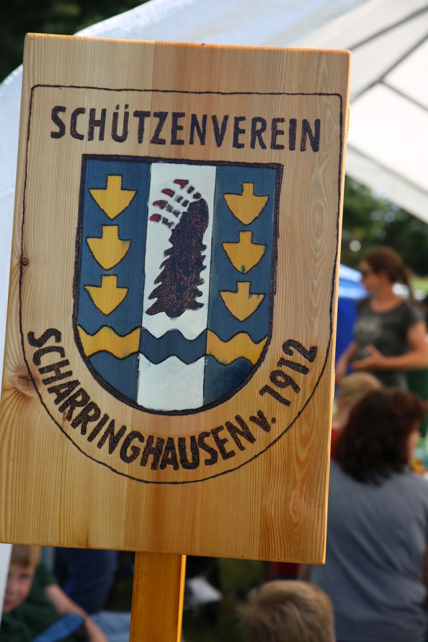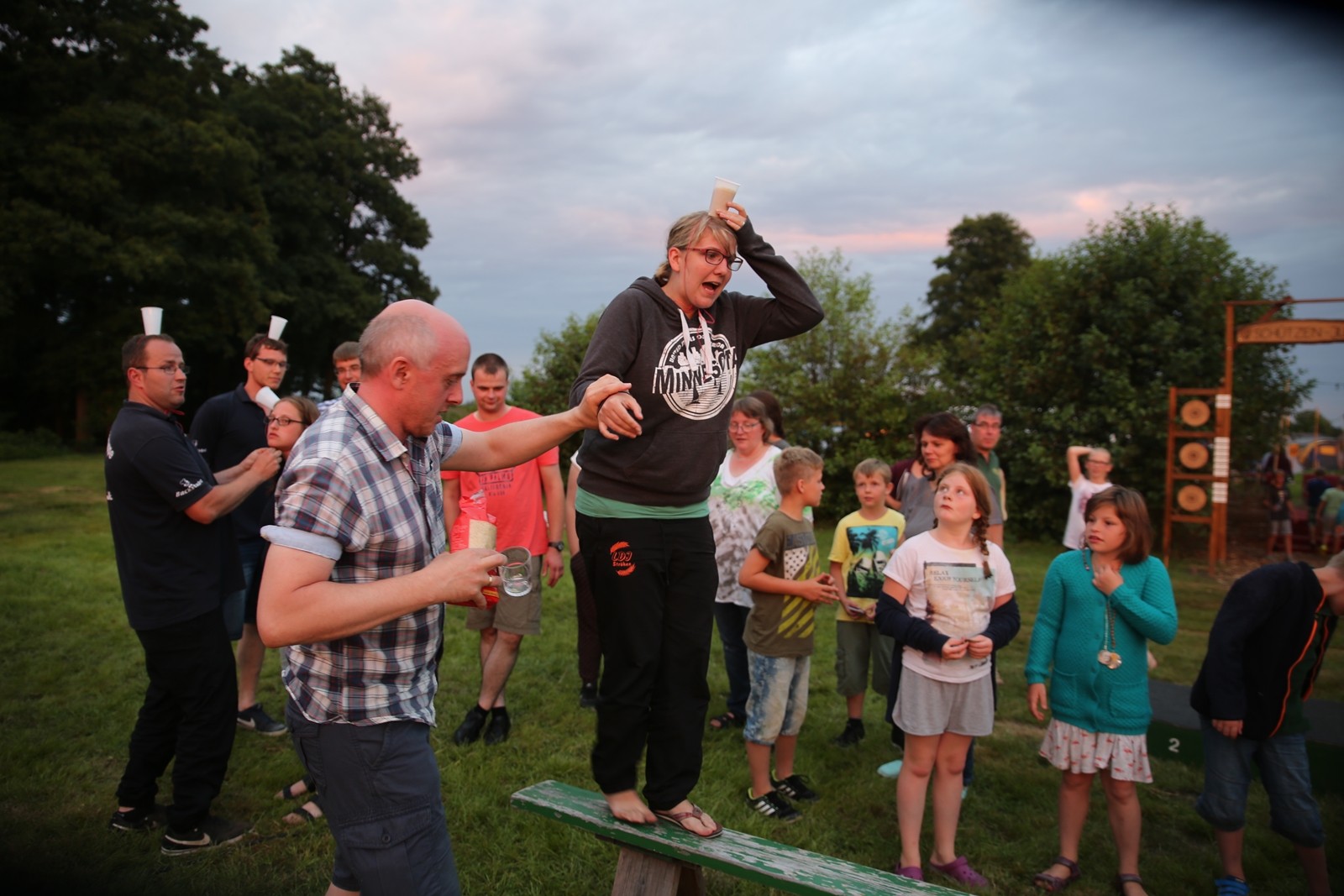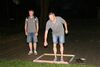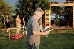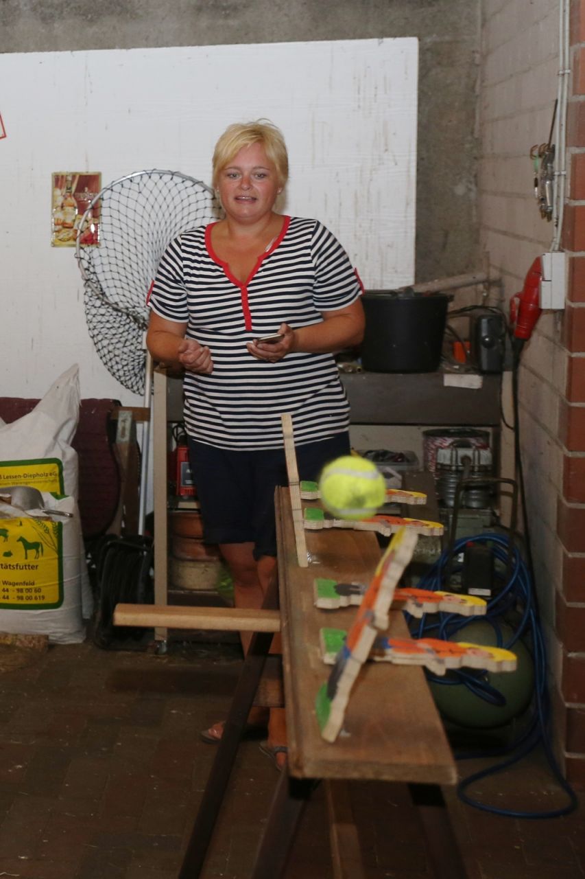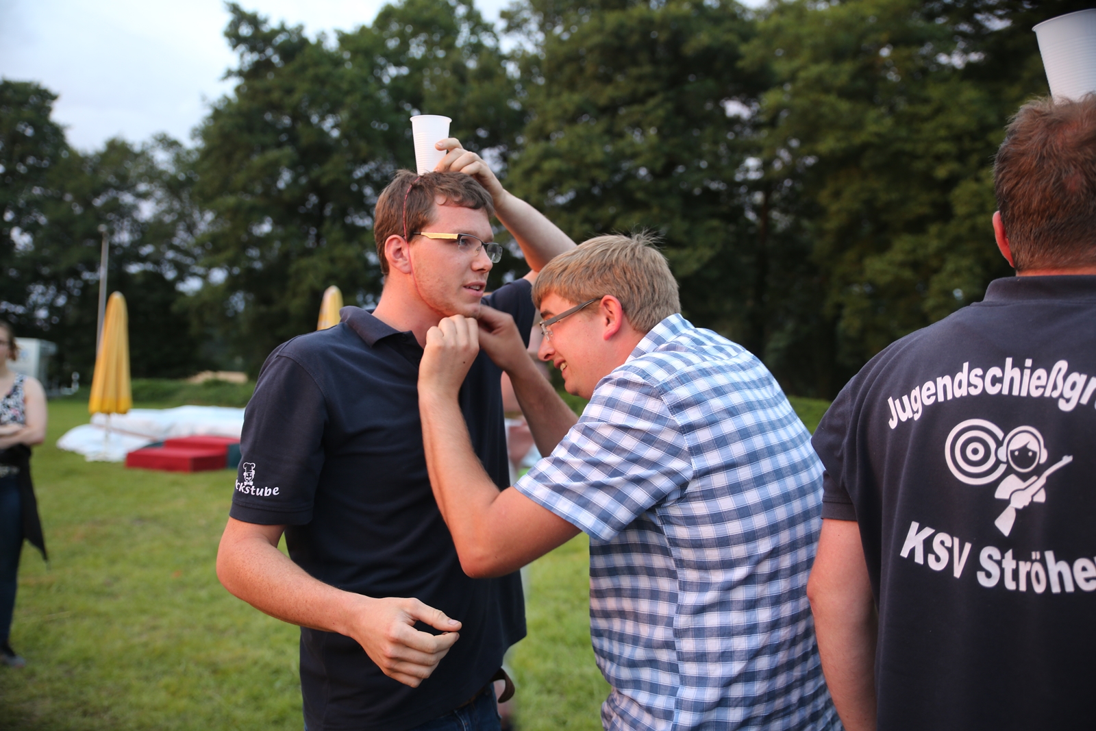 Am ersten Tag fand nach dem Zeltaufbau die Begrüßung durch Kreispräsident Gerd Griffel und Präsident des gastgebenden Kriegerschützenvereins Heiko Meyer statt. Stellvertretender Kreispräsident Bernd Dammeier und Bogenreferent Jürgen Vogt machten durch Anbringung einer Plakate an die Eingangspforte die Eröffnung offiziell. Im Anschluss an die Begrüßung stand das Abendessen und eine ca. 3,5 km lange Dorfrallye auf dem Programm. Verschiedene Wettbewerbe standen dabei natürlich auf dem Programm, so dass der Spaß vor allem im Vordergrund stand. So gab es für die Mannschaften sehr tolle Aufgaben zu bewältigen zum Beispiel "Tischtennisblasen", "Weckglasgummischießen", Holzfiguren mussten mit einem Tennisball umgekippt werden oder möglichst schnell einen Golfball durch einen Feuerwehrschlauch "bugsieren", beim Bocciaspiel möglichst dicht mit den Kugeln an eine Markierung werfen, zwischendurch mussten gemeinschaftlich viele spezielle Fragen beantwortet werden. Bei diesen Spielen am Abend sicherte sich das Team Strange-Buchhorst 4 (109 Punkte)den Sieg vor dem Team Strange-Buchhorst 1 (106 Punkte), gefolgt vom Team des KSV Ströhen 2 (98 Punkte). Nicht zu vergessen die "Taufe" von Miriam Tacke vom KSV Ströhen! Mit voller "Montur" wurde sie kurzerhand ins erfrischende Wasser des "Strohpools" geworfen. So ging mit viel Spaß dieser erste ereignisreiche Tag zu Ende.