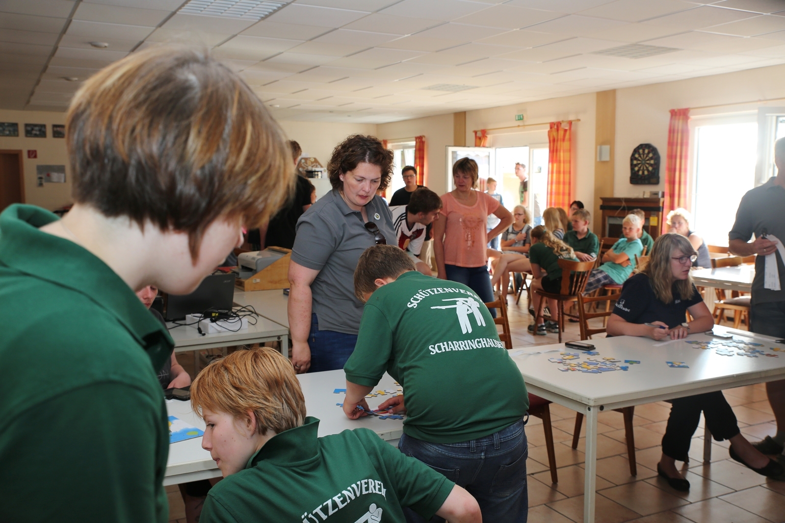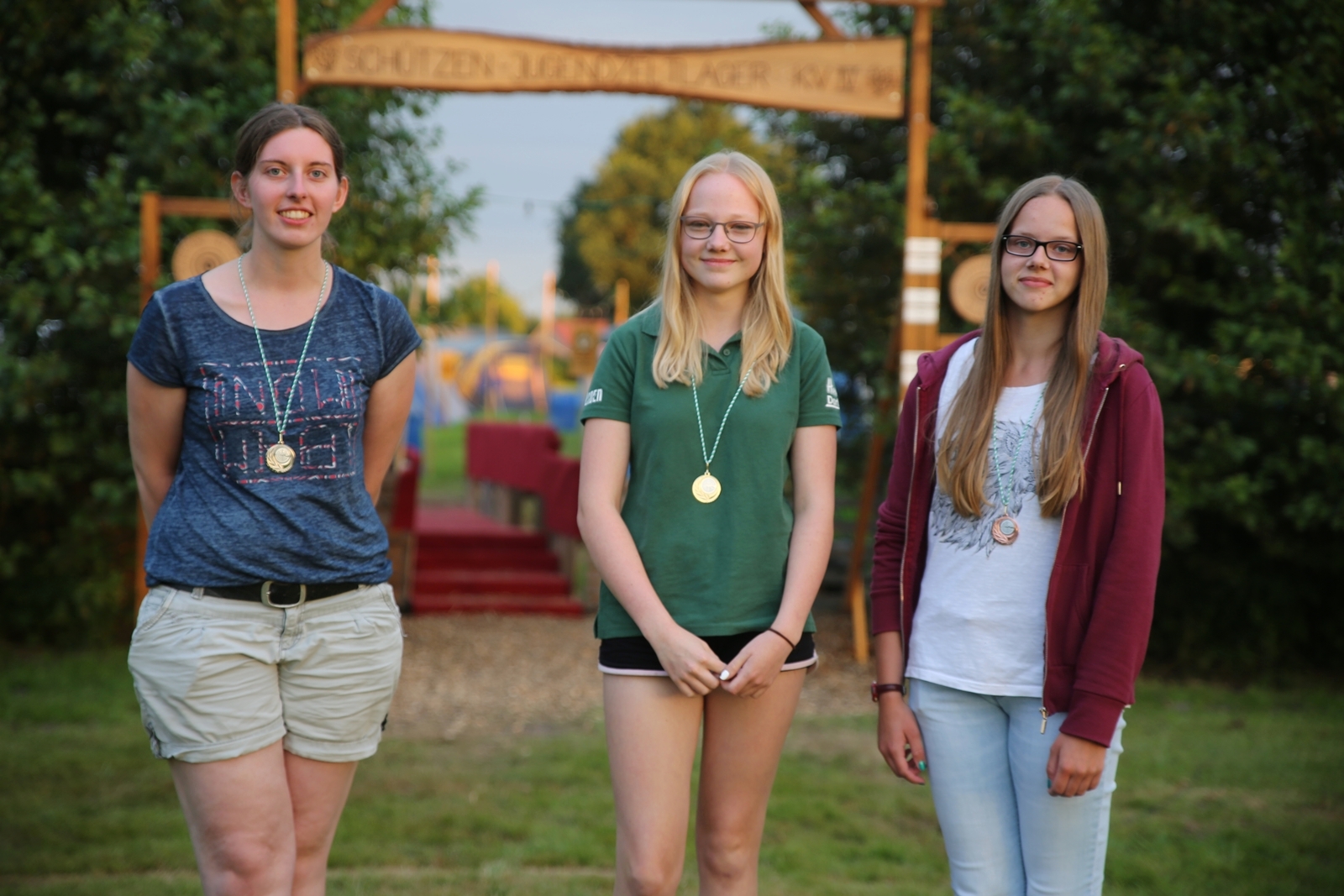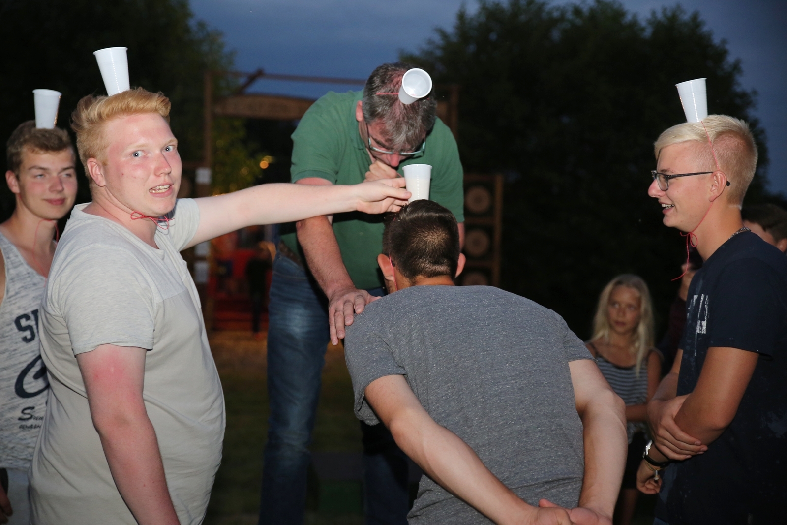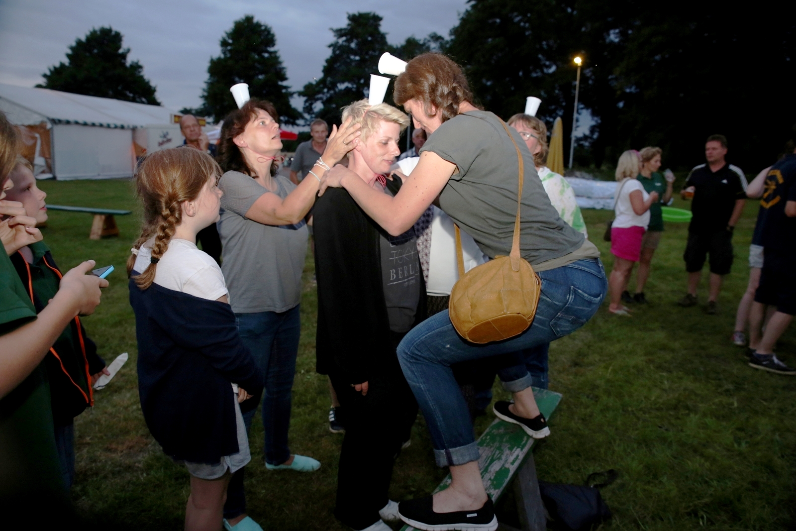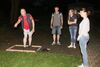 Am ersten Tag fand nach dem Zeltaufbau die Begrüßung durch Kreispräsident Gerd Griffel und Präsident des gastgebenden Kriegerschützenvereins Heiko Meyer statt. Stellvertretender Kreispräsident Bernd Dammeier und Bogenreferent Jürgen Vogt machten durch Anbringung einer Plakate an die Eingangspforte die Eröffnung offiziell. Im Anschluss an die Begrüßung stand das Abendessen und eine ca. 3,5 km lange Dorfrallye auf dem Programm. Verschiedene Wettbewerbe standen dabei natürlich auf dem Programm, so dass der Spaß vor allem im Vordergrund stand. So gab es für die Mannschaften sehr tolle Aufgaben zu bewältigen zum Beispiel "Tischtennisblasen", "Weckglasgummischießen", Holzfiguren mussten mit einem Tennisball umgekippt werden oder möglichst schnell einen Golfball durch einen Feuerwehrschlauch "bugsieren", beim Bocciaspiel möglichst dicht mit den Kugeln an eine Markierung werfen, zwischendurch mussten gemeinschaftlich viele spezielle Fragen beantwortet werden. Bei diesen Spielen am Abend sicherte sich das Team Strange-Buchhorst 4 (109 Punkte)den Sieg vor dem Team Strange-Buchhorst 1 (106 Punkte), gefolgt vom Team des KSV Ströhen 2 (98 Punkte). Nicht zu vergessen die "Taufe" von Miriam Tacke vom KSV Ströhen! Mit voller "Montur" wurde sie kurzerhand ins erfrischende Wasser des "Strohpools" geworfen. So ging mit viel Spaß dieser erste ereignisreiche Tag zu Ende.