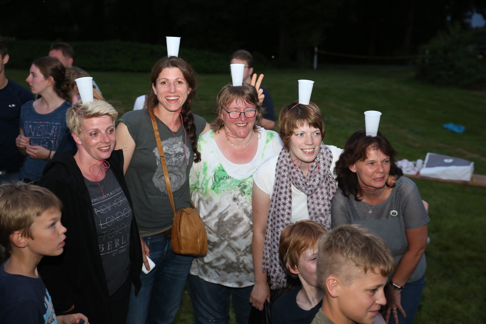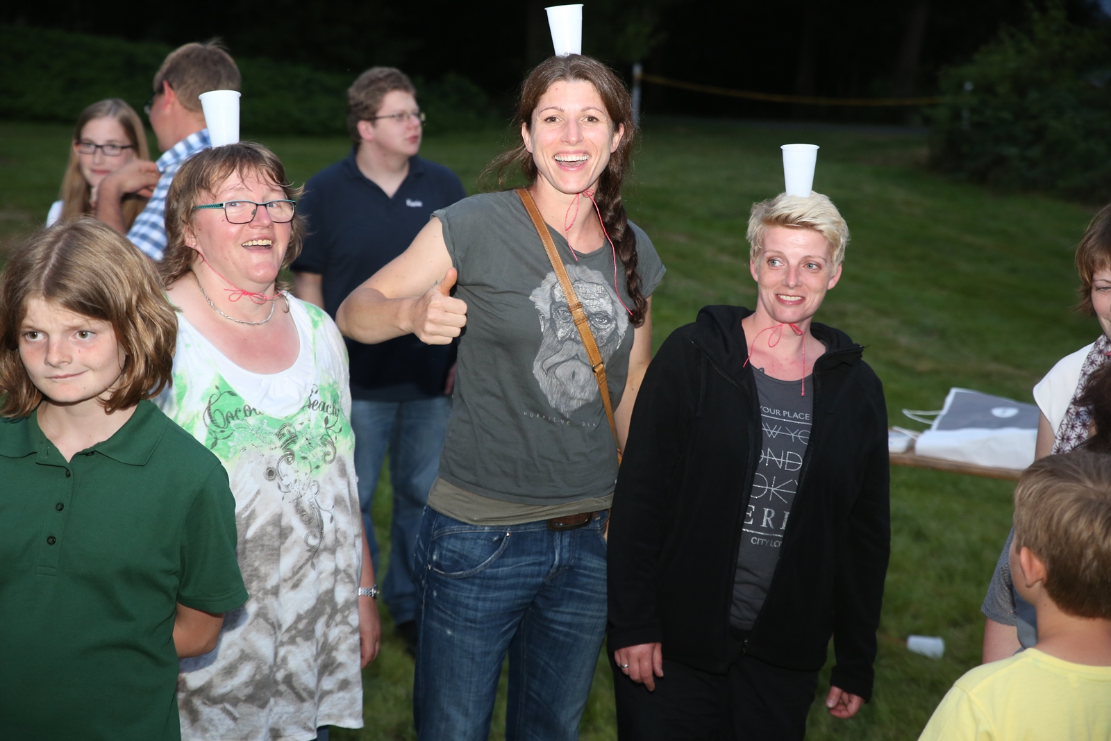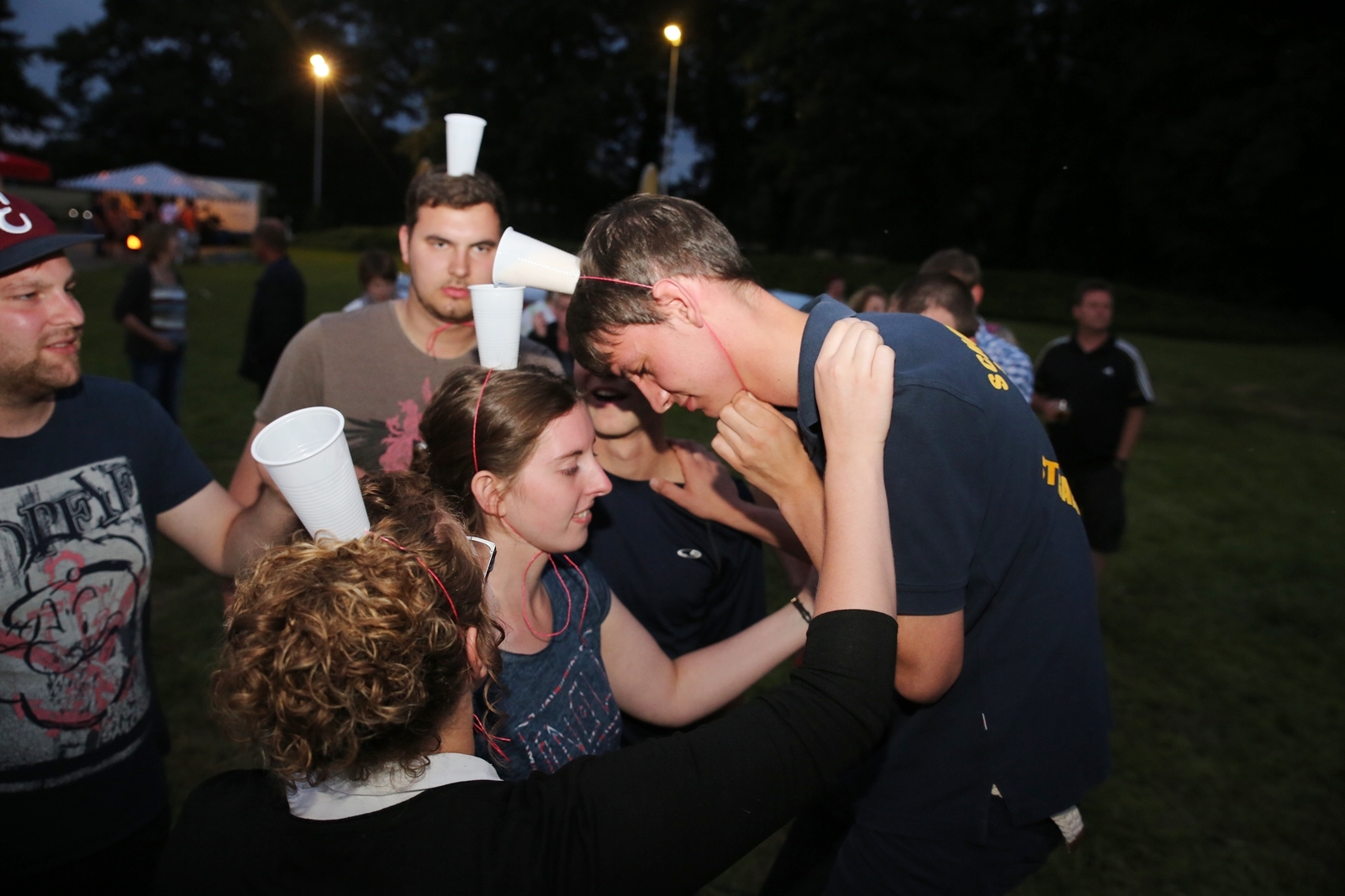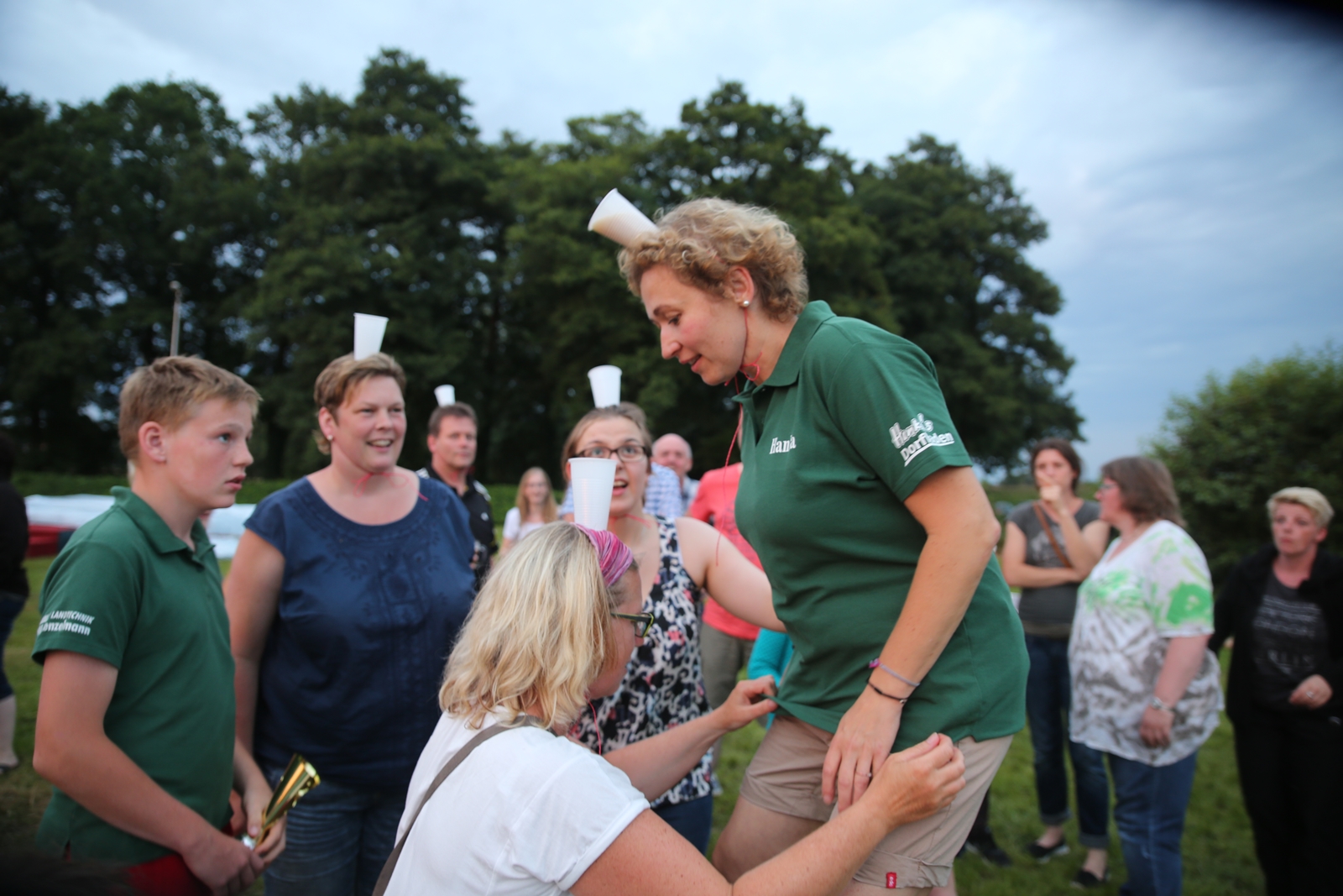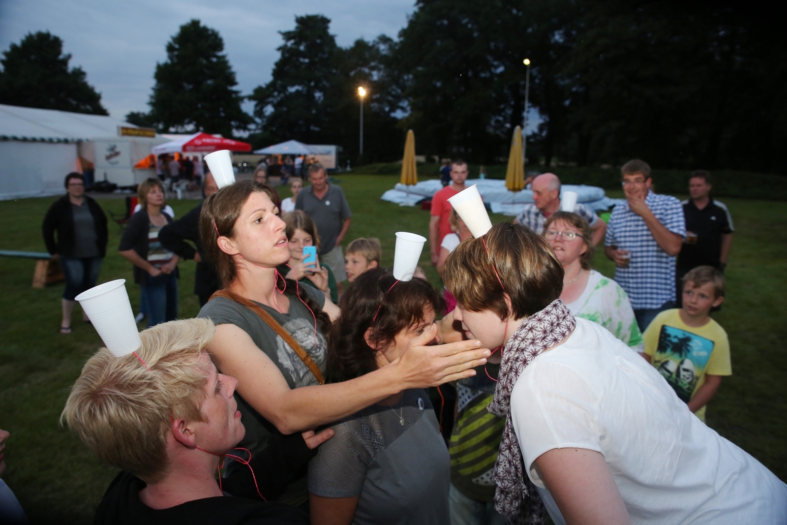 Am ersten Tag fand nach dem Zeltaufbau die Begrüßung durch Kreispräsident Gerd Griffel und Präsident des gastgebenden Kriegerschützenvereins Heiko Meyer statt. Stellvertretender Kreispräsident Bernd Dammeier und Bogenreferent Jürgen Vogt machten durch Anbringung einer Plakate an die Eingangspforte die Eröffnung offiziell. Im Anschluss an die Begrüßung stand das Abendessen und eine ca. 3,5 km lange Dorfrallye auf dem Programm. Verschiedene Wettbewerbe standen dabei natürlich auf dem Programm, so dass der Spaß vor allem im Vordergrund stand. So gab es für die Mannschaften sehr tolle Aufgaben zu bewältigen zum Beispiel "Tischtennisblasen", "Weckglasgummischießen", Holzfiguren mussten mit einem Tennisball umgekippt werden oder möglichst schnell einen Golfball durch einen Feuerwehrschlauch "bugsieren", beim Bocciaspiel möglichst dicht mit den Kugeln an eine Markierung werfen, zwischendurch mussten gemeinschaftlich viele spezielle Fragen beantwortet werden. Bei diesen Spielen am Abend sicherte sich das Team Strange-Buchhorst 4 (109 Punkte)den Sieg vor dem Team Strange-Buchhorst 1 (106 Punkte), gefolgt vom Team des KSV Ströhen 2 (98 Punkte). Nicht zu vergessen die "Taufe" von Miriam Tacke vom KSV Ströhen! Mit voller "Montur" wurde sie kurzerhand ins erfrischende Wasser des "Strohpools" geworfen. So ging mit viel Spaß dieser erste ereignisreiche Tag zu Ende.