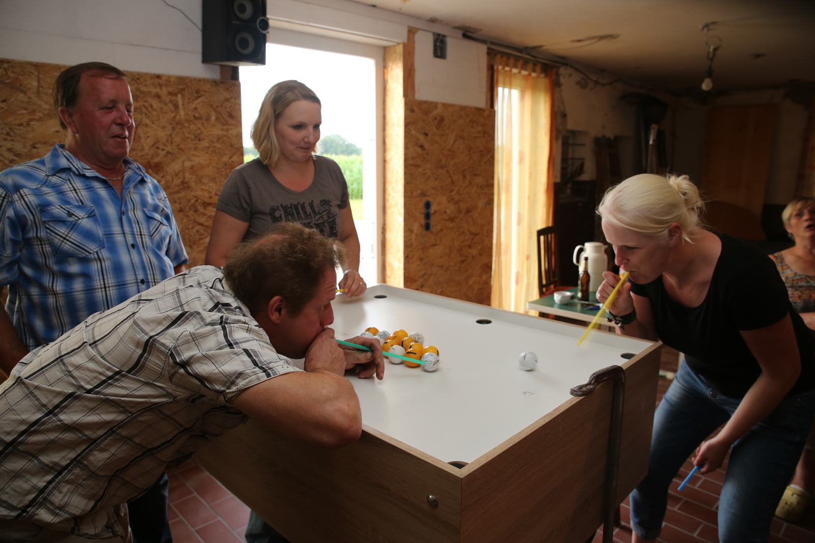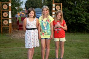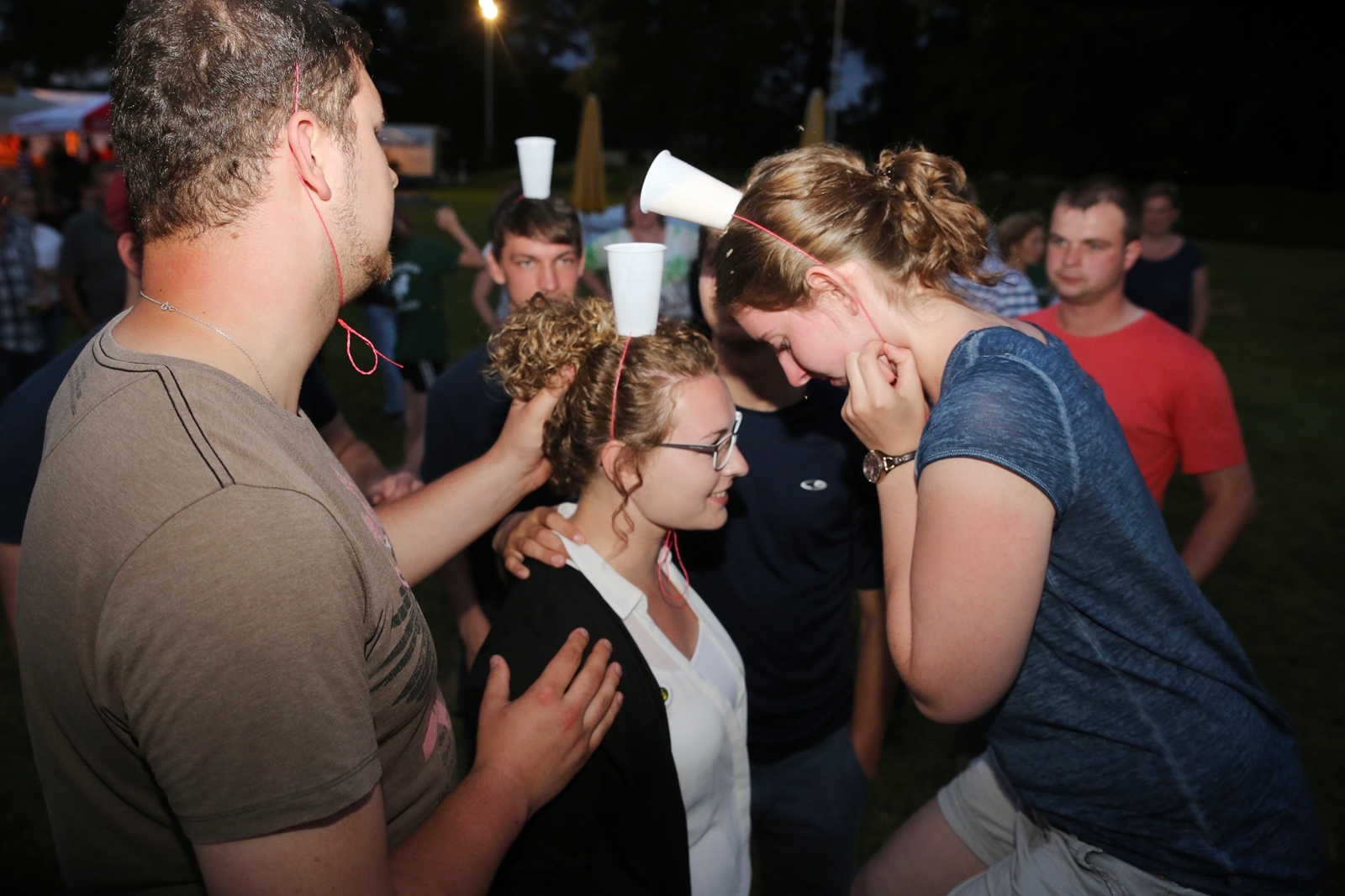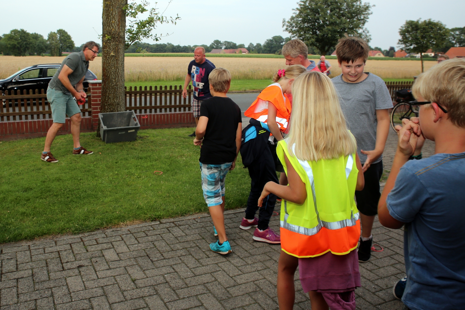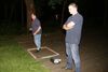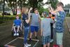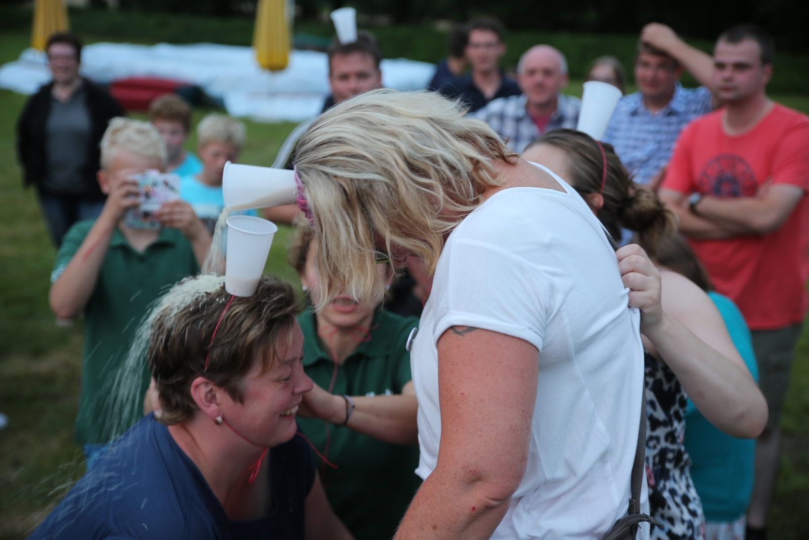 Am ersten Tag fand nach dem Zeltaufbau die Begrüßung durch Kreispräsident Gerd Griffel und Präsident des gastgebenden Kriegerschützenvereins Heiko Meyer statt. Stellvertretender Kreispräsident Bernd Dammeier und Bogenreferent Jürgen Vogt machten durch Anbringung einer Plakate an die Eingangspforte die Eröffnung offiziell. Im Anschluss an die Begrüßung stand das Abendessen und eine ca. 3,5 km lange Dorfrallye auf dem Programm. Verschiedene Wettbewerbe standen dabei natürlich auf dem Programm, so dass der Spaß vor allem im Vordergrund stand. So gab es für die Mannschaften sehr tolle Aufgaben zu bewältigen zum Beispiel "Tischtennisblasen", "Weckglasgummischießen", Holzfiguren mussten mit einem Tennisball umgekippt werden oder möglichst schnell einen Golfball durch einen Feuerwehrschlauch "bugsieren", beim Bocciaspiel möglichst dicht mit den Kugeln an eine Markierung werfen, zwischendurch mussten gemeinschaftlich viele spezielle Fragen beantwortet werden. Bei diesen Spielen am Abend sicherte sich das Team Strange-Buchhorst 4 (109 Punkte)den Sieg vor dem Team Strange-Buchhorst 1 (106 Punkte), gefolgt vom Team des KSV Ströhen 2 (98 Punkte). Nicht zu vergessen die "Taufe" von Miriam Tacke vom KSV Ströhen! Mit voller "Montur" wurde sie kurzerhand ins erfrischende Wasser des "Strohpools" geworfen. So ging mit viel Spaß dieser erste ereignisreiche Tag zu Ende.