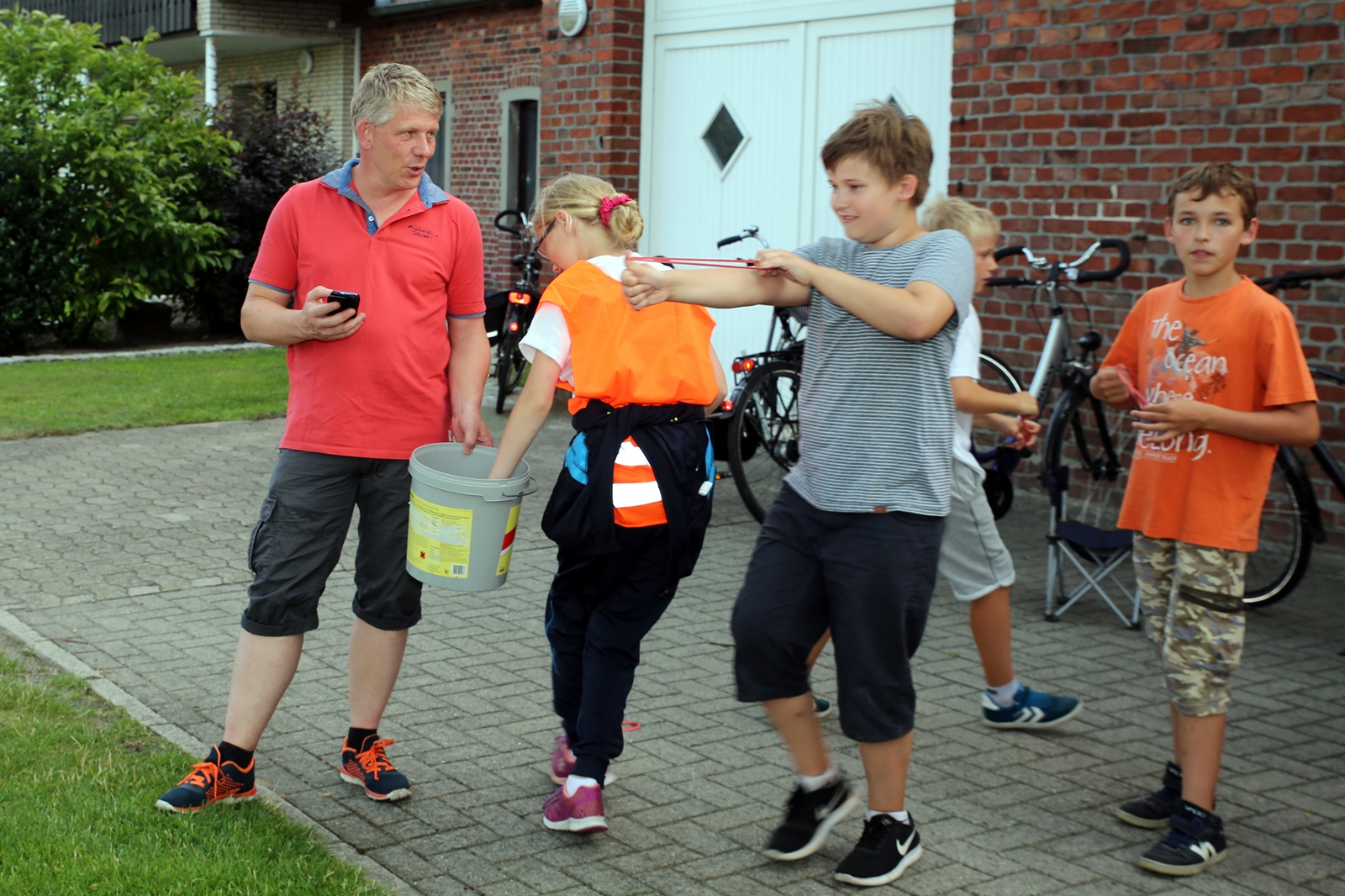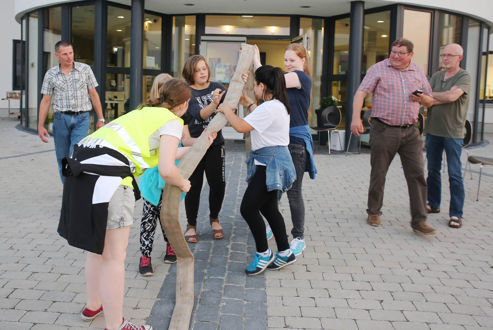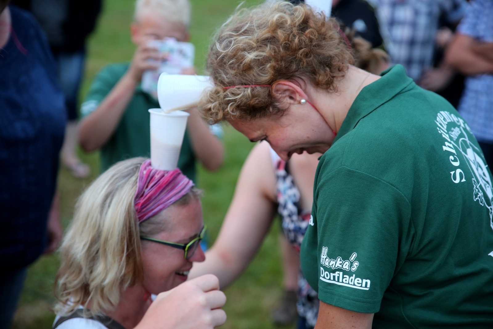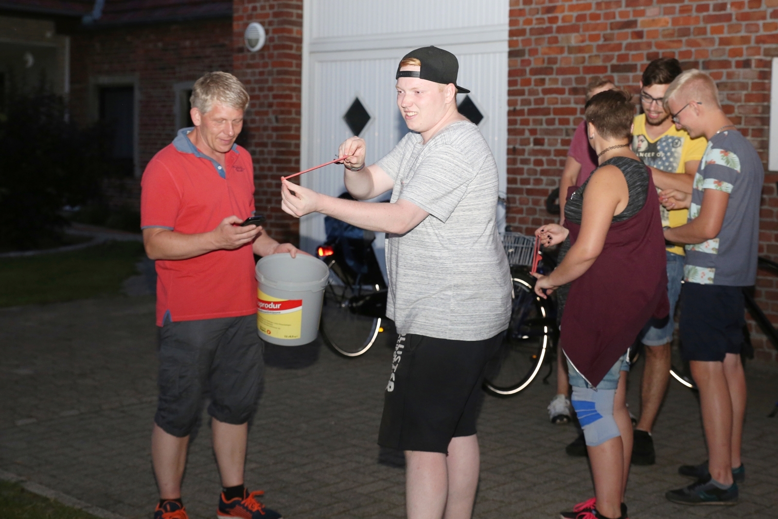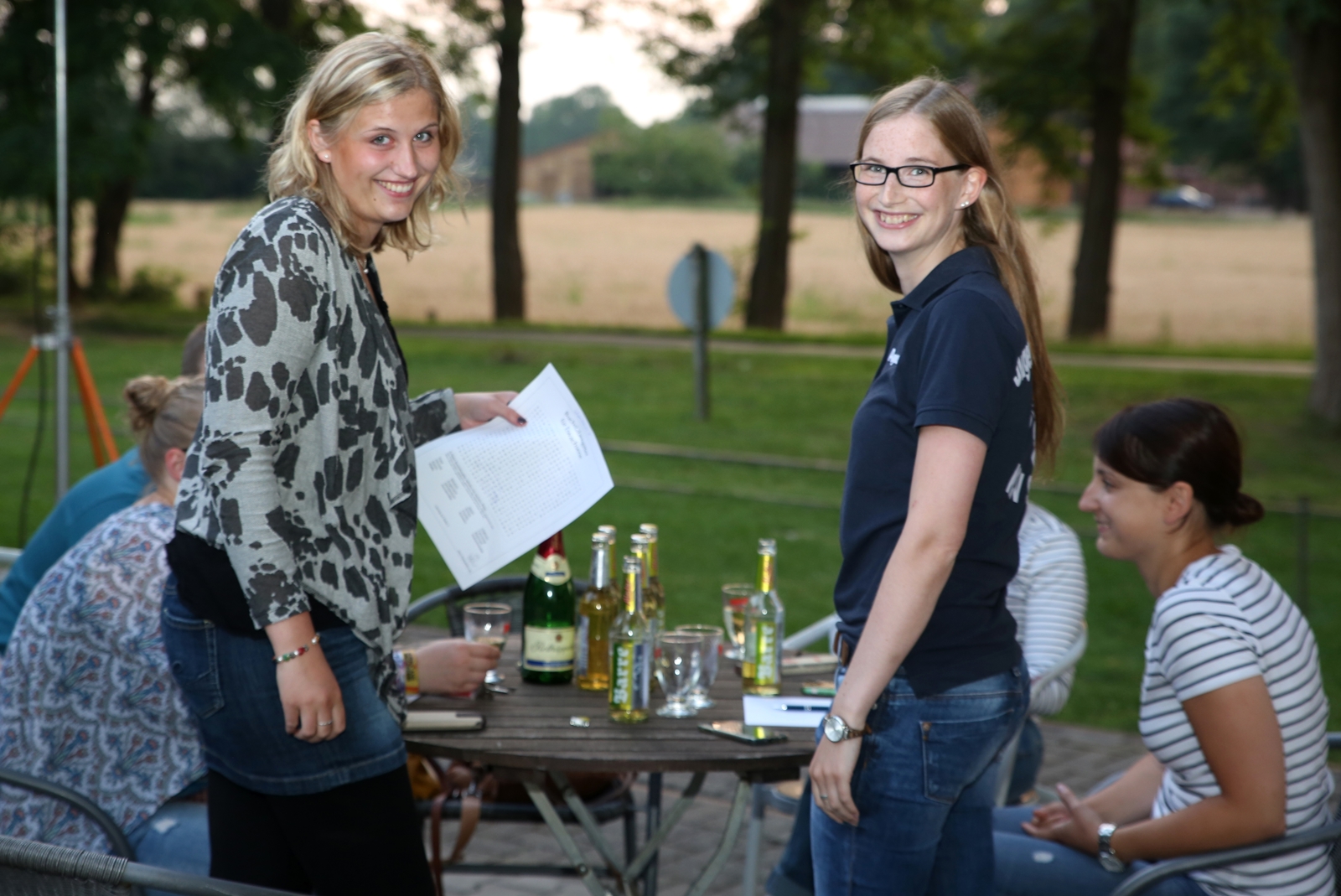 Am ersten Tag fand nach dem Zeltaufbau die Begrüßung durch Kreispräsident Gerd Griffel und Präsident des gastgebenden Kriegerschützenvereins Heiko Meyer statt. Stellvertretender Kreispräsident Bernd Dammeier und Bogenreferent Jürgen Vogt machten durch Anbringung einer Plakate an die Eingangspforte die Eröffnung offiziell. Im Anschluss an die Begrüßung stand das Abendessen und eine ca. 3,5 km lange Dorfrallye auf dem Programm. Verschiedene Wettbewerbe standen dabei natürlich auf dem Programm, so dass der Spaß vor allem im Vordergrund stand. So gab es für die Mannschaften sehr tolle Aufgaben zu bewältigen zum Beispiel "Tischtennisblasen", "Weckglasgummischießen", Holzfiguren mussten mit einem Tennisball umgekippt werden oder möglichst schnell einen Golfball durch einen Feuerwehrschlauch "bugsieren", beim Bocciaspiel möglichst dicht mit den Kugeln an eine Markierung werfen, zwischendurch mussten gemeinschaftlich viele spezielle Fragen beantwortet werden. Bei diesen Spielen am Abend sicherte sich das Team Strange-Buchhorst 4 (109 Punkte)den Sieg vor dem Team Strange-Buchhorst 1 (106 Punkte), gefolgt vom Team des KSV Ströhen 2 (98 Punkte). Nicht zu vergessen die "Taufe" von Miriam Tacke vom KSV Ströhen! Mit voller "Montur" wurde sie kurzerhand ins erfrischende Wasser des "Strohpools" geworfen. So ging mit viel Spaß dieser erste ereignisreiche Tag zu Ende.