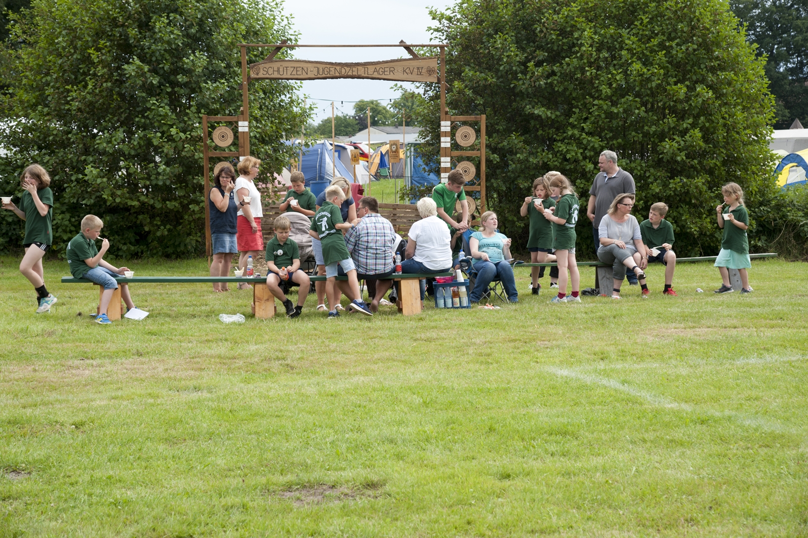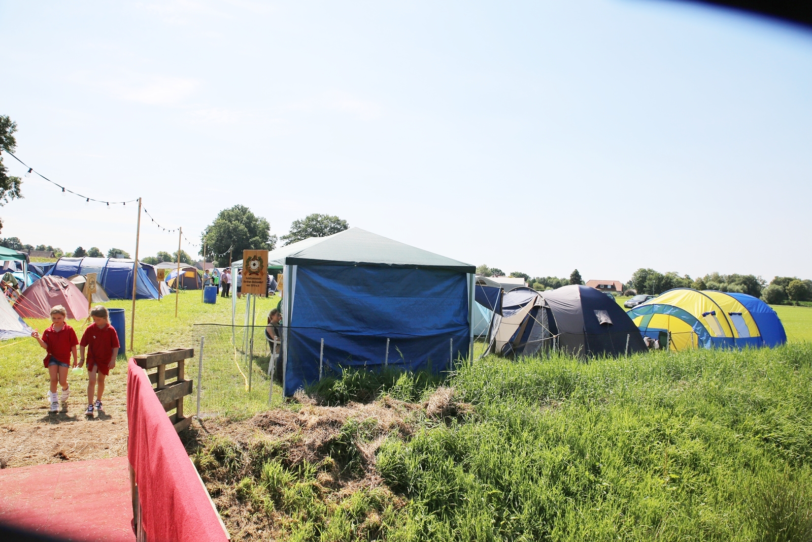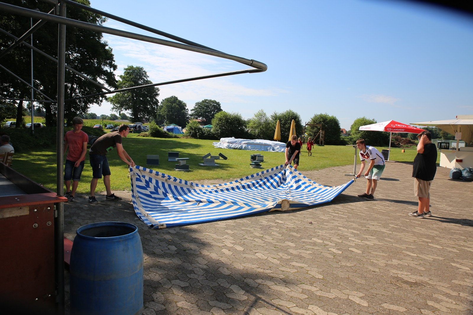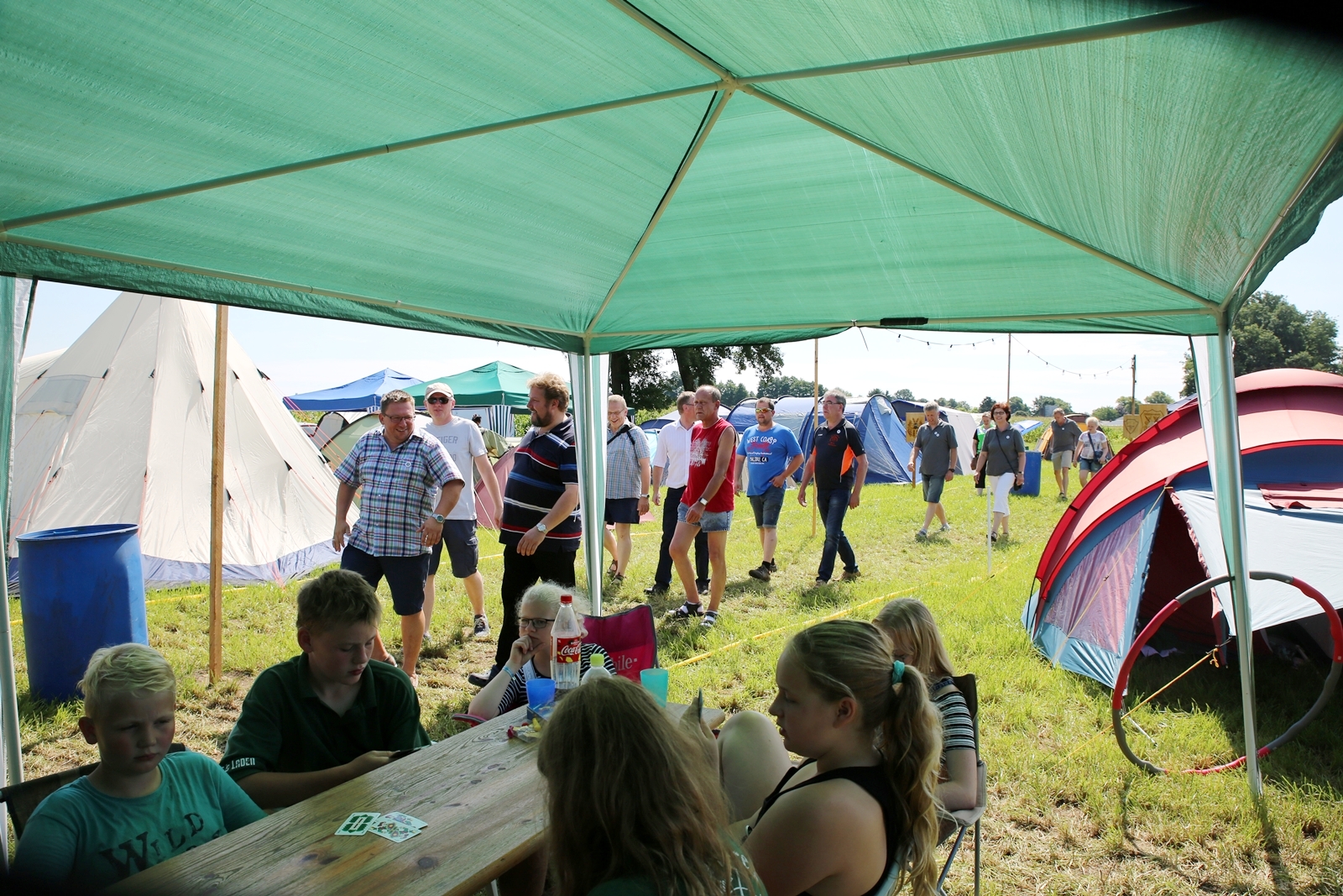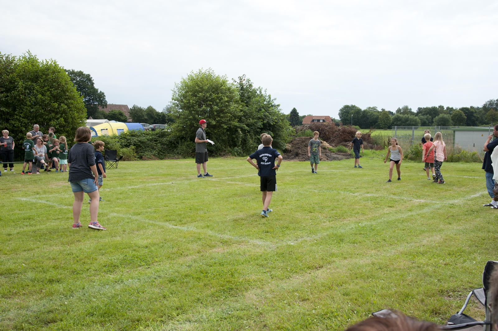 Der Freitagnachmittag stand im Zeichen der Anreise und des Zeltaufbaus beim Schießstand des KSV Ströhen, allerdings auf einem Nebenplatz, den ein Landwirt zur Verfügung gestellt hatte. So stand auf dem eigentlichen Schützenplatz genügend Raum zur Verfügung für ein großes Ess-Zelt, Umkleide- und Waschmöglichkeiten, verschiedene Spiel-Parcours sowie ein Pool-Becken, dass bei den teilweise tropischen Temperaturen zum Abkühlen einlud.